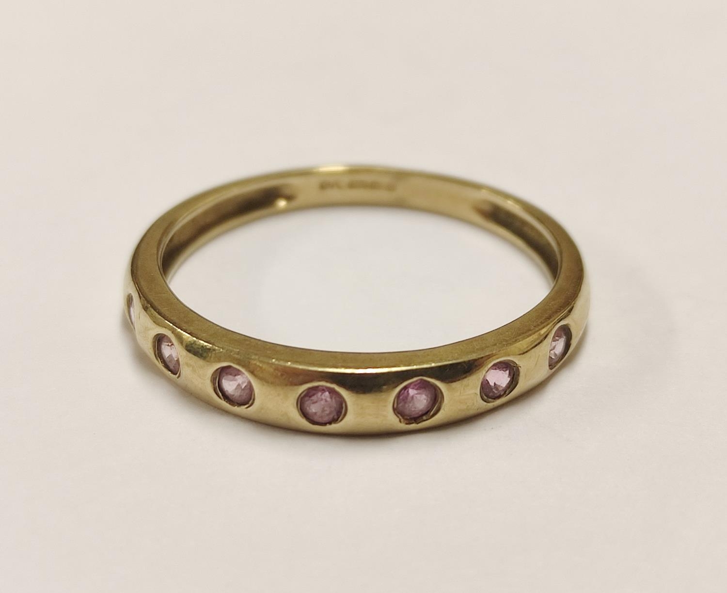 9ct gold ring set with pink stones, 1.8g gross.