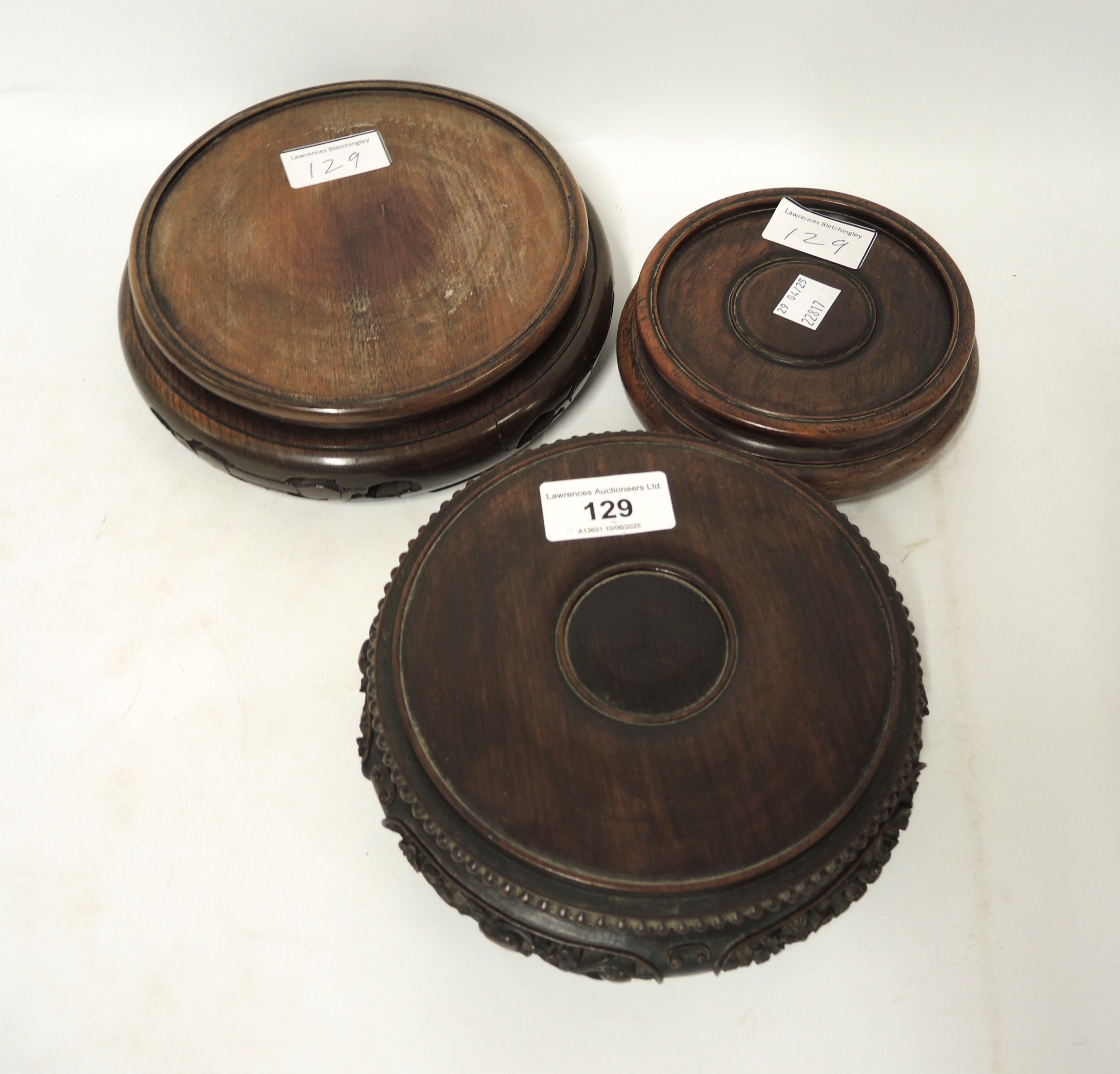 Good quality Chinese carved hardwood and pierced circular vase stand, 17cm diameter, together with two Chinese hardwood turned wooden vase stands