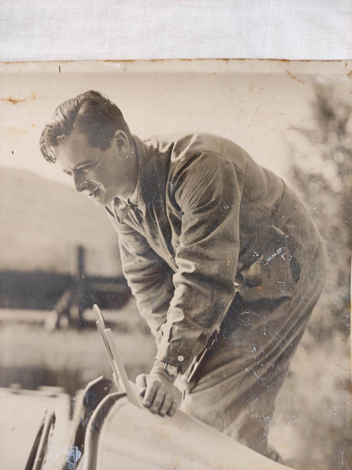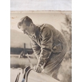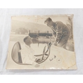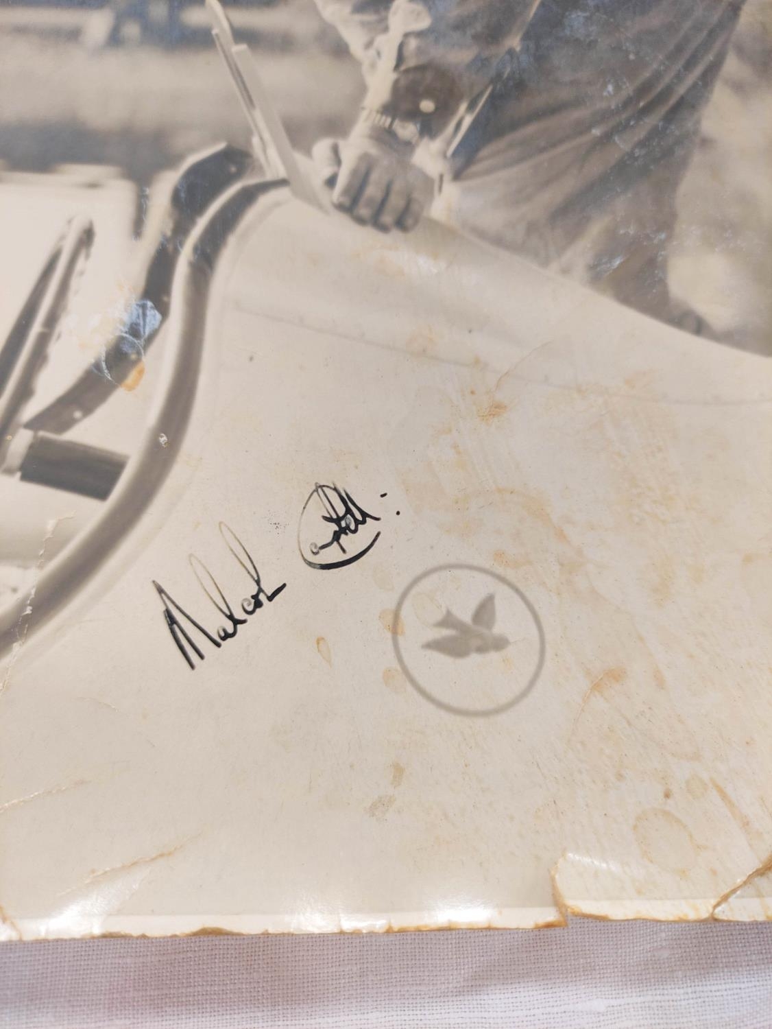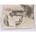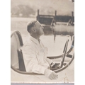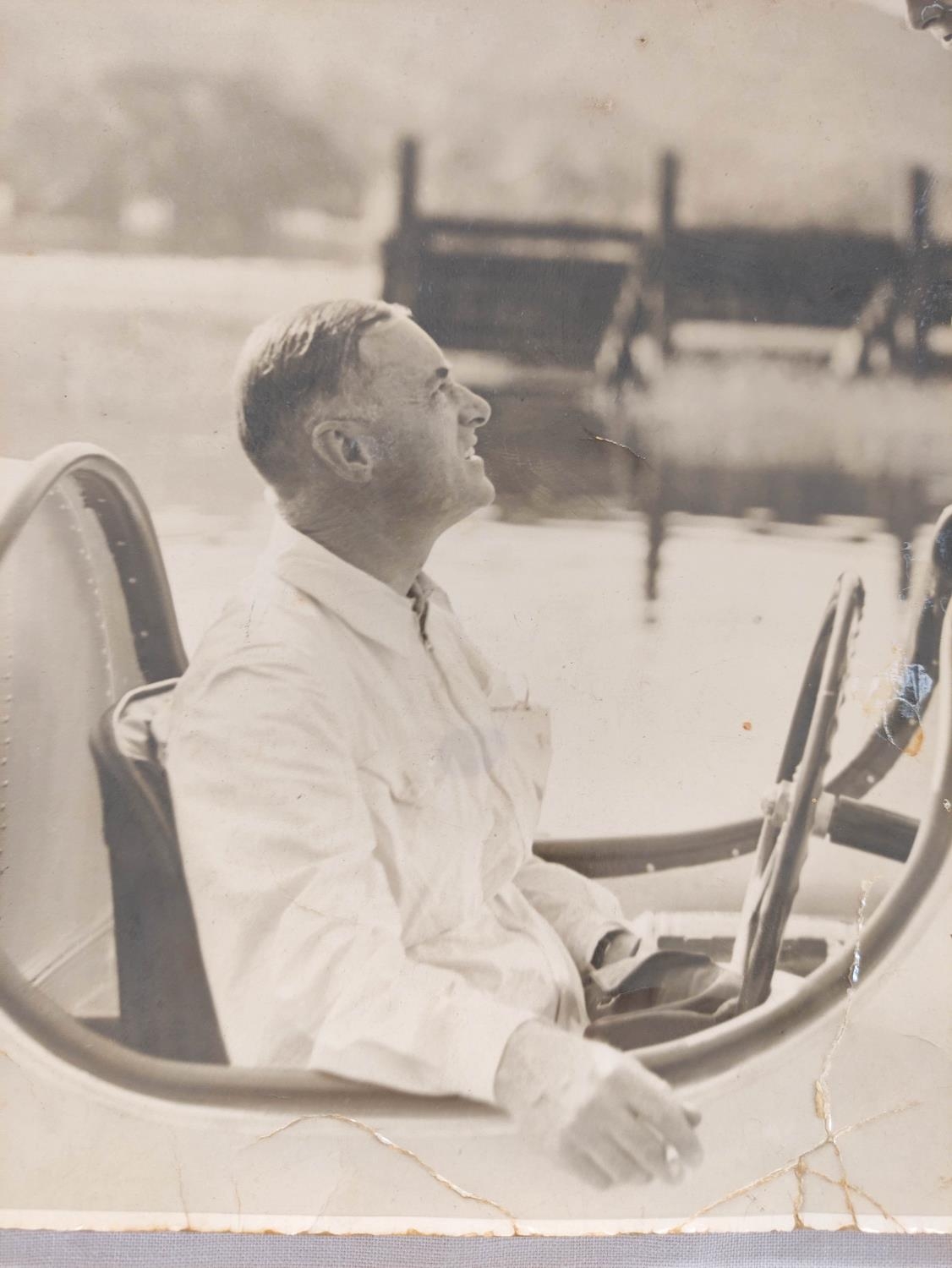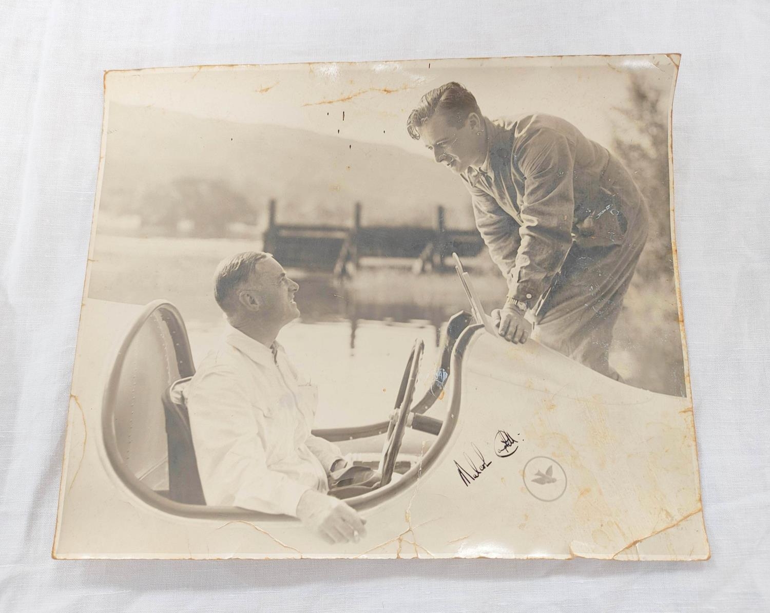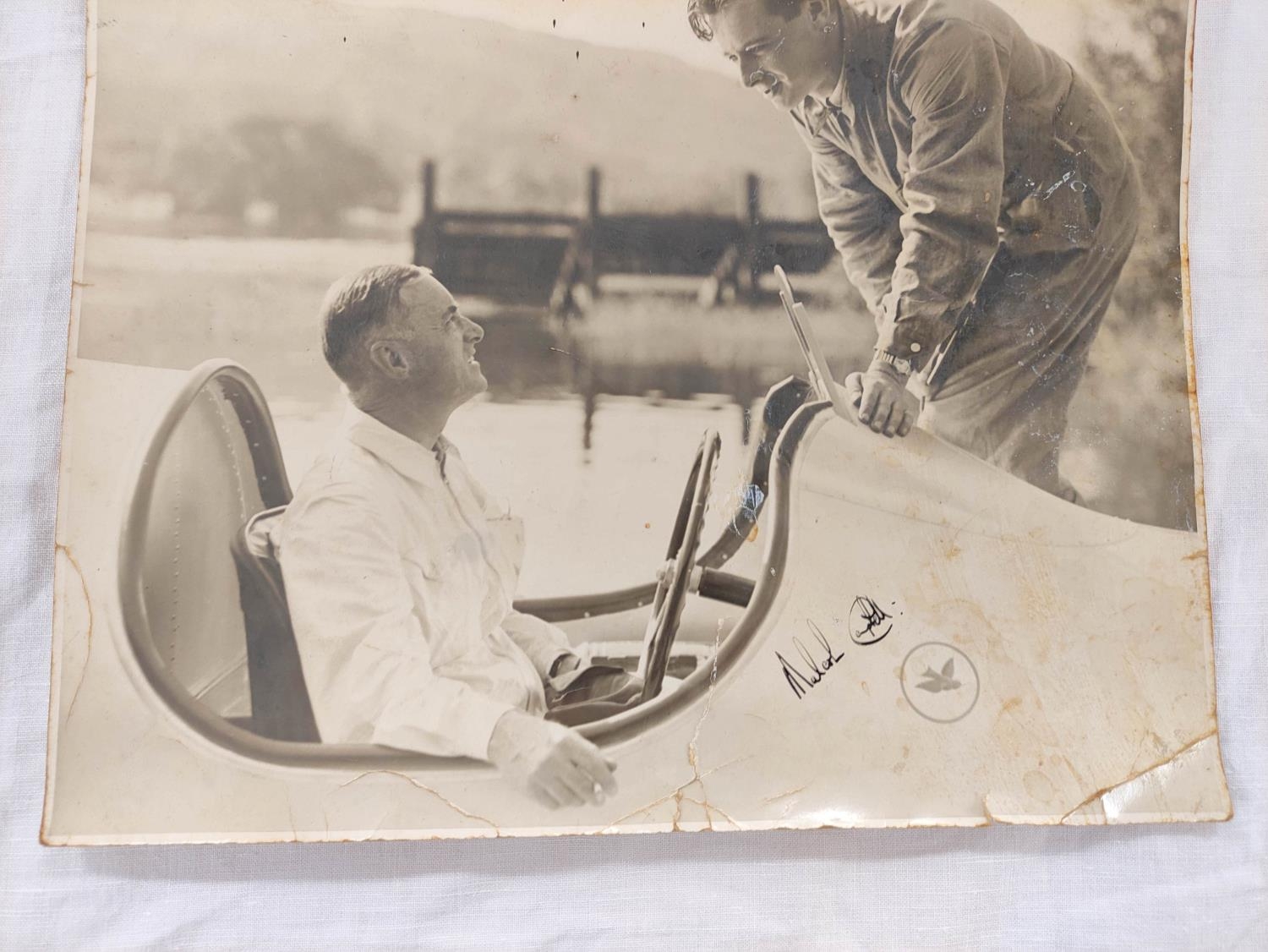 Sir Malcolm Campbell (1885-1948). Signed 30x25cm photograph of motor racing legend Sir Malcolm Campbell in Bluebird K4 on Coniston Water with what is believed to be a young Donald Campbell in conversation.