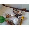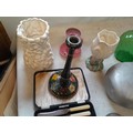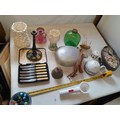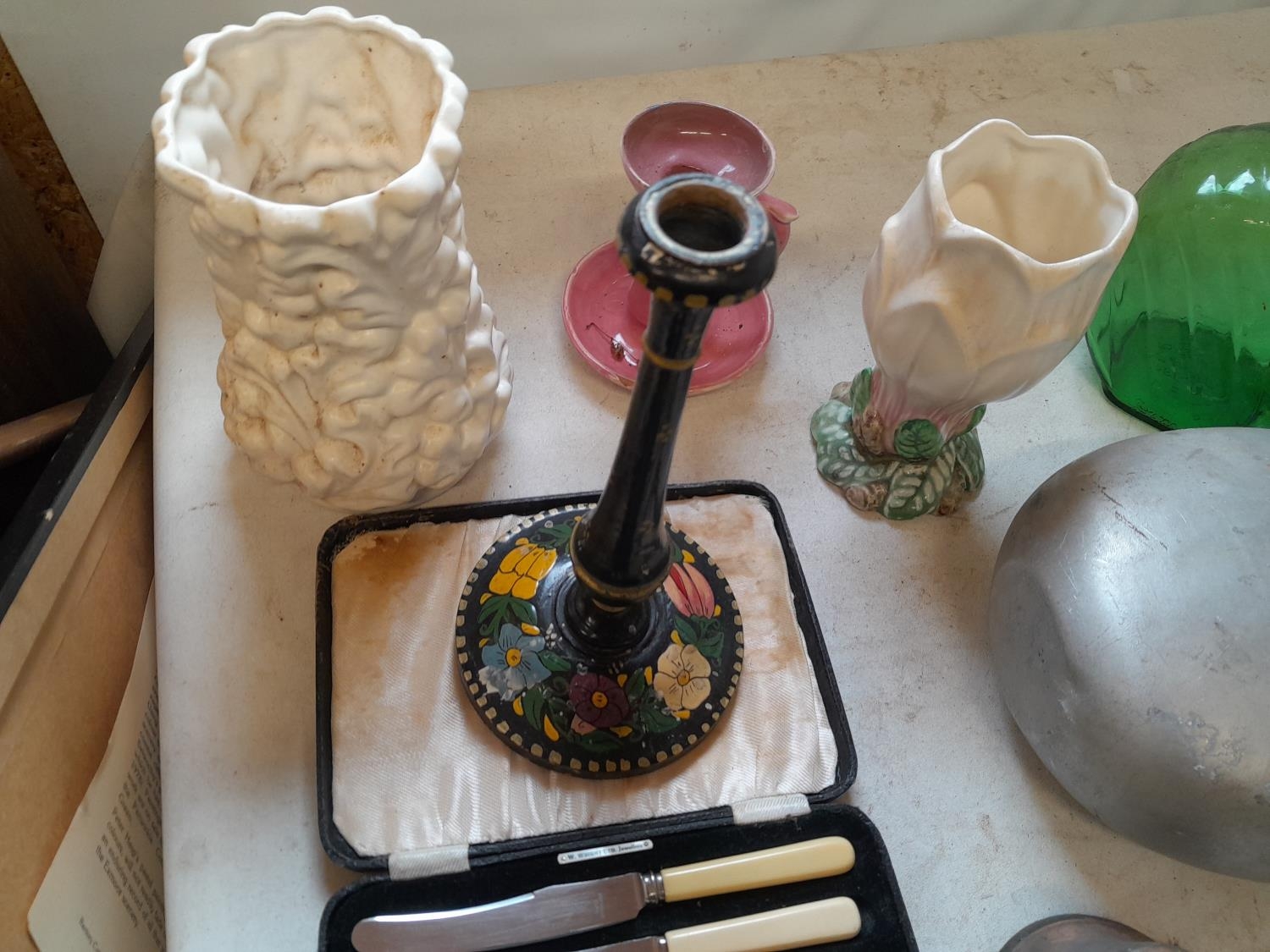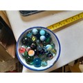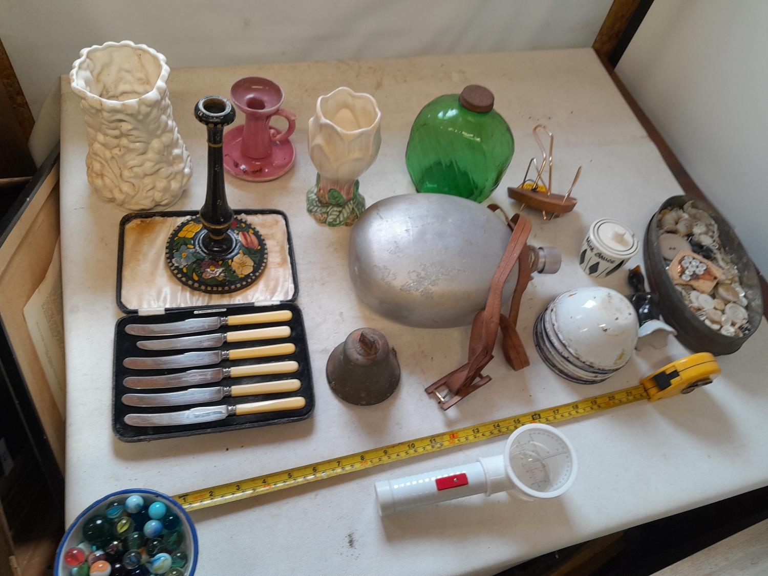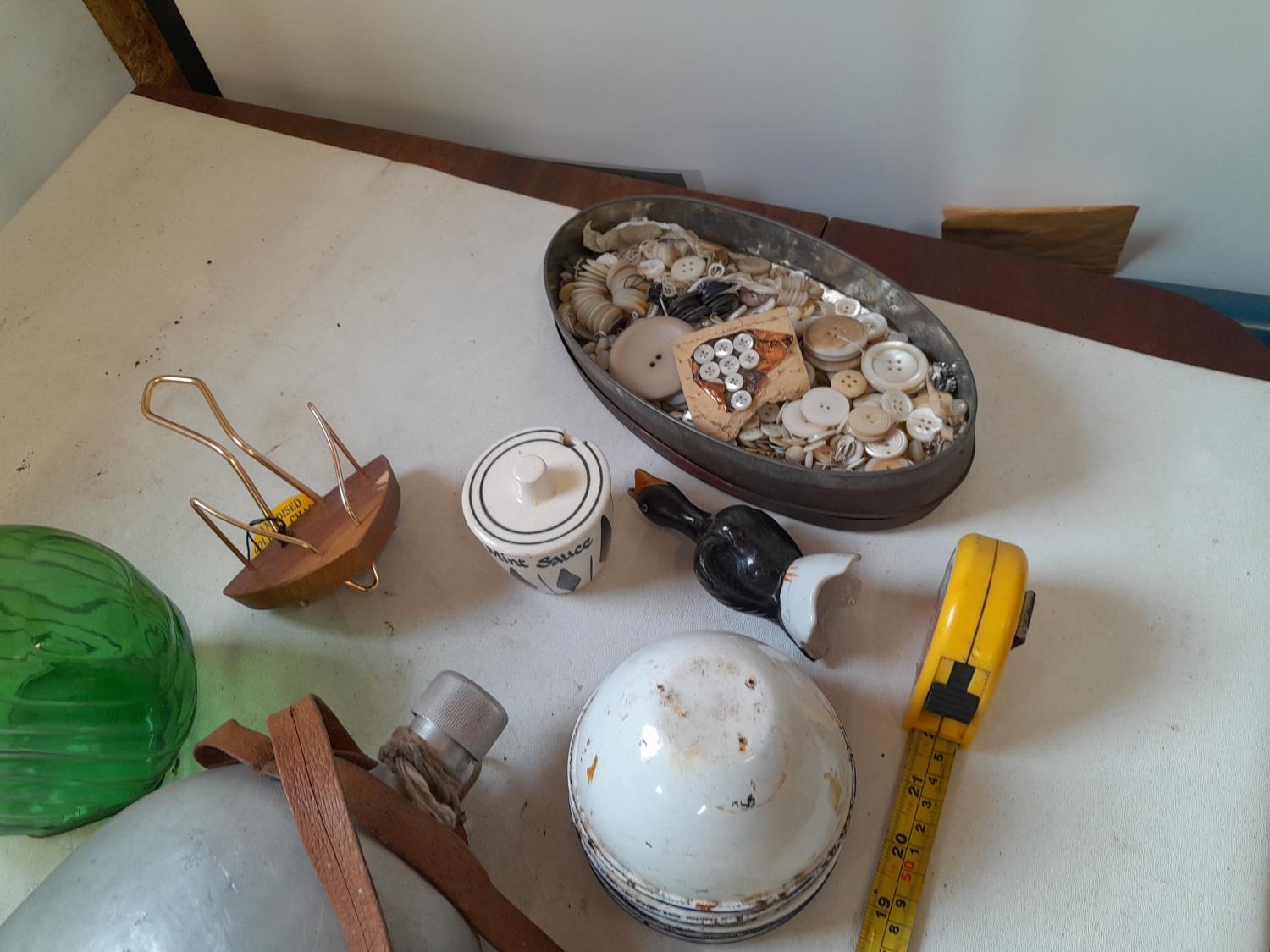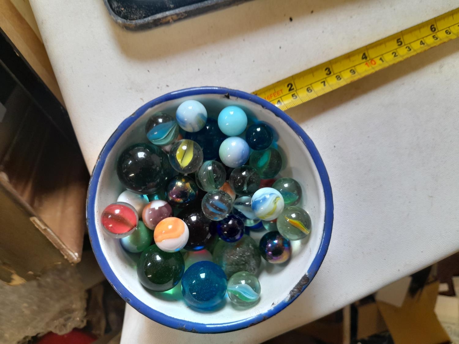Box of oddments : vintage blue and white enamel pots, marbles, pokerwork candlestick, plated ware china , buttons etc.