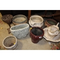 A COLLECTION OF MODERN STONEWARE PLANTERS AND VASES TO INCLUDE A VASE ON CAST METAL STAND, TOGETHER WITH A FLORAL JUG AND BOWL SET (8)