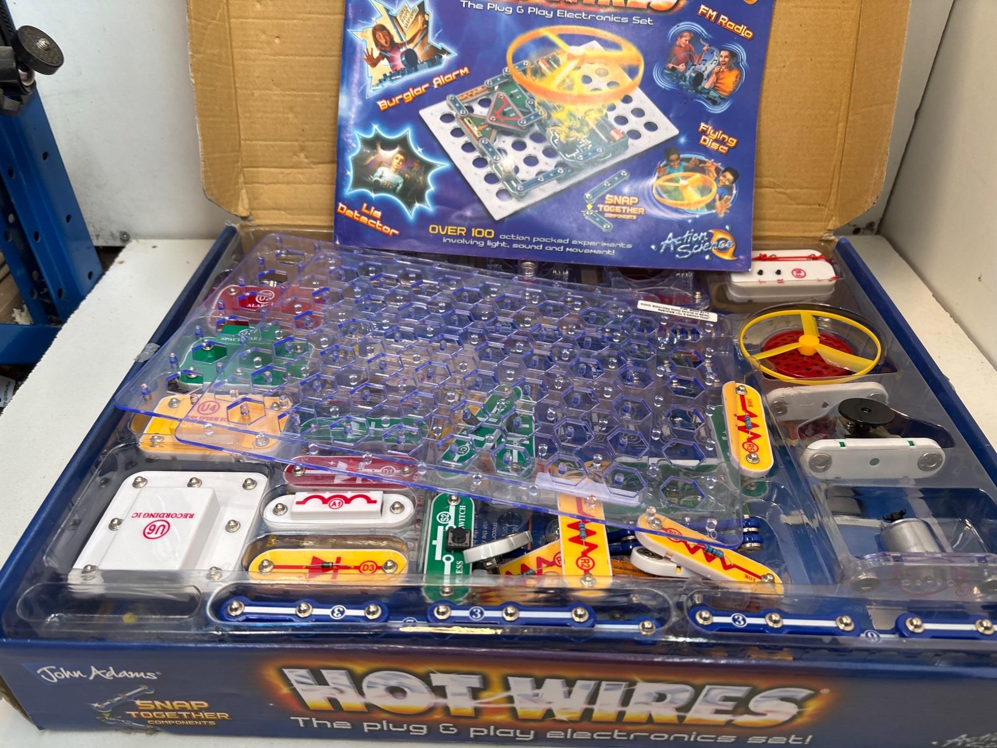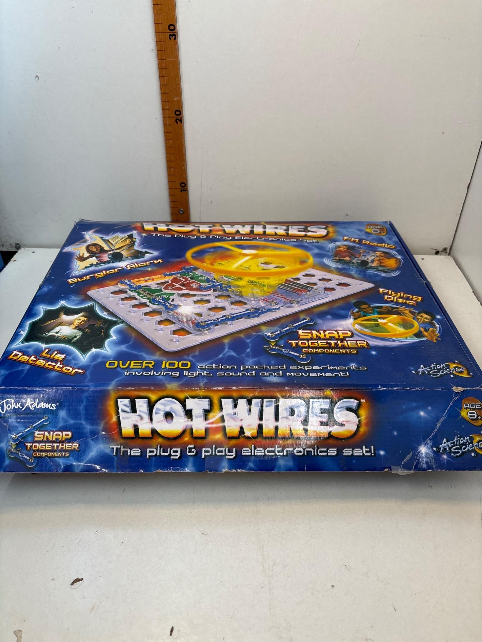 Hot Wires plug-and-play electronic set with original box. Includes components for over 100 action-packed experiments.