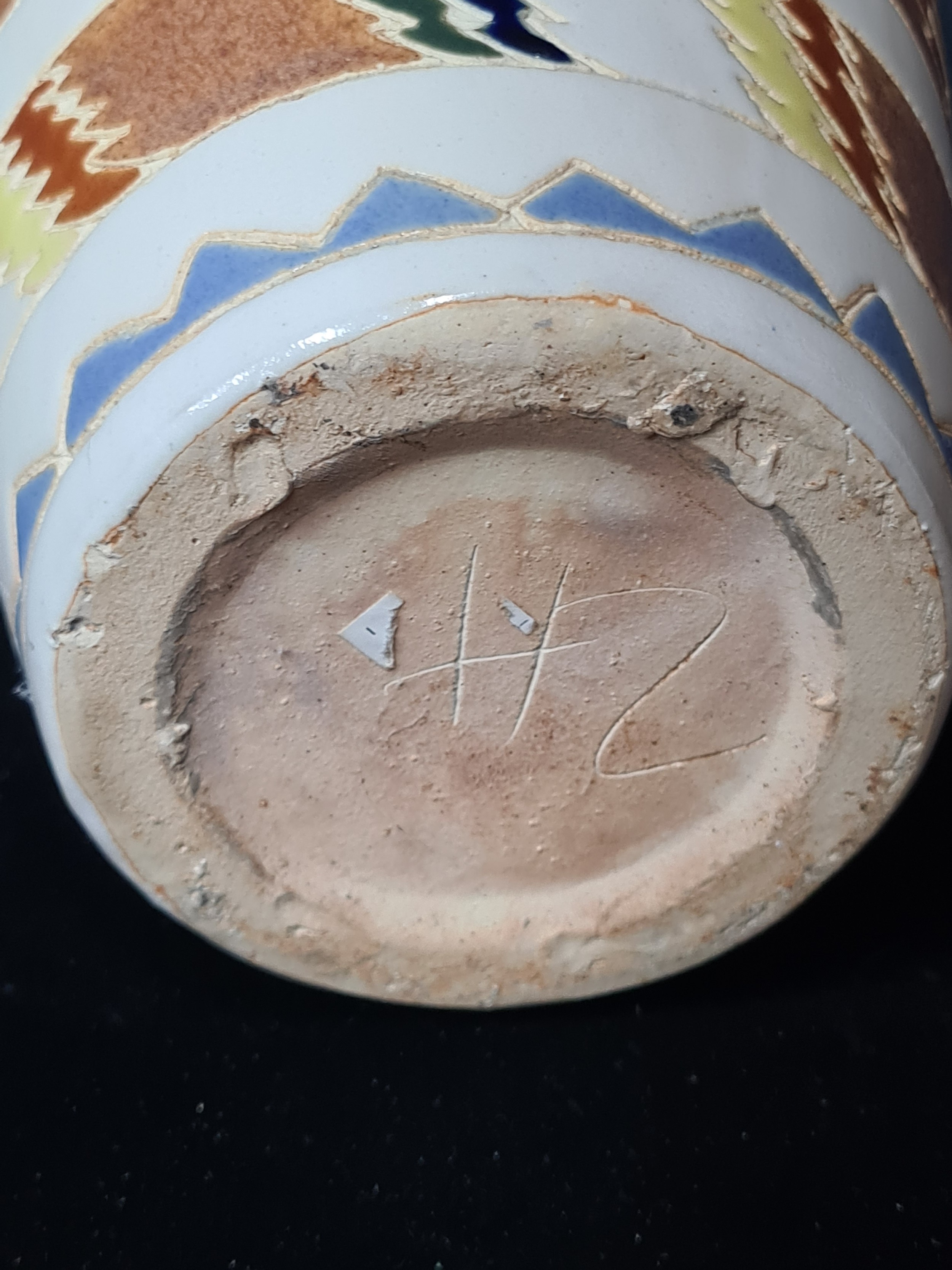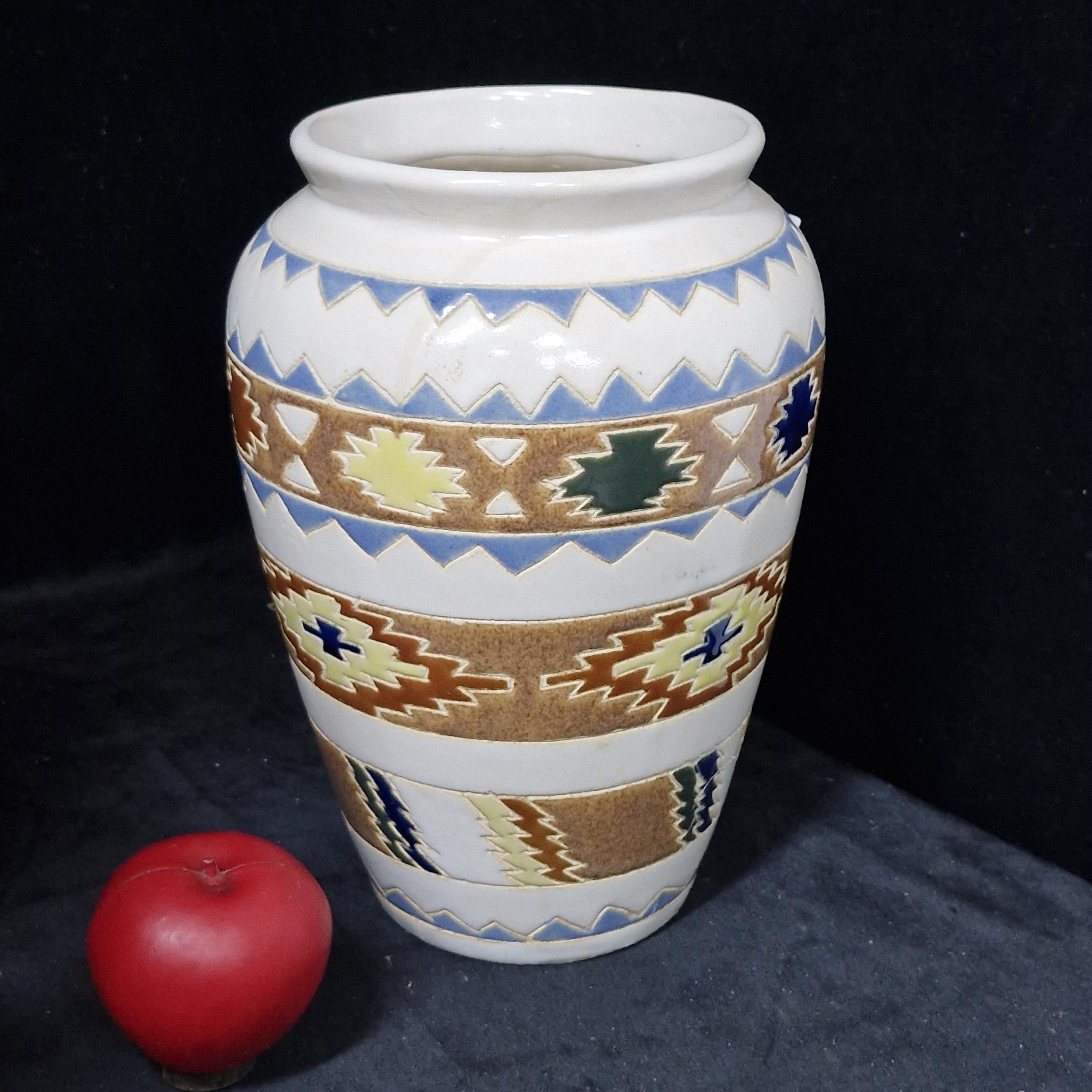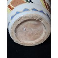 A beautiful and colourful Aztec style large earthenware art studio pottery vase. Signed indistinctly to base.