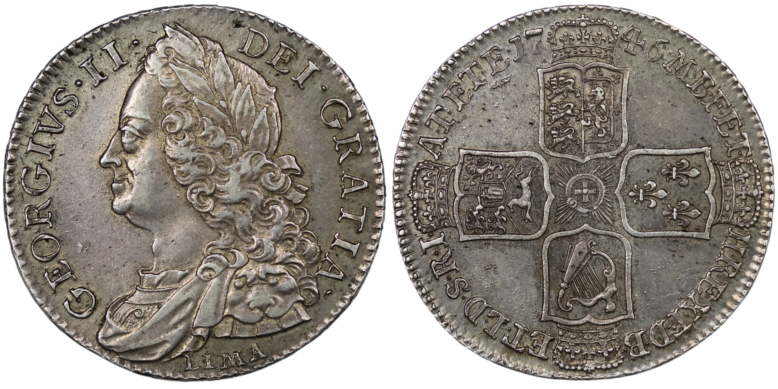 1746 LIMA Halfcrown, George II, edge DECIMO NONO. Obv. old laureate draped bust, LIMA below, V in GEORGIVS. Rev. with 8 strings in harp and just 6 hearts in Hanoverian Arms, the combination not recorded in Bull. VF, better in places with soft cabinet tone. [ESC 606, Bull 1688, S.3695A]