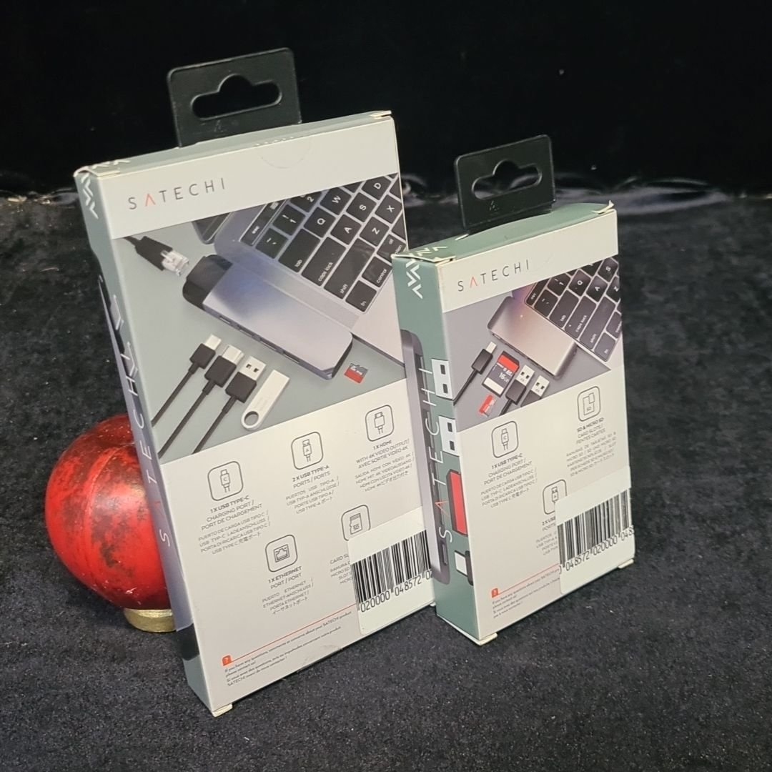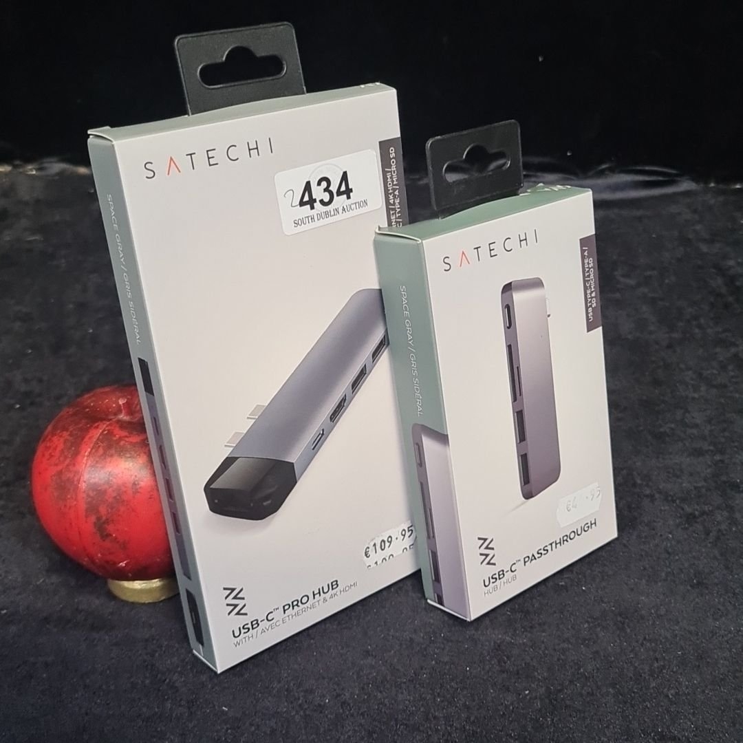 Satechi USB-C Pro Hub with Ethernet & HDMI RRP 109.95, Satechi USB-C Passthrough Hub RRP €44.95, both in original packaging.