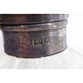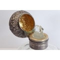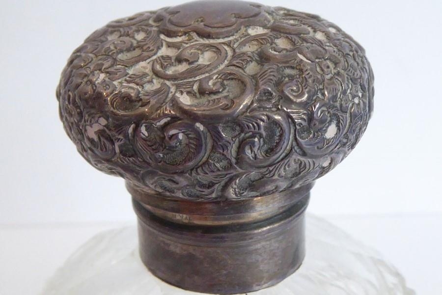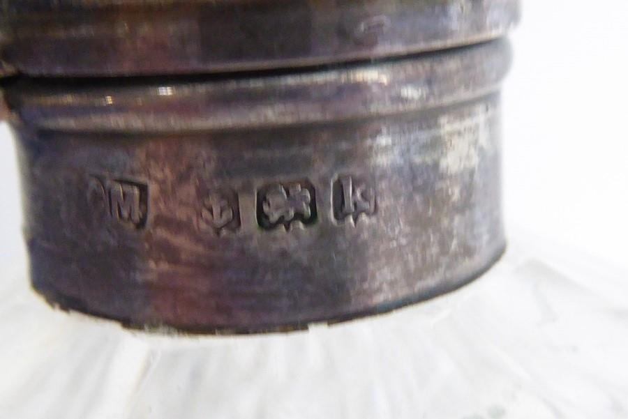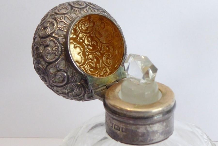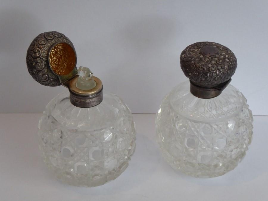 Condition Report: 1st scent has minor scratching to underside and bottom, stopper appears good and body good too - silver is dark and hallmarks legible. The 2nd scent is noted that there is an indentation to the top of the silver lid on the outside on one half, the stopper in good condition, the glass is scratched to the underside. No major problems or condition issues overall.