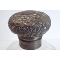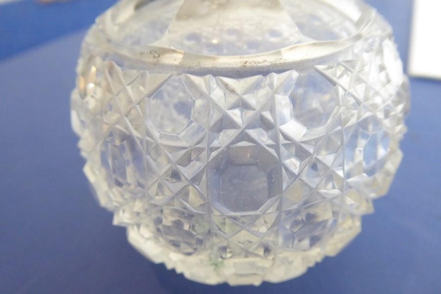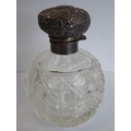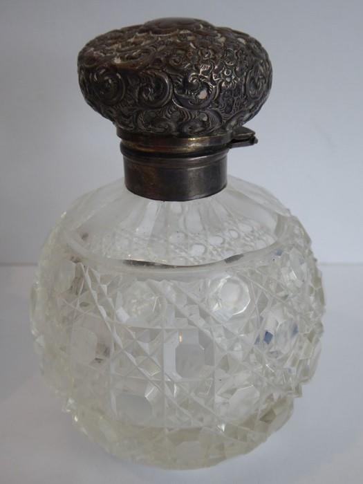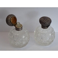 A pair of early 20th century spherical cut-glass silver-mounted scents; the hinged lids decorated in repoussé style with vacant cartouches and gilt interiors, the silver neck ferrules with maker's mark CM and assayed Birmingham 1909, small cut-glass stoppers, hobnail-cut bodies and star-cut bases (10cm high)