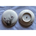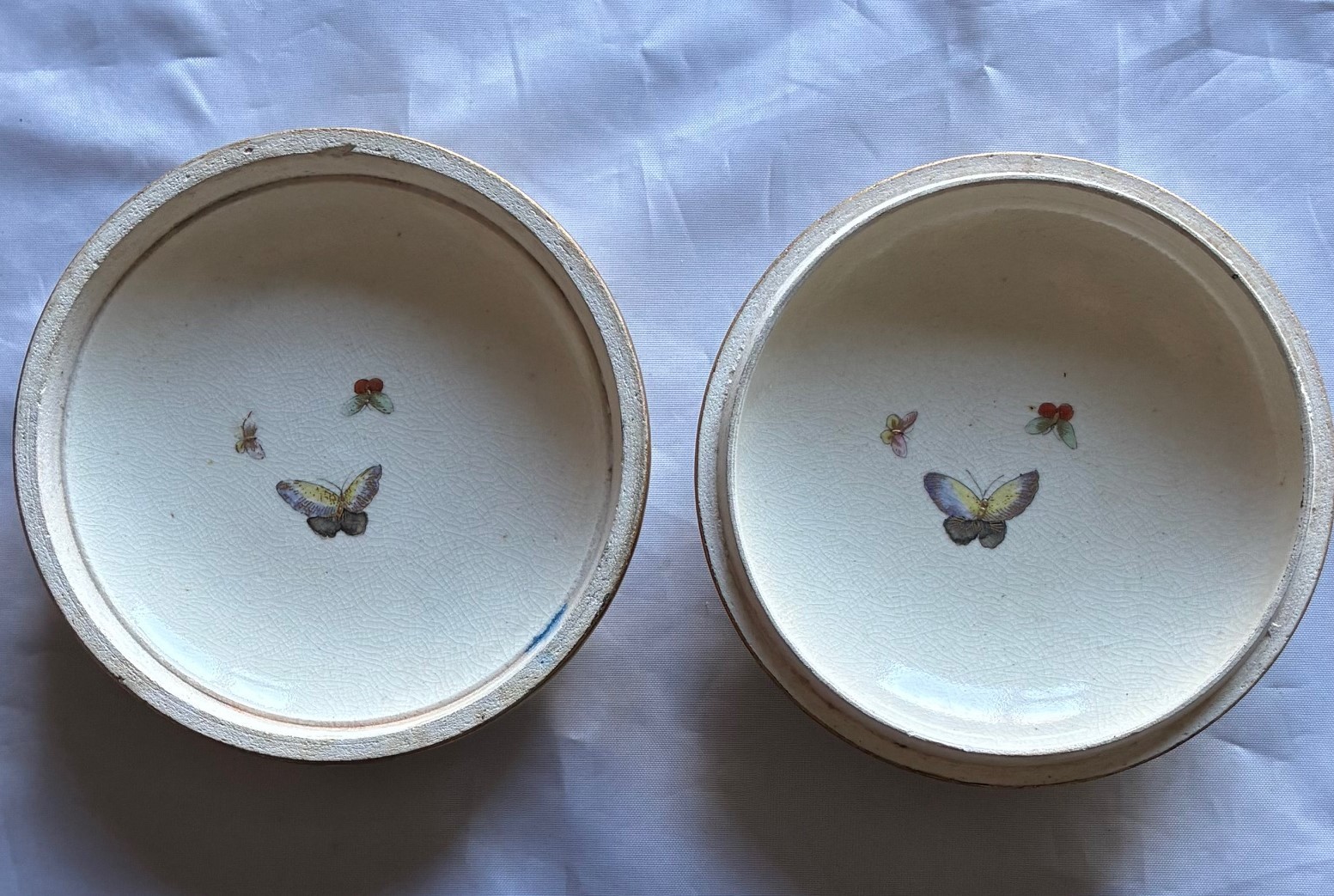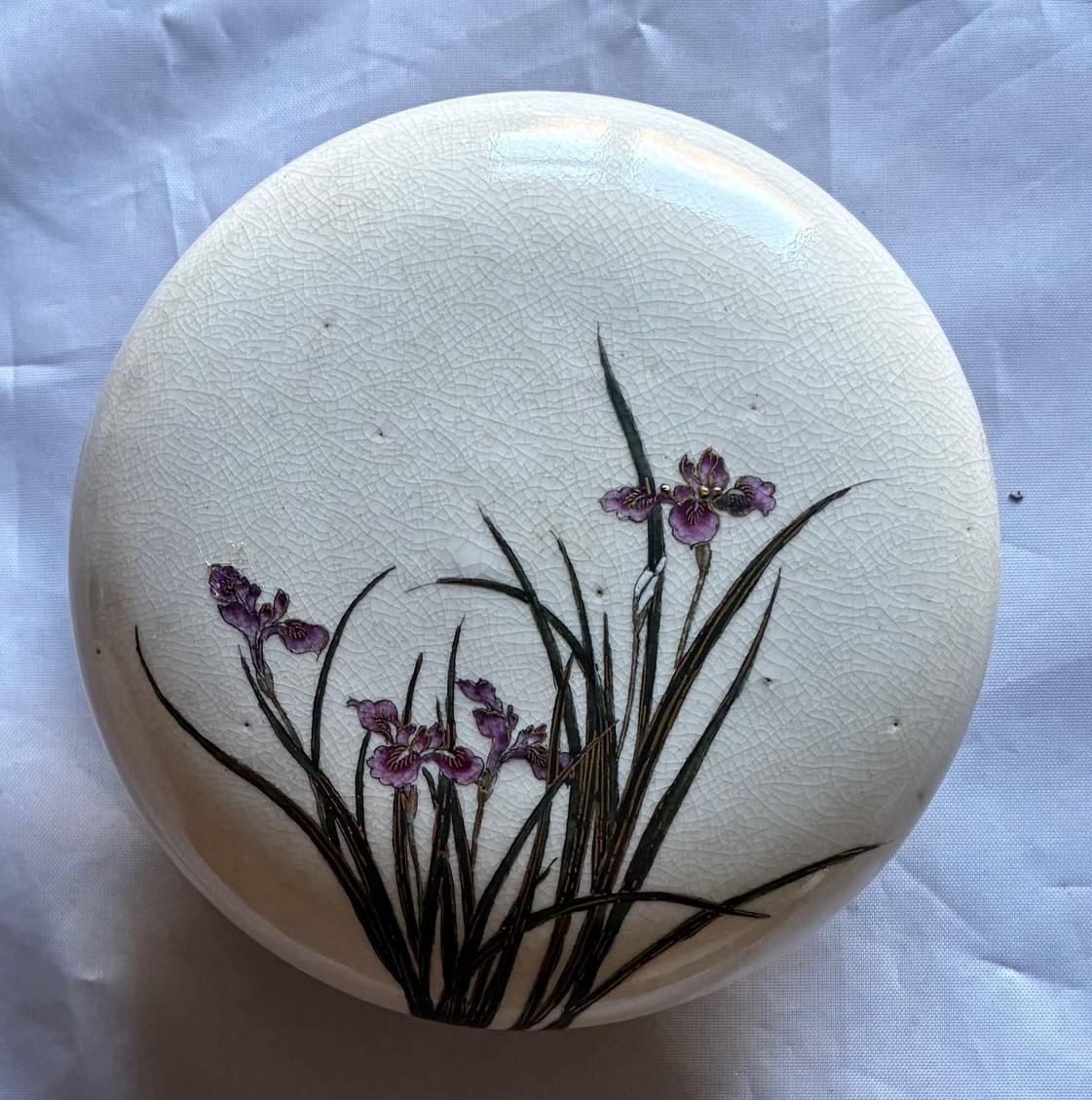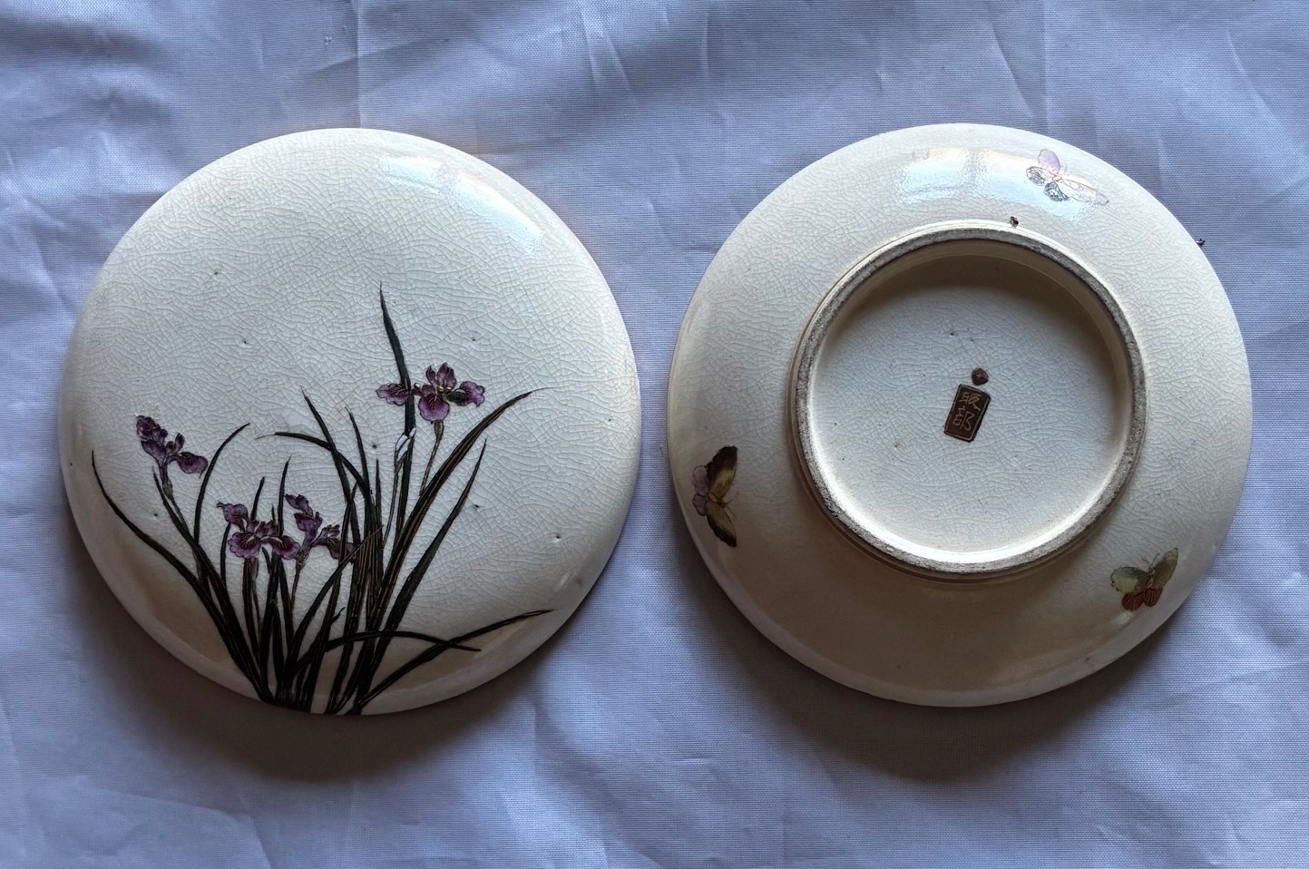 Japanese Satsuma circular lidded shallow box, the top with painted flowers, the interior with butterflies, the base with painters mark and three butterflies, 9.5cm diameter.