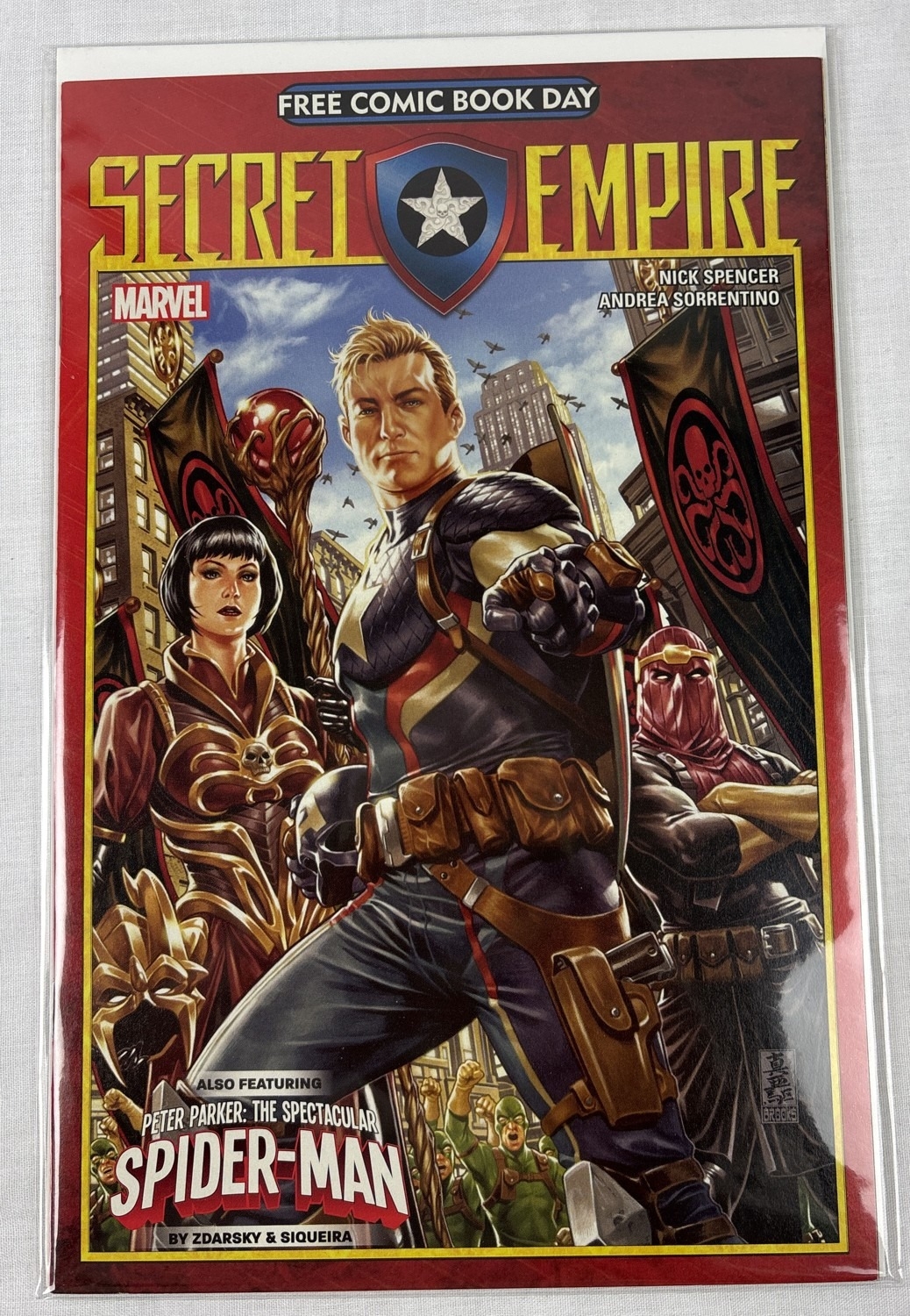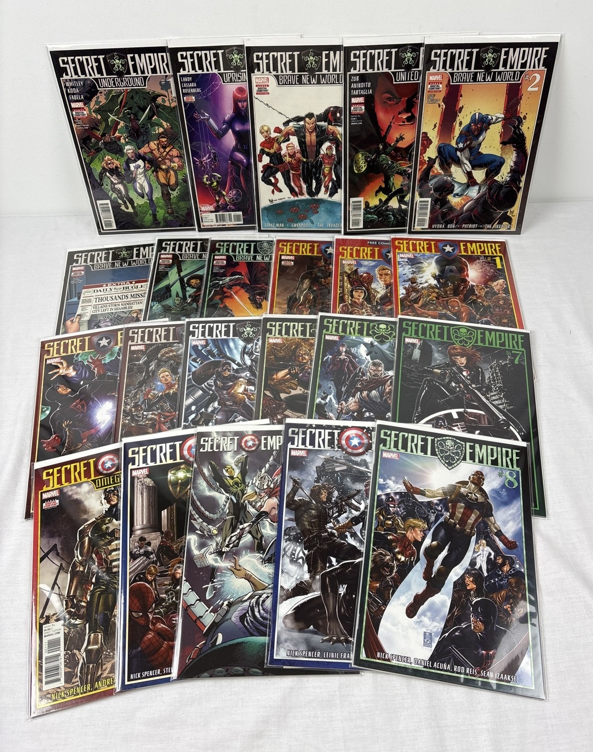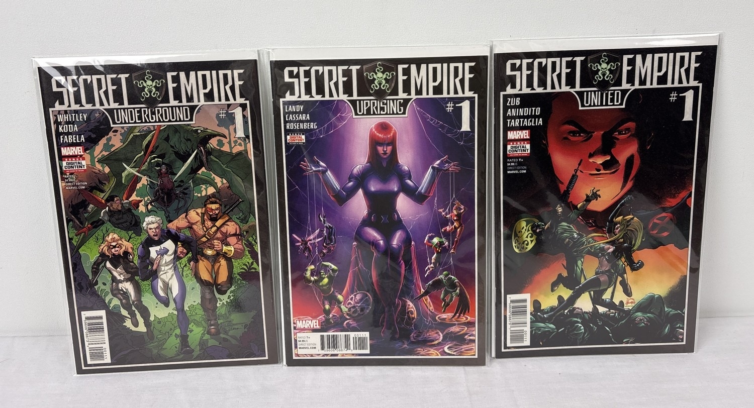 Complete set of Secret Empire comic books (issues #0-10 plus comic book day issue), together with Secret Empire Omega #1, Secret Empire: Uprising, Secret Empire: Underground, Secret Emprire: United, and Secret Empire: Brave New World #1-5. By Marvel Comics, 2017. All in bag and with board.