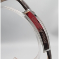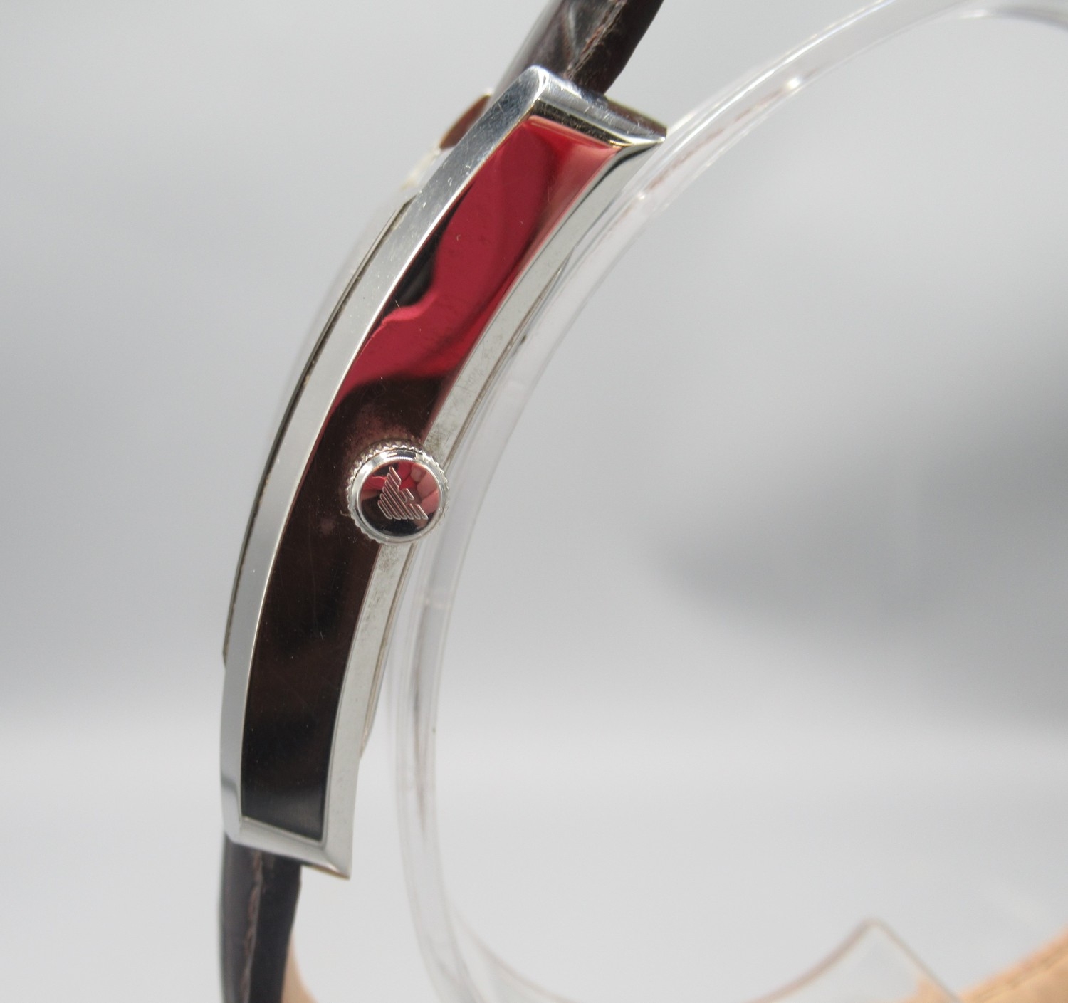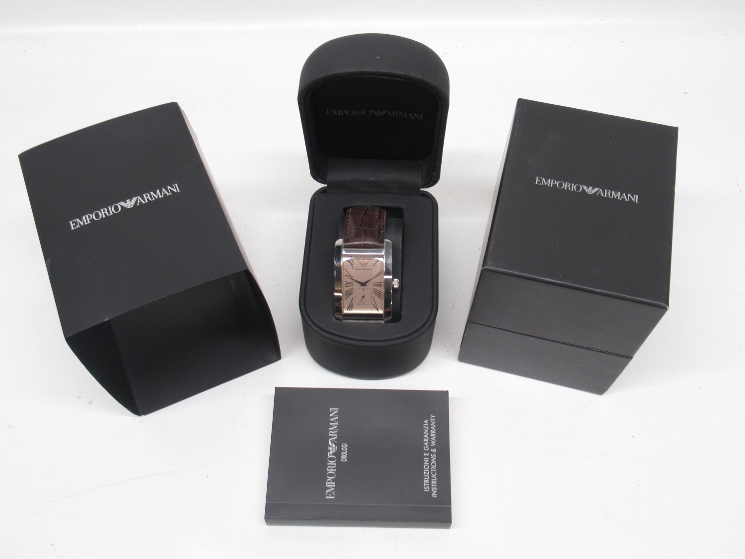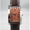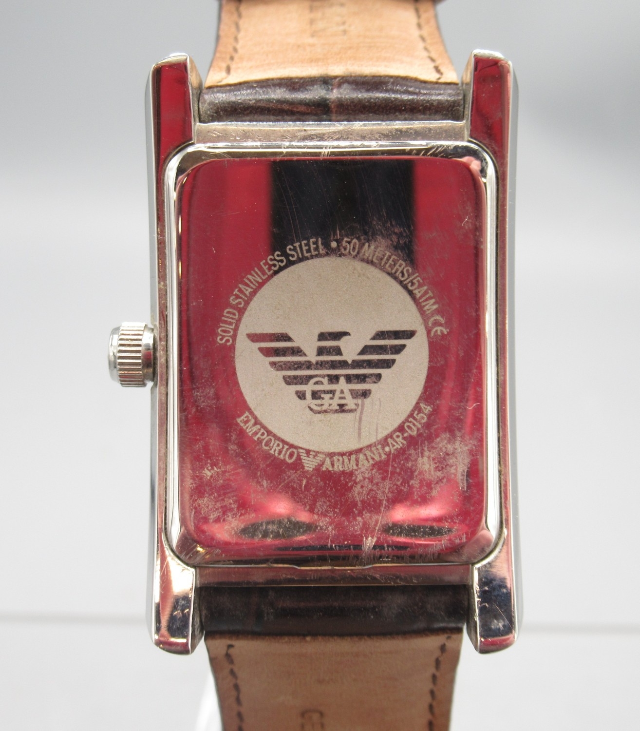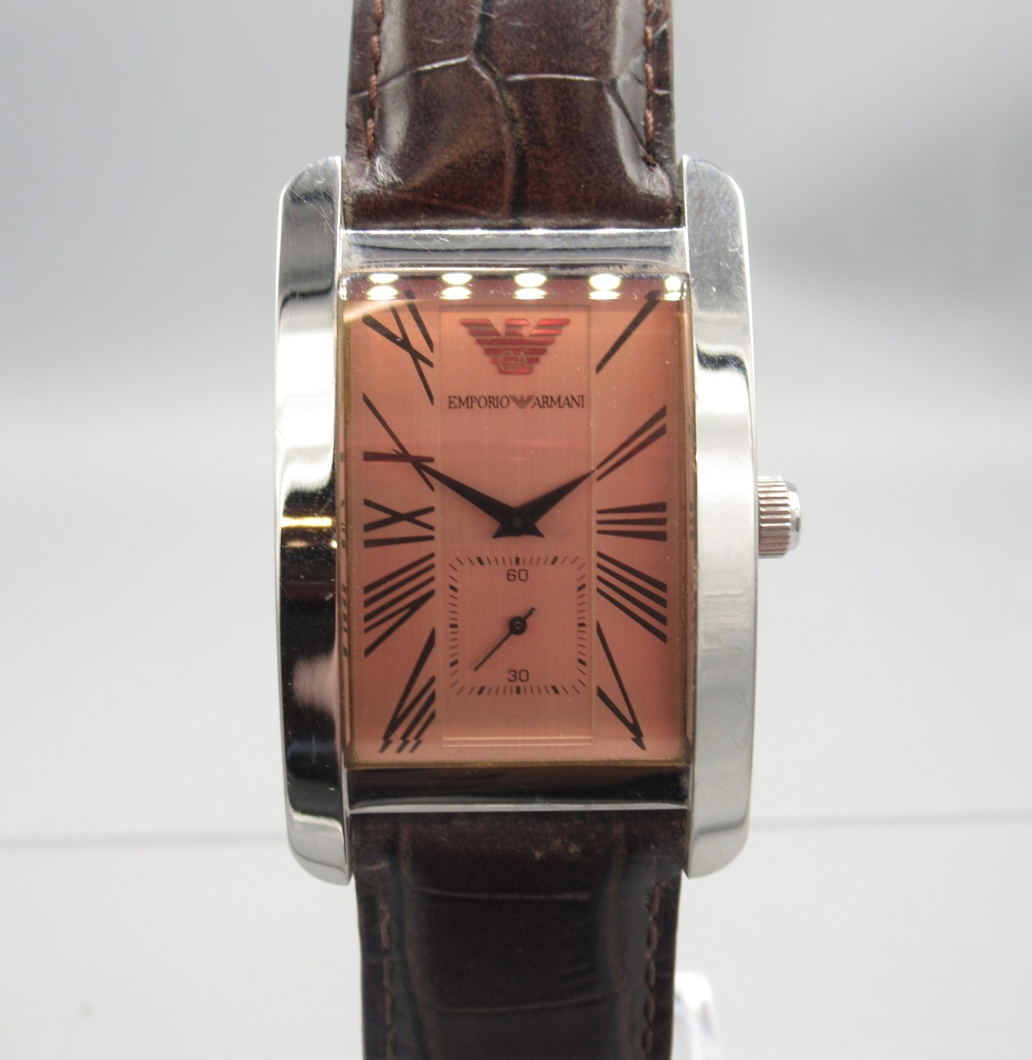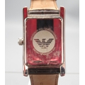 Emporio Armani chrome quartz tank wristwatch on original brown leather strap with signed buckle, signed salmon Roman dial with subsidiary seconds, signed snap on case back ref. AR-0154, D30.5mm
