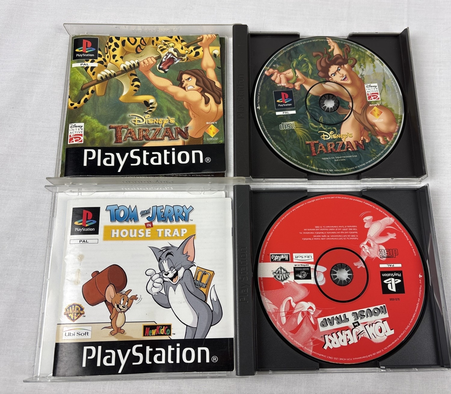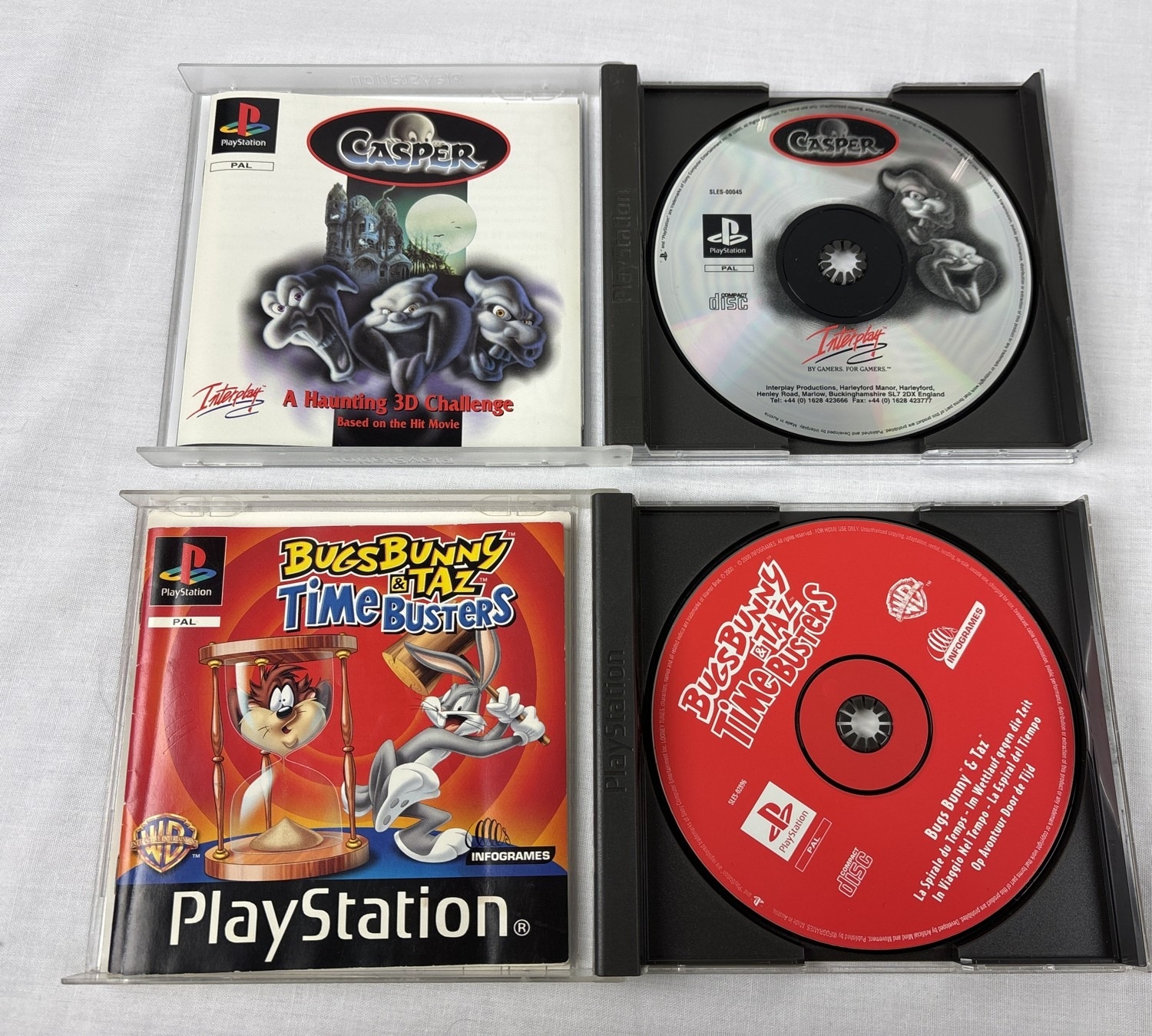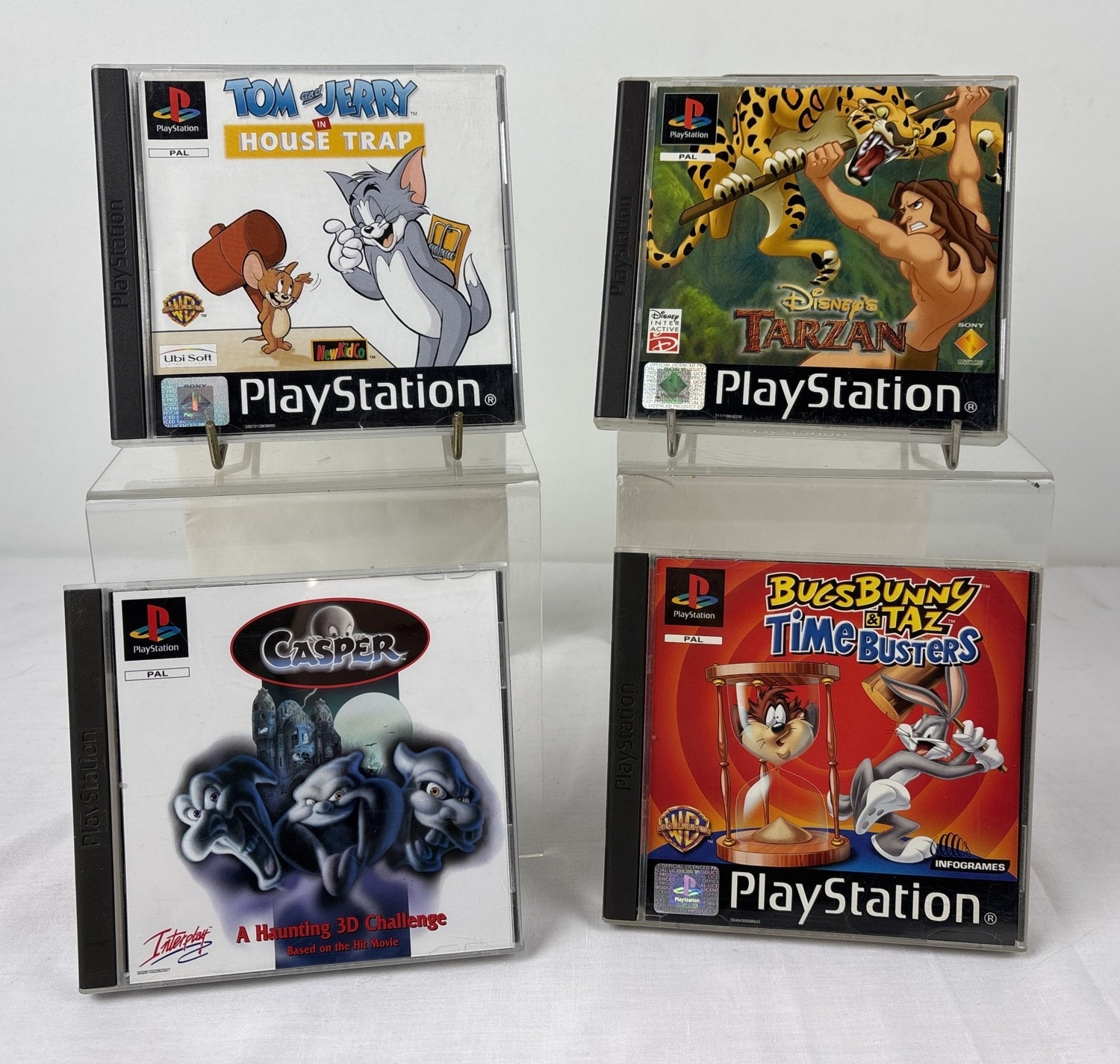4 assorted cartoon based Playstation 1 PS1 games, all complete with manuals and no damage to cases. Bugs Bunny & Taz: Time Busters, Casper: A Haunting 3D Challenge, Disney's Tarzan and Tom & Jerry in House Trap.