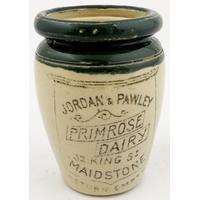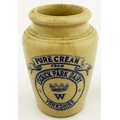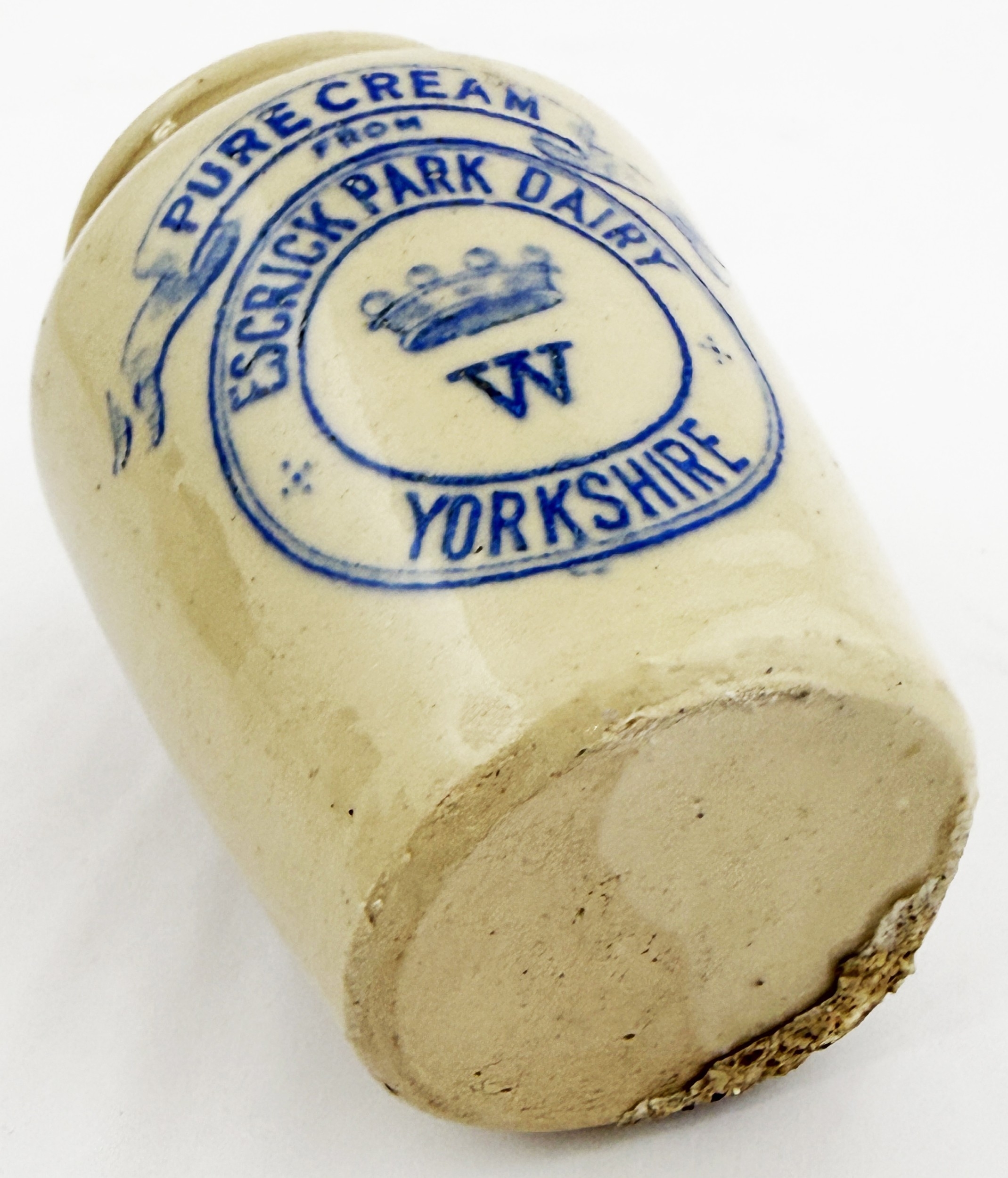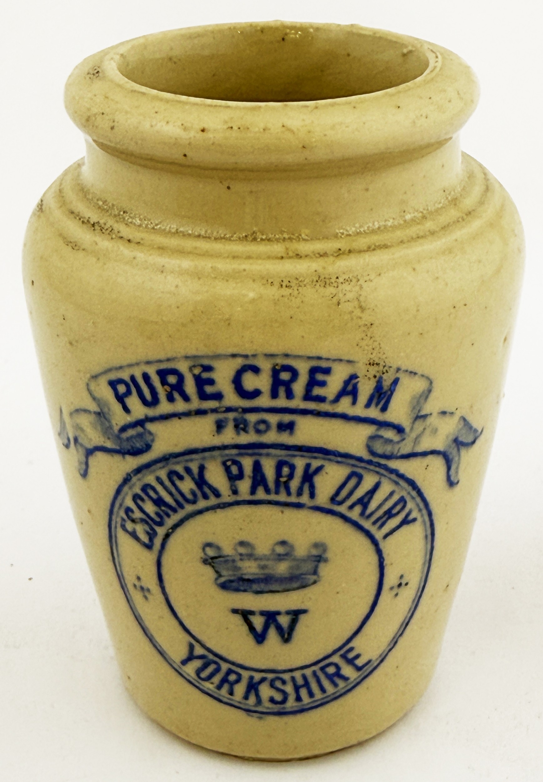 ESCRICK PARK DAIRY YORKSHIRE CREAM POT. 3.5ins tall. Attractive blue print all white cream pot, crown pictorial, this the Pure Cream variation. Hugh Davidson collection. Superb condition,