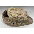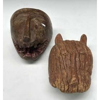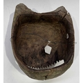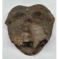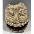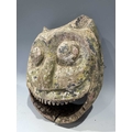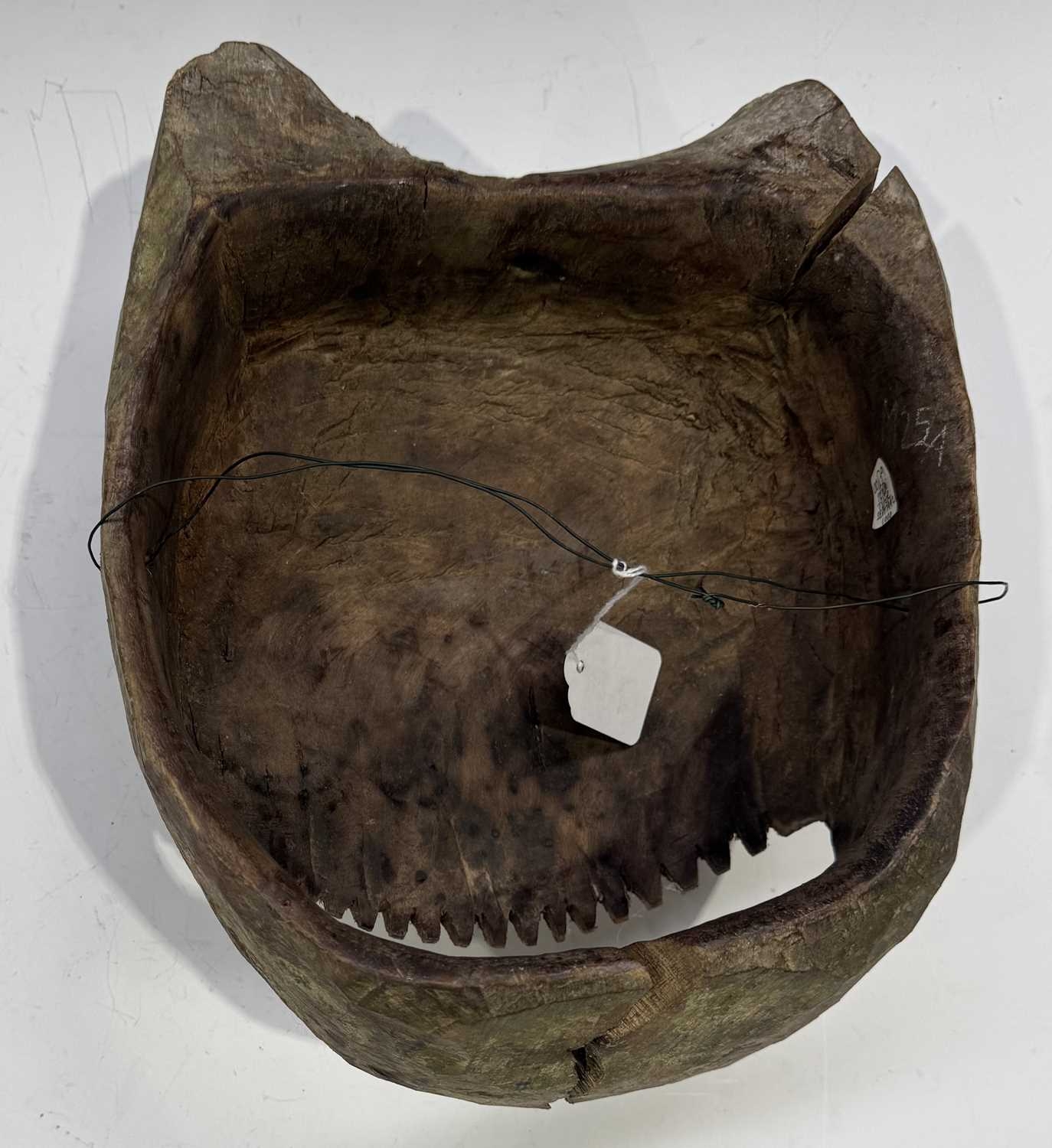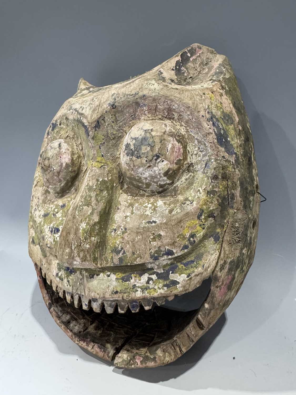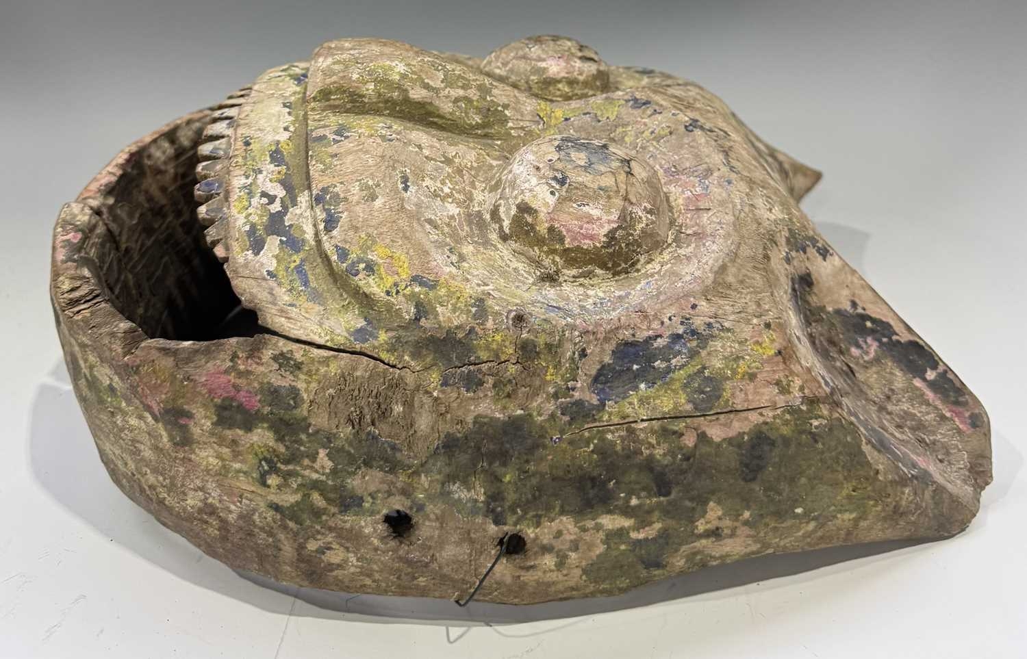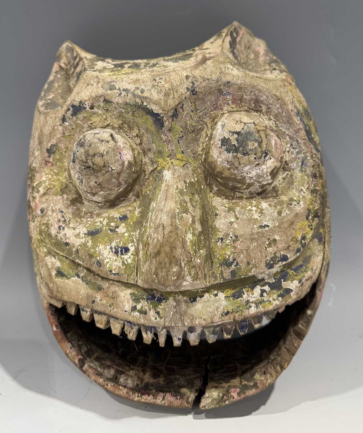 A hand carved wood tiger head mask with layers of patinated polychrome decoration, modelled with pointed ears and circular bulging eyes, above a wide open 'cheshire cat' toothed grin, hollowed out interior, Terai district, Southern Nepal, late 19th/early 20th century, 31.5 by 24.5cm (2) Note: Tigers, a real threat to South Nepalese villages, have been incarnated through wearable masks or mounted on posts, functioning as deterrents. Provenance: The Alain Rouveure Collection