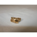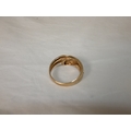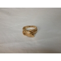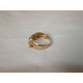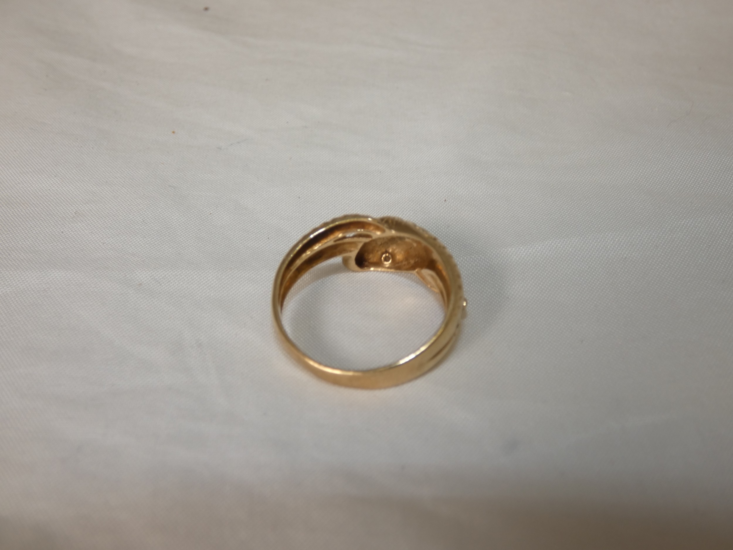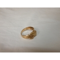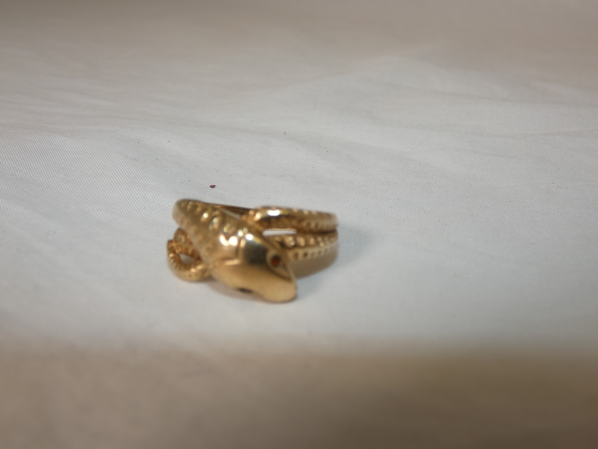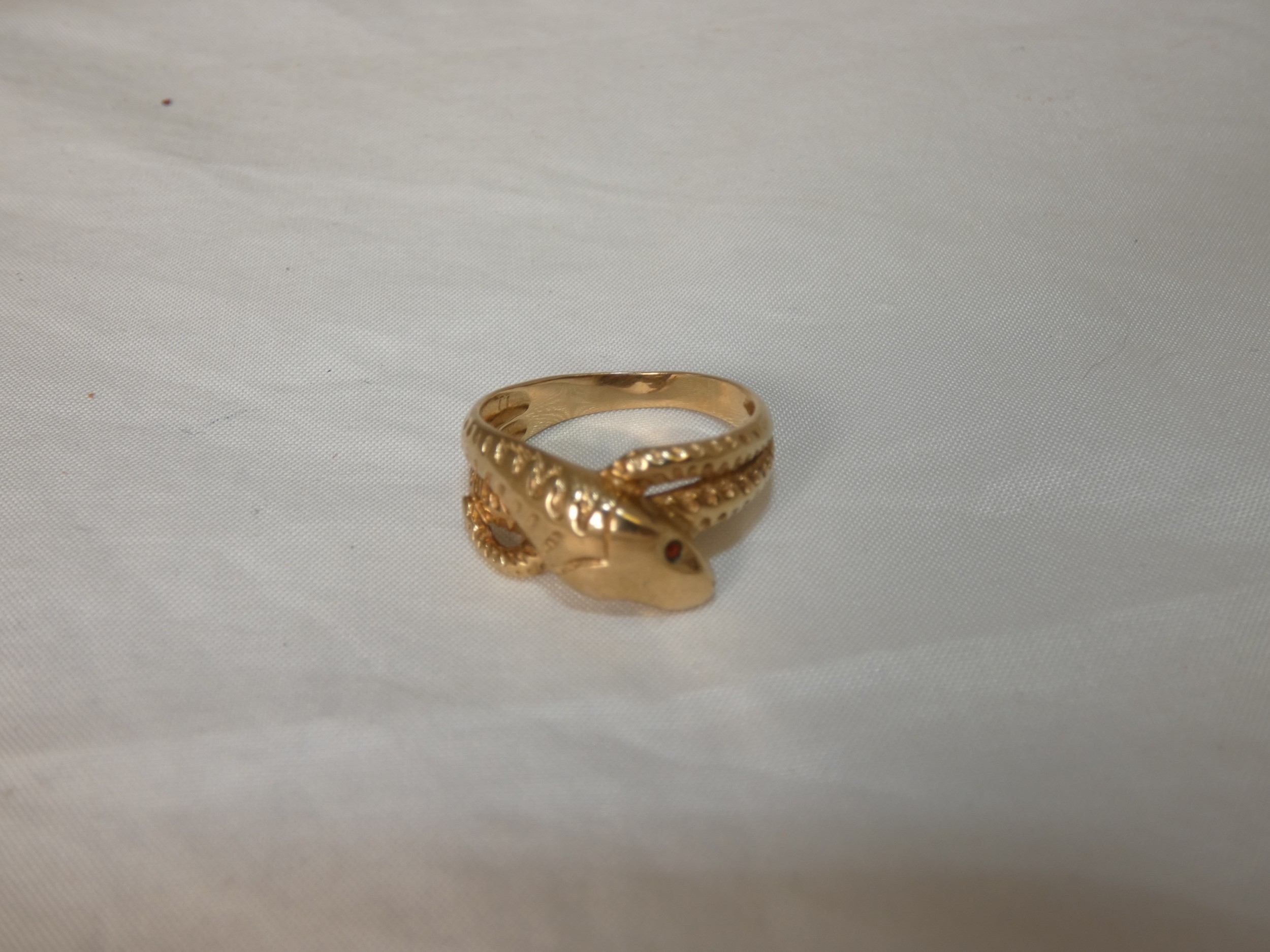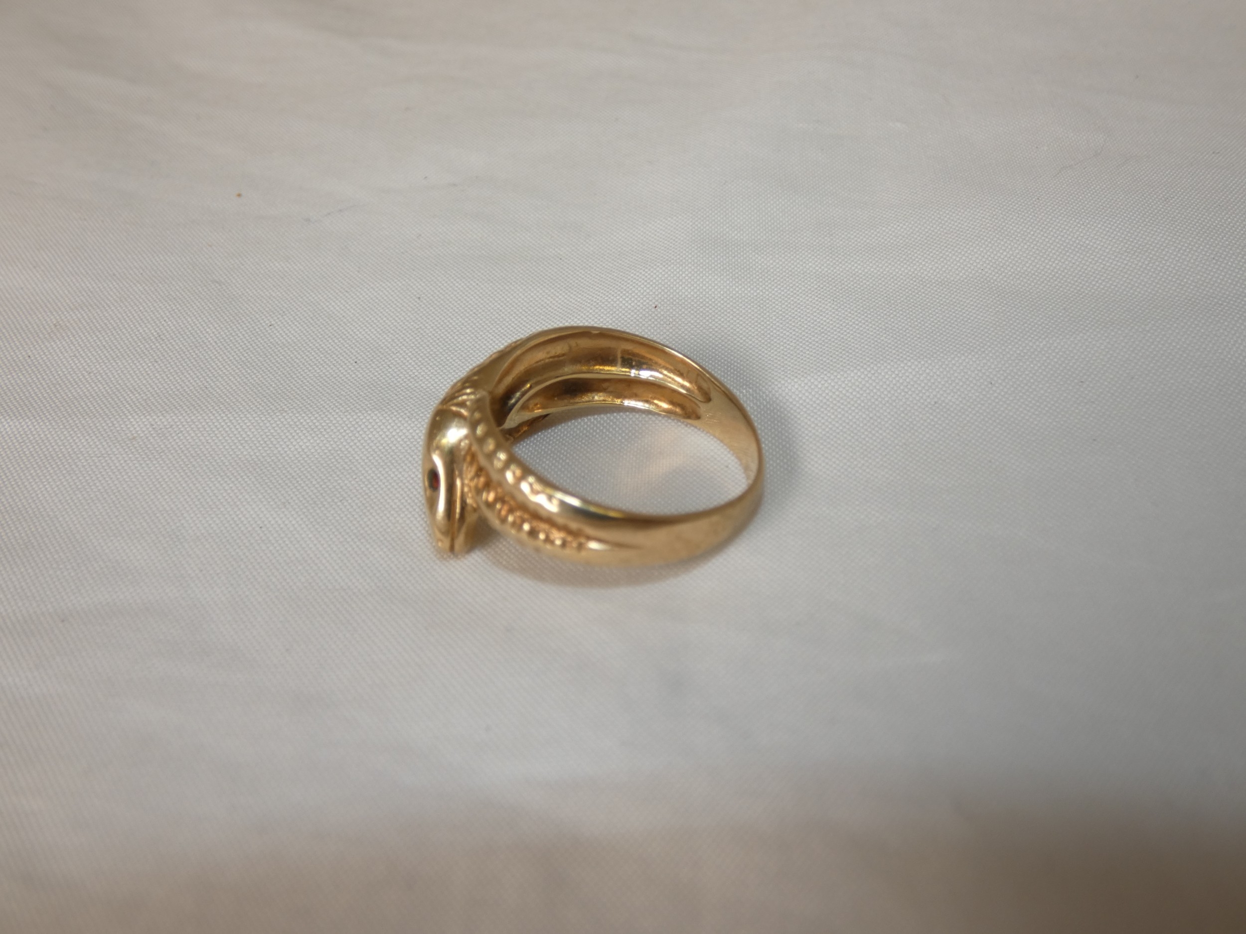 9ct gold snake ring, '375', with red gem-set eyes, size T/U, 4.3g gross.