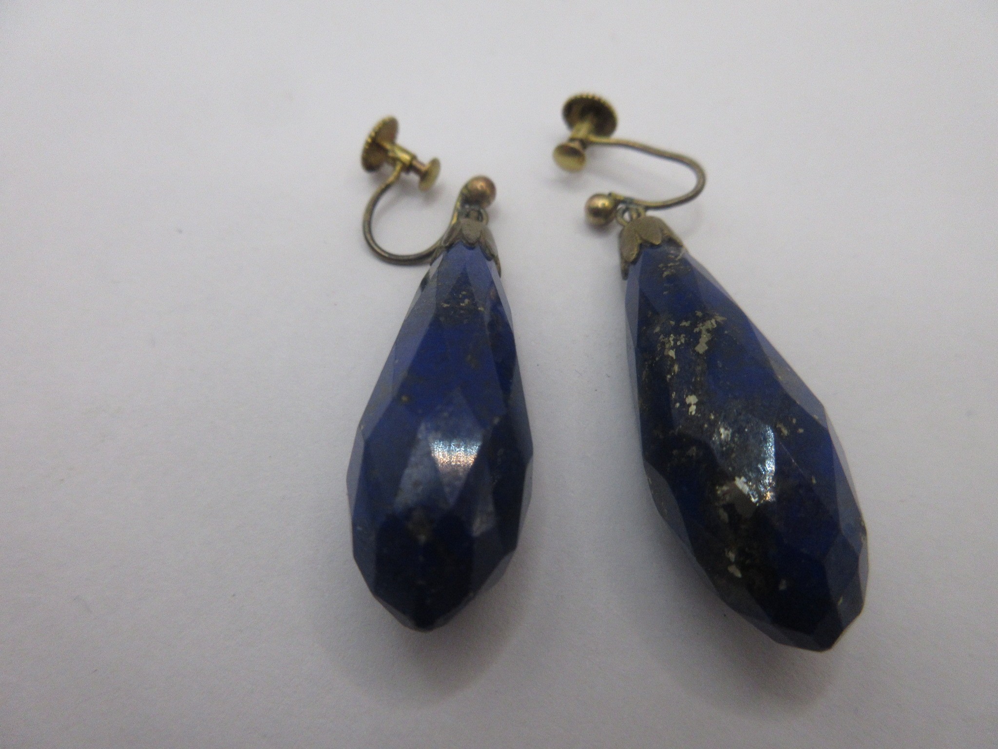 A pair of lapis lazuli pendant earrings with screw clasps stamped 9C, acid test positive for gold. The pendants are faceted and of teardrop shape, drop about 35mm