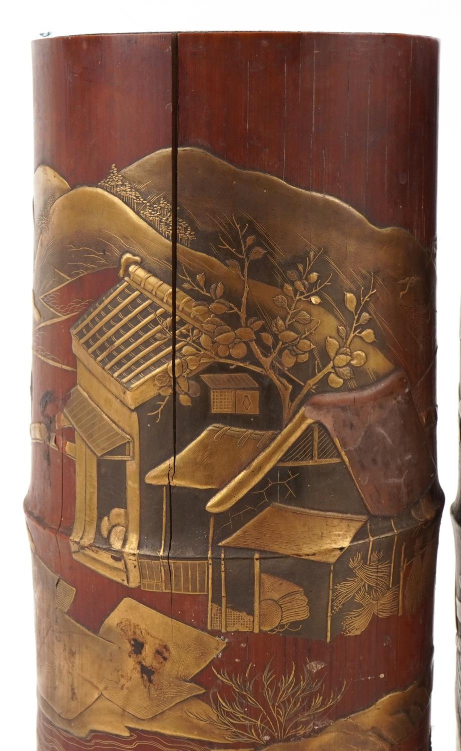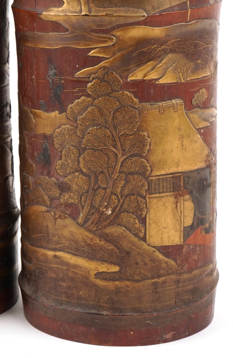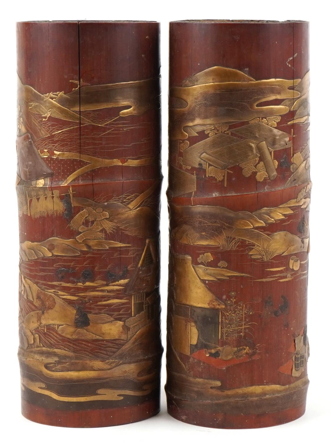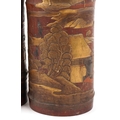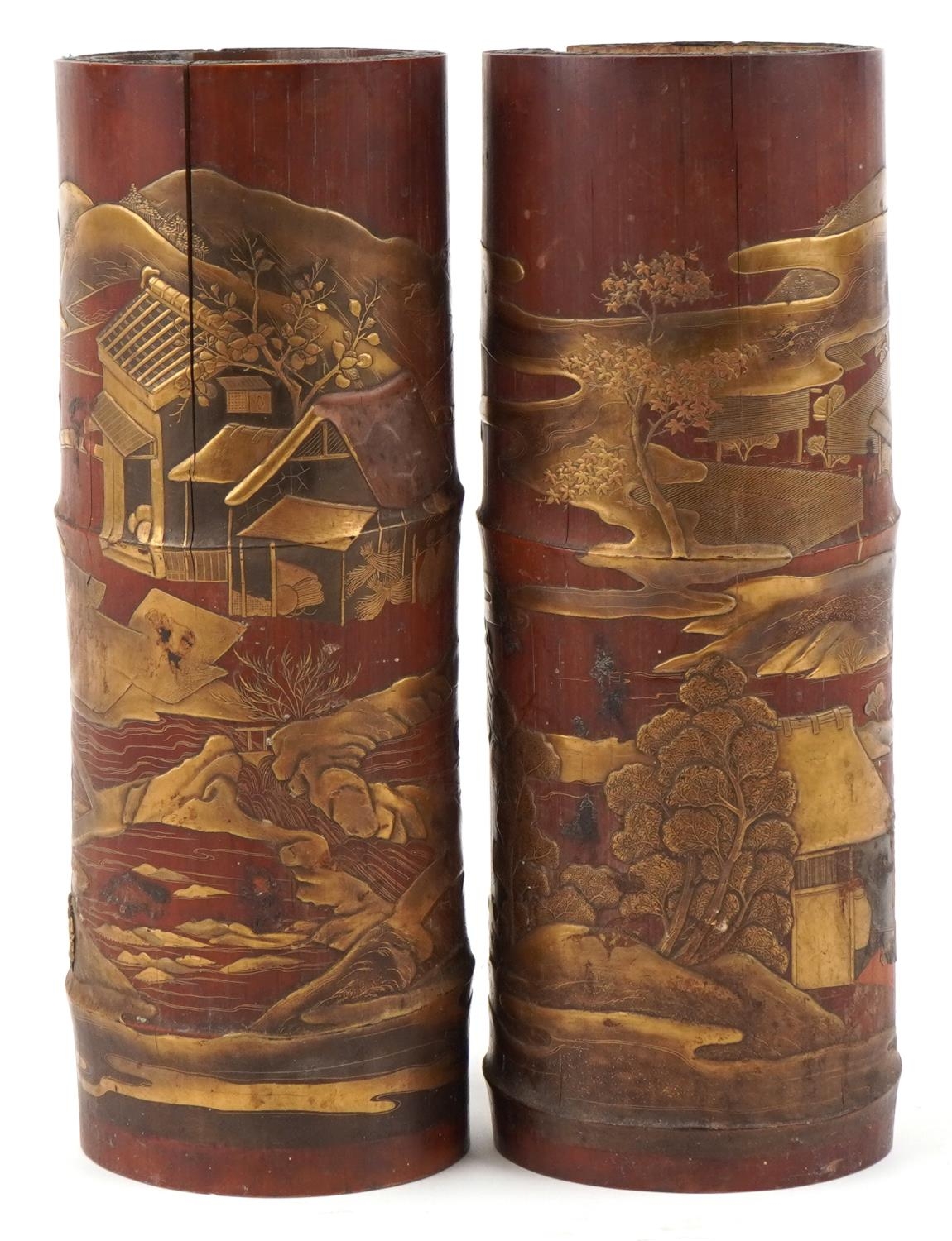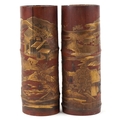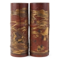 A pair of Chinese bamboo lacquered brush pots, late 19th/early 20th century, each decorated in gilt with landscape scenes, 39cm high.