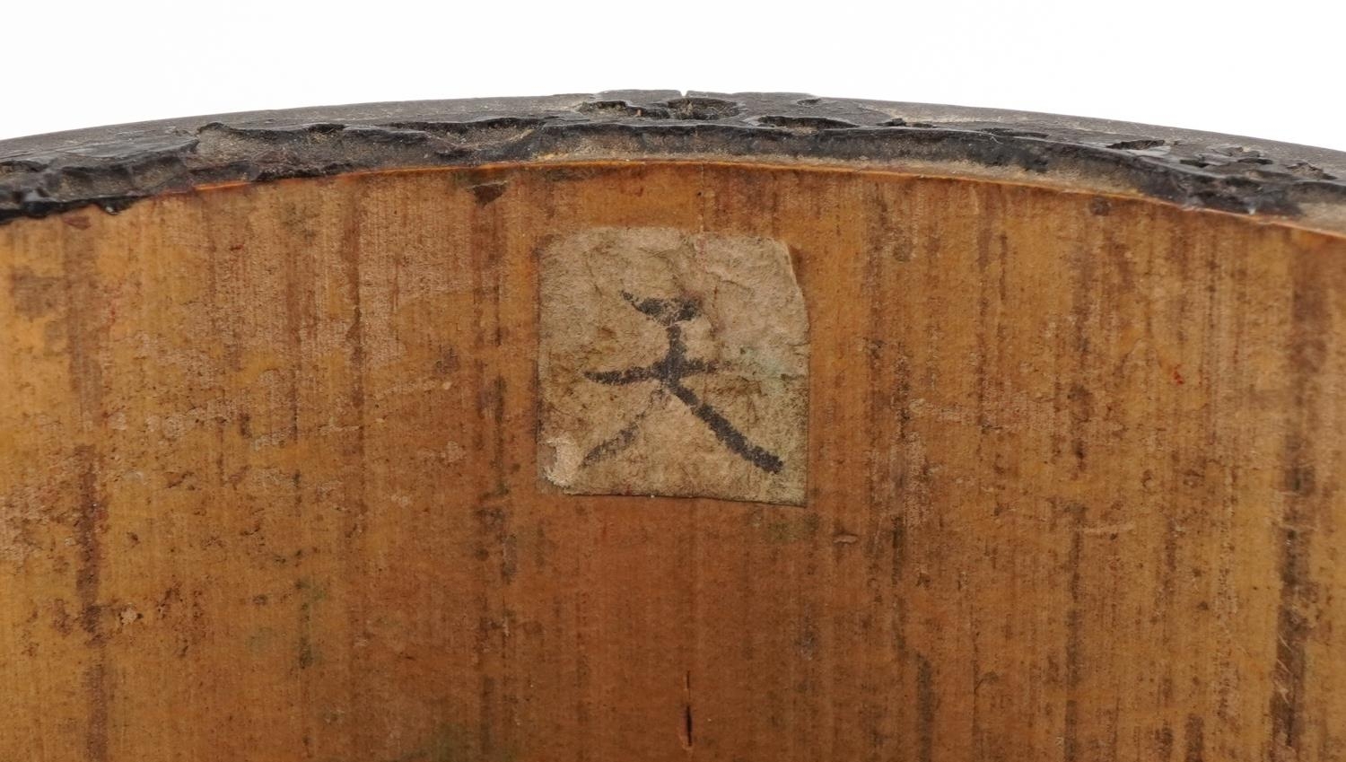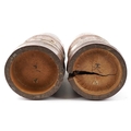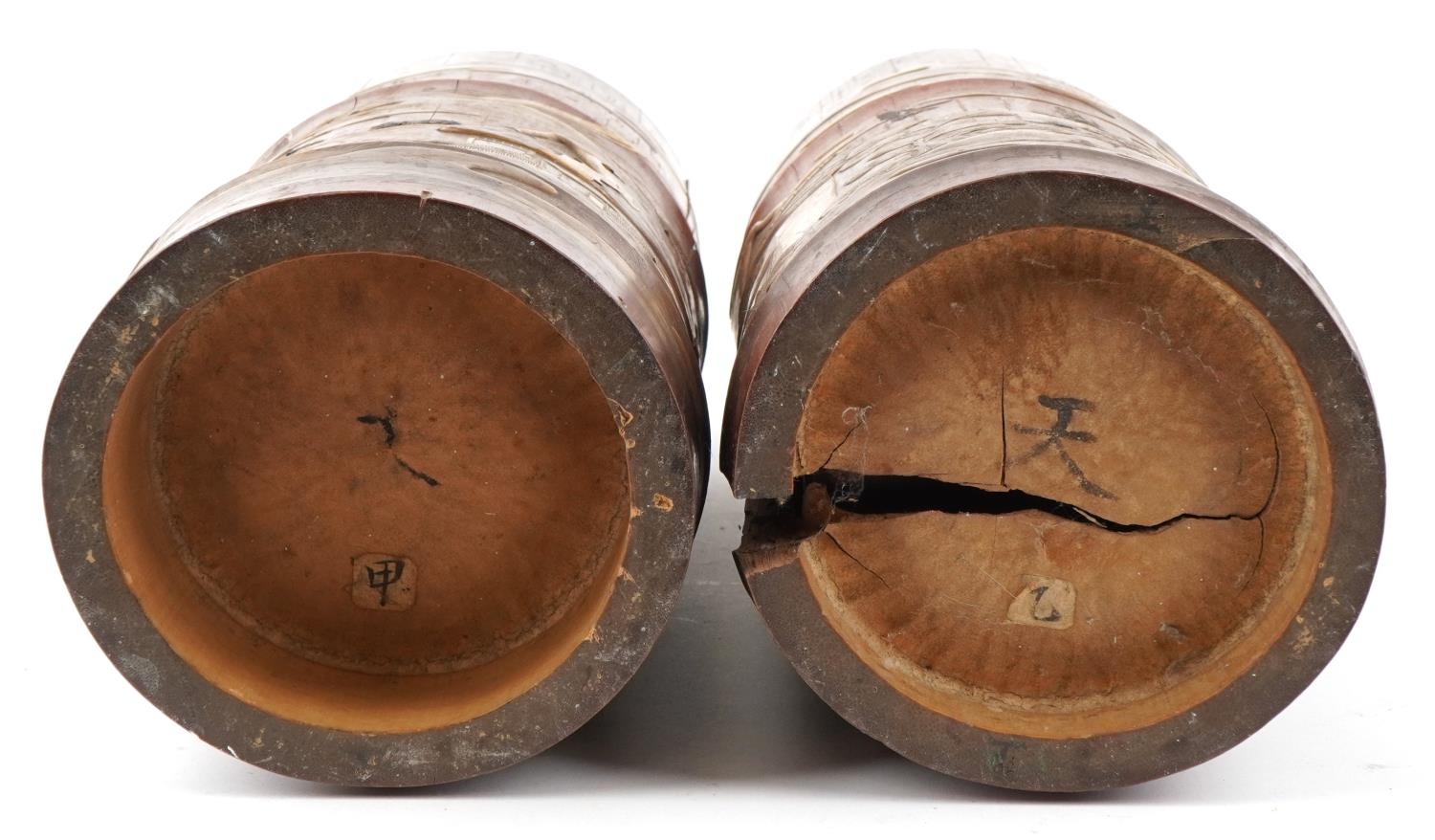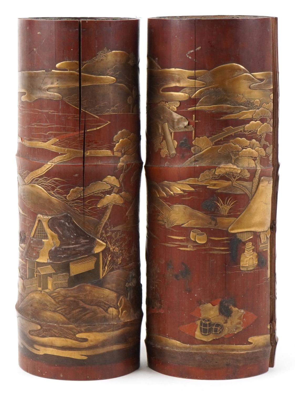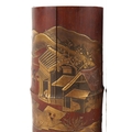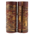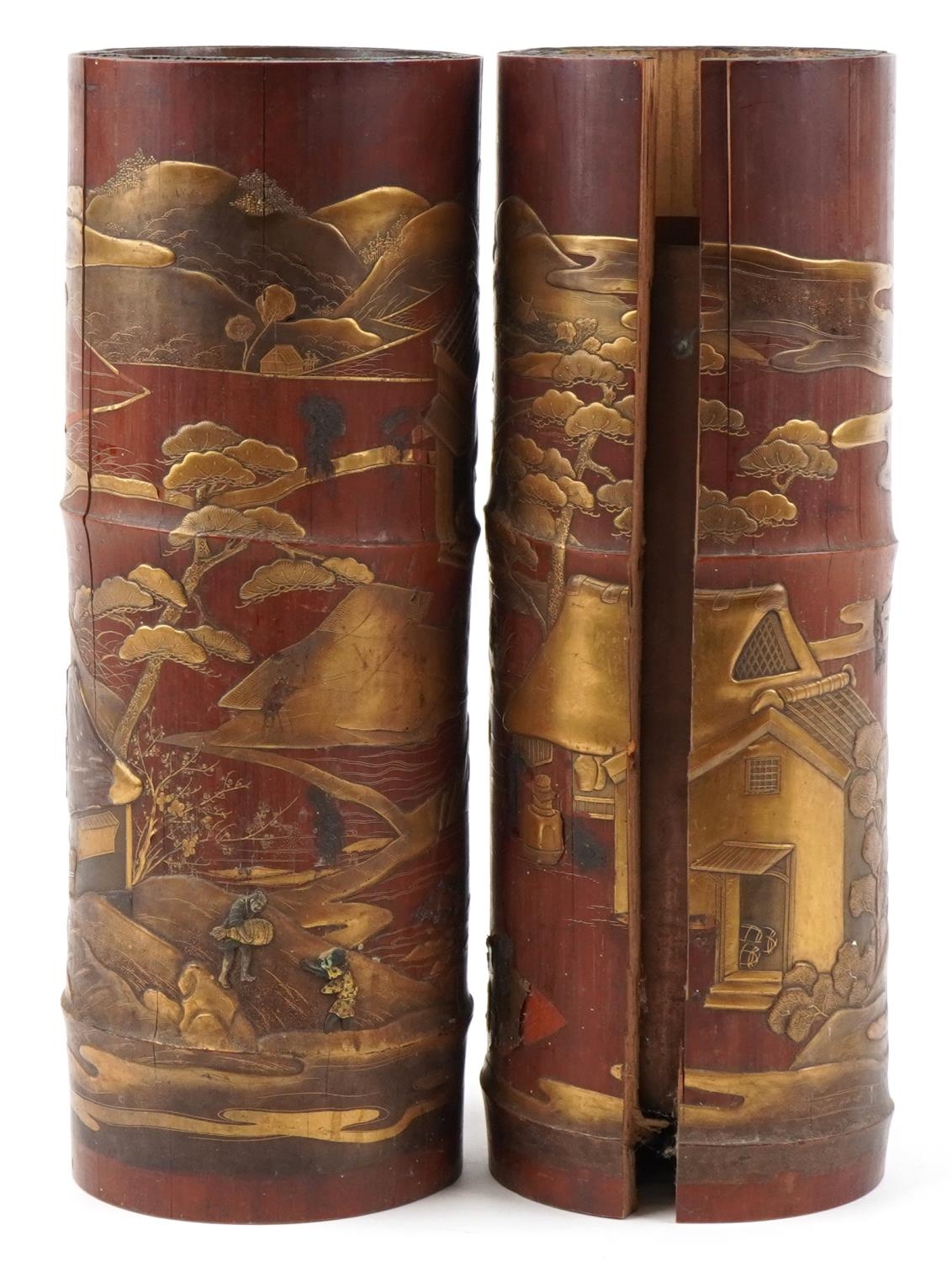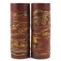 A pair of Chinese bamboo lacquered brush pots, late 19th/early 20th century, each decorated in gilt with landscape scenes, 39cm high.