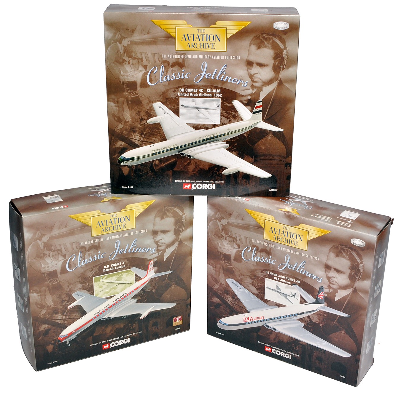 A group of 3 x Corgi 1/144 diecast model aircraft from the aviation archive series. All excellent and not displayed, in boxes.