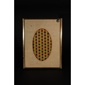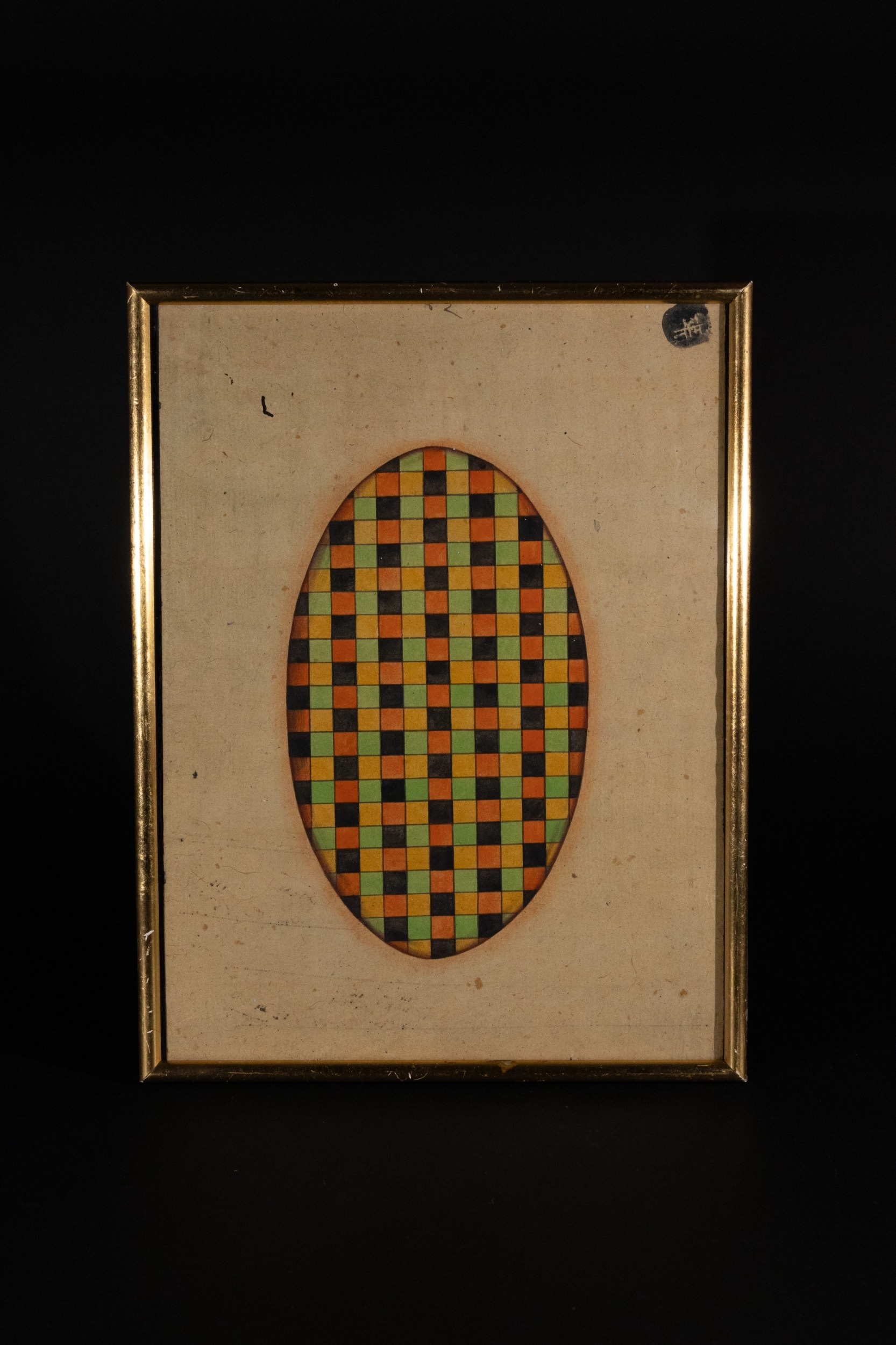 An Indian Tantric Geometric Painting on Paper - A Tantric geometric painting on paper, presenting an abstract composition featuring an oval filled with a multi-colored checkerboard pattern in green, yellow, orange, and black. The piece is set against a cream-toned ground. A dark, circular stamp, likely a chop mark, with a stylized character resembling 'Om' (ॐ) is visible in the upper right corner.