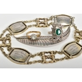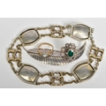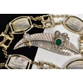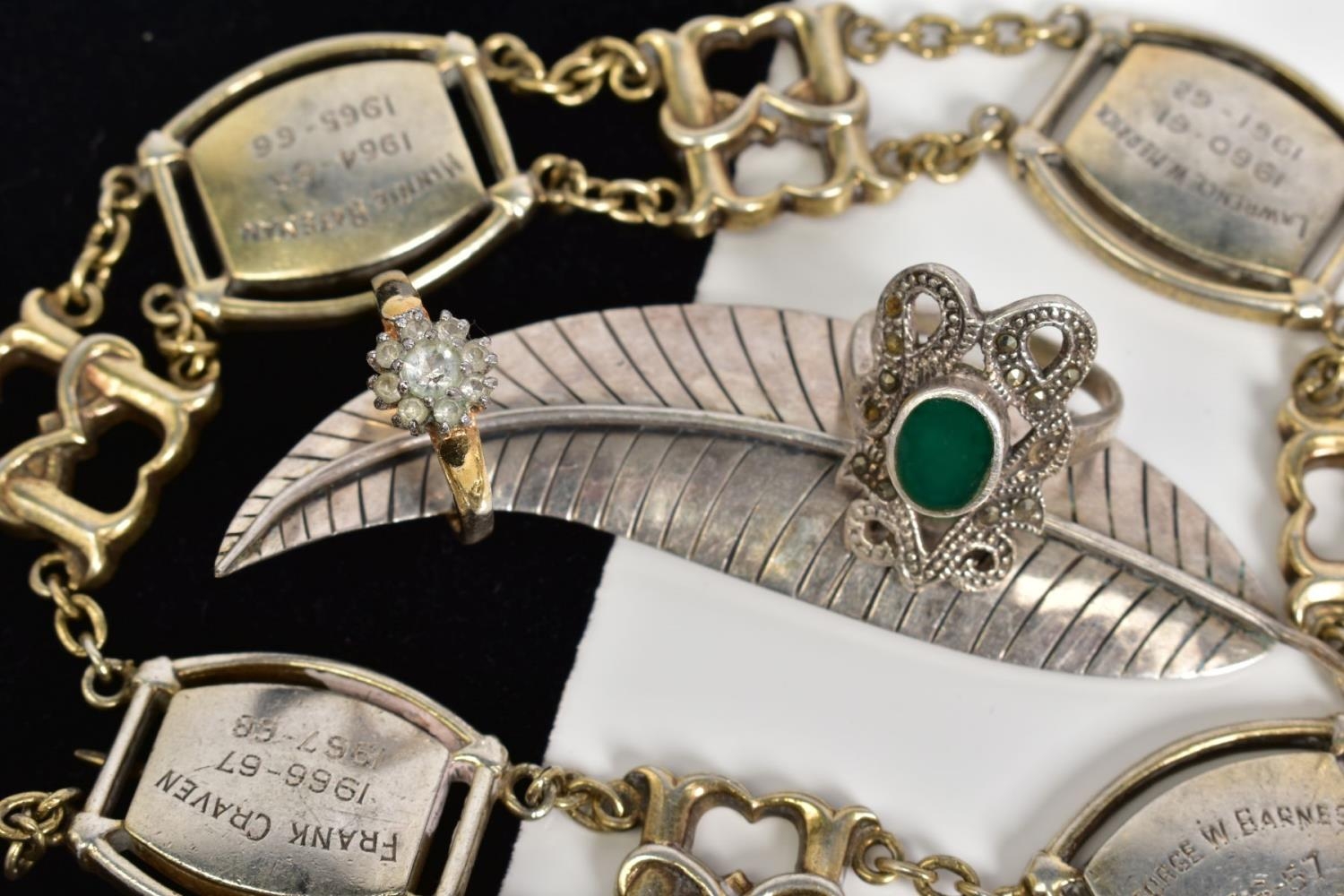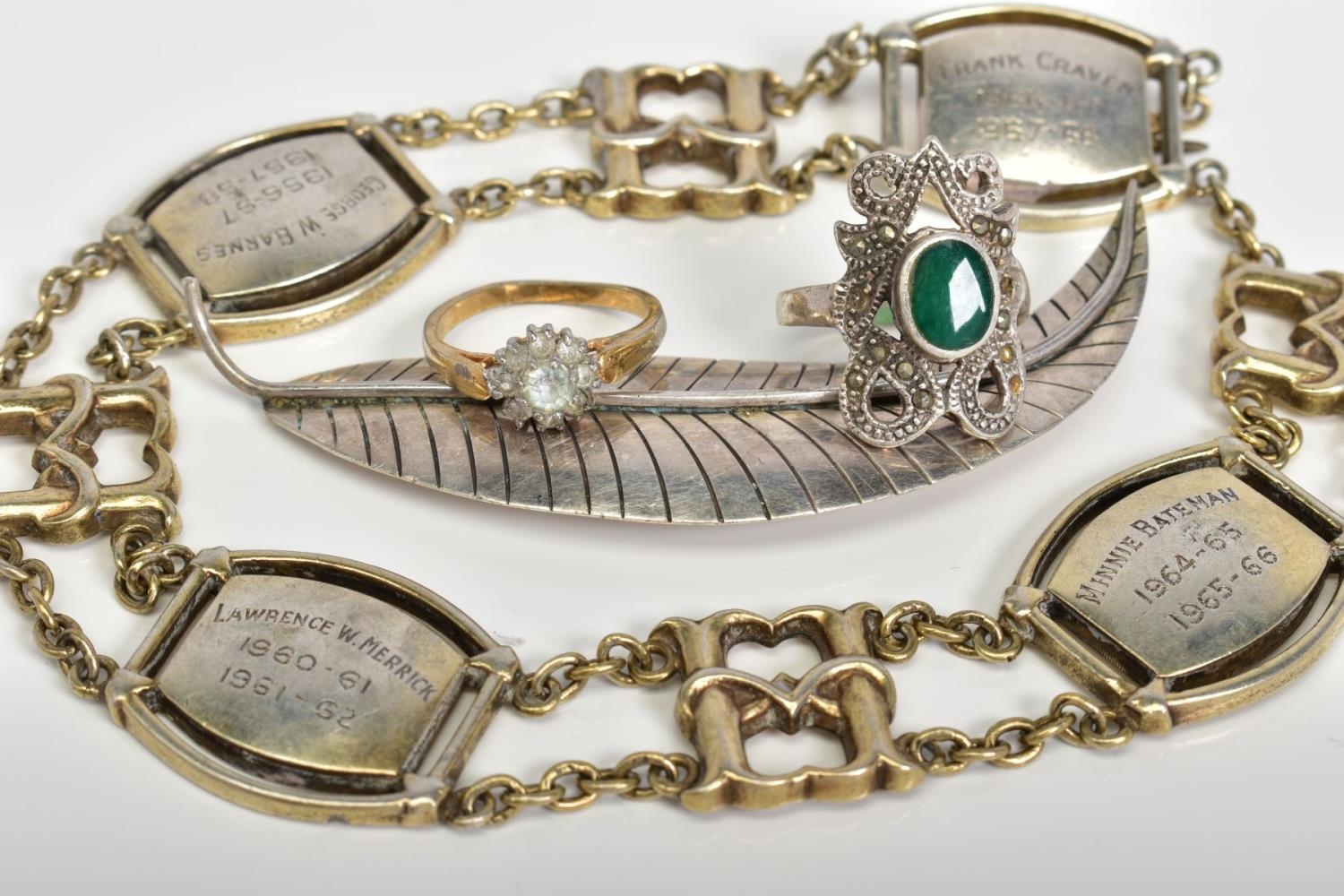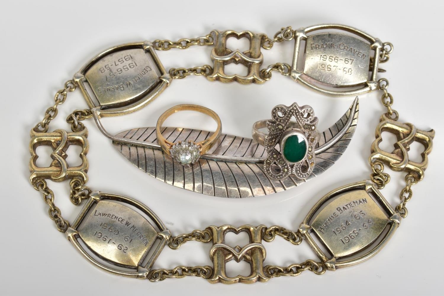 A SELECTION OF SILVER ITEMS, to include a silver bracelet with engraved panels interspaced with scroll links, a brooch in the form of a large feather, stamped 925, length 80mm, a green paste and marcasite ring stamped 925, ring size N, together with a colourless paste set cluster ring, approximate gross weight 100.9 grams
