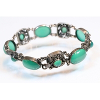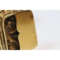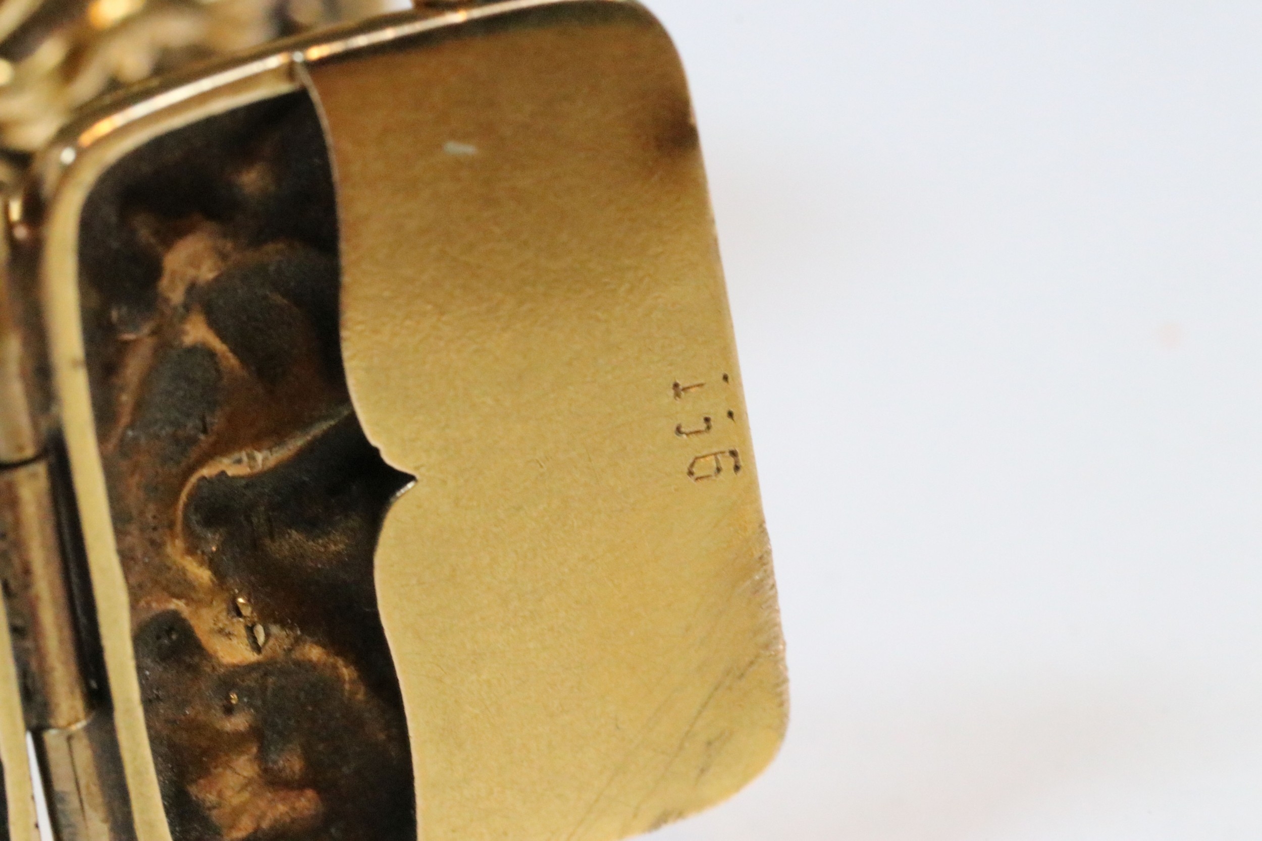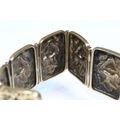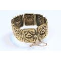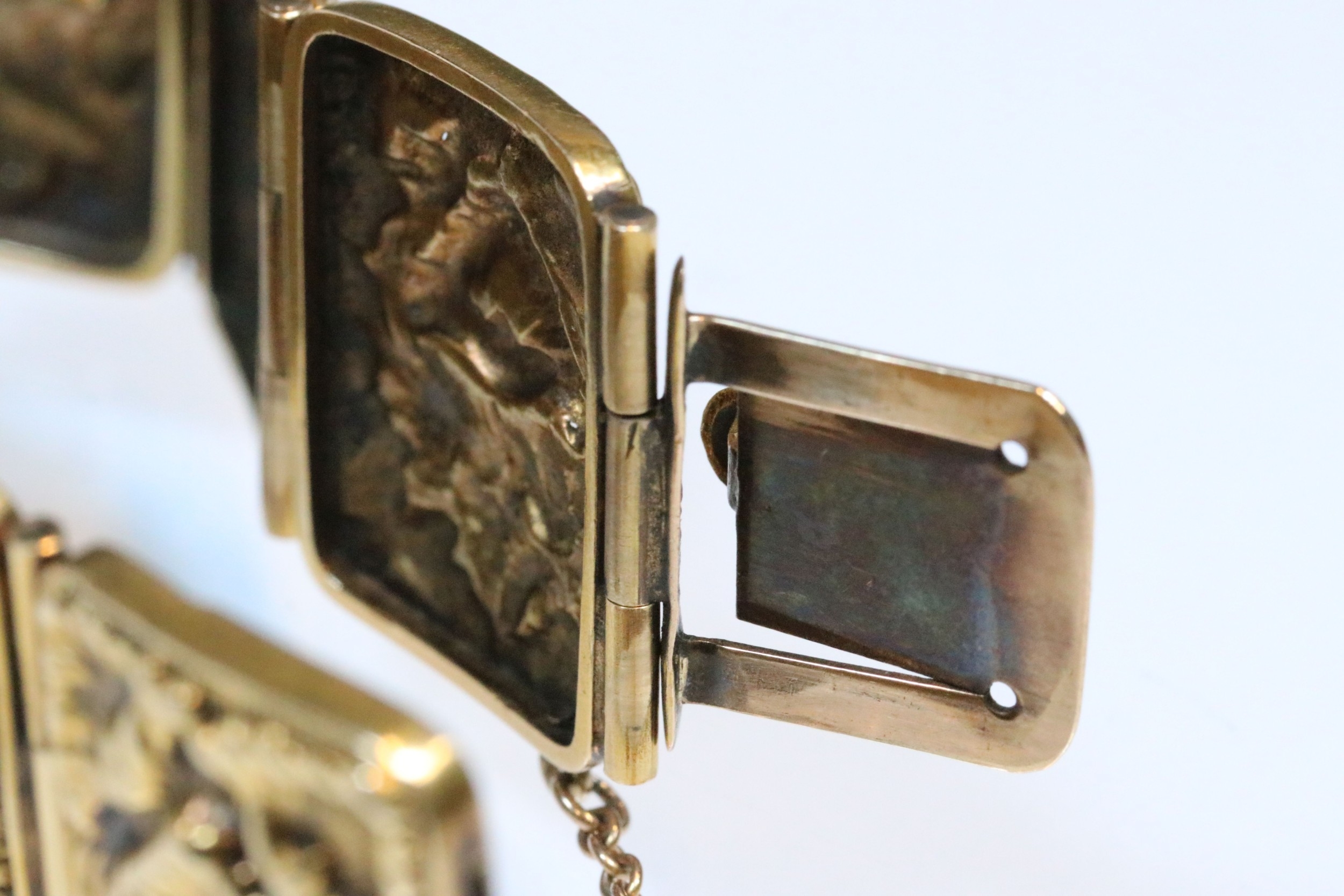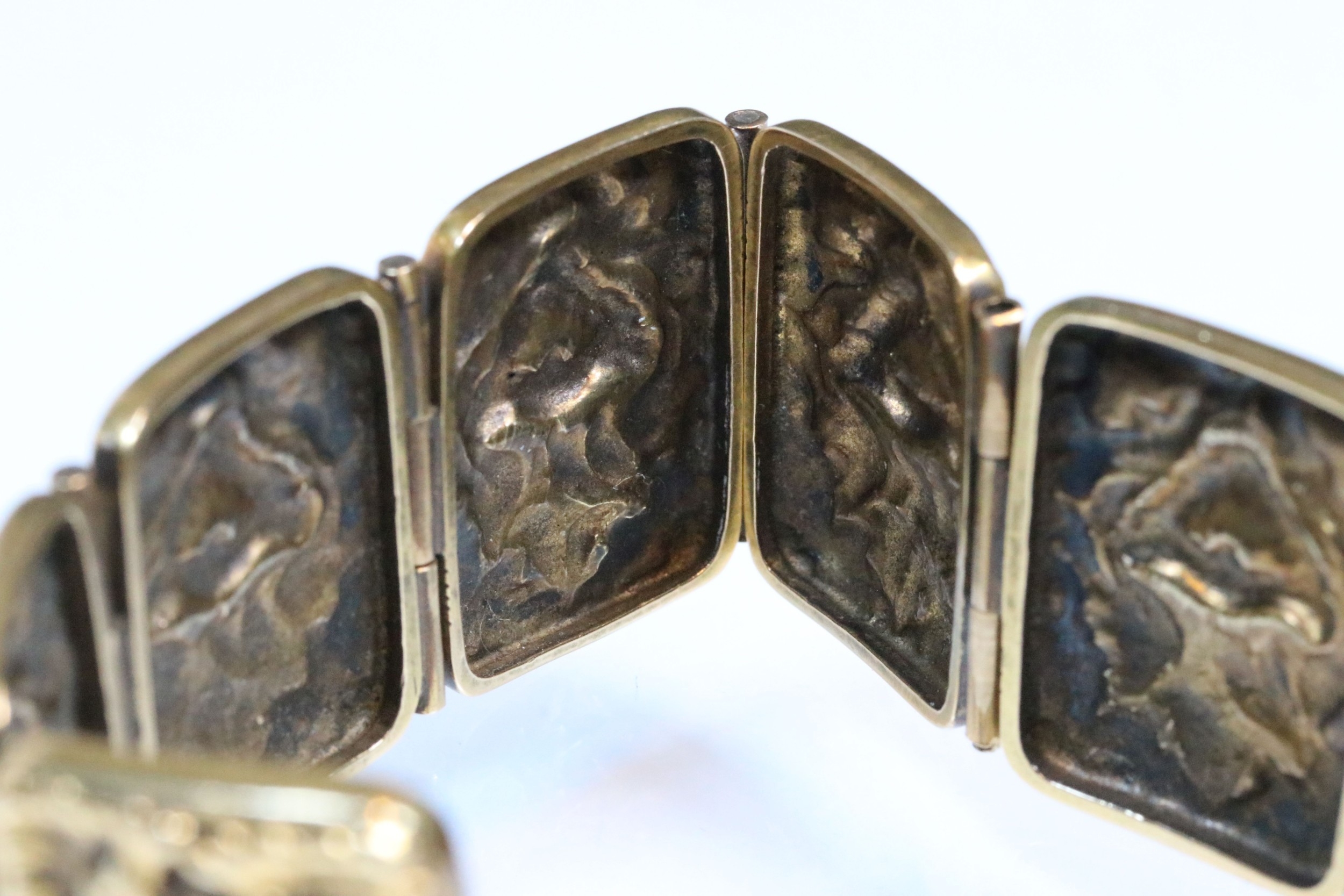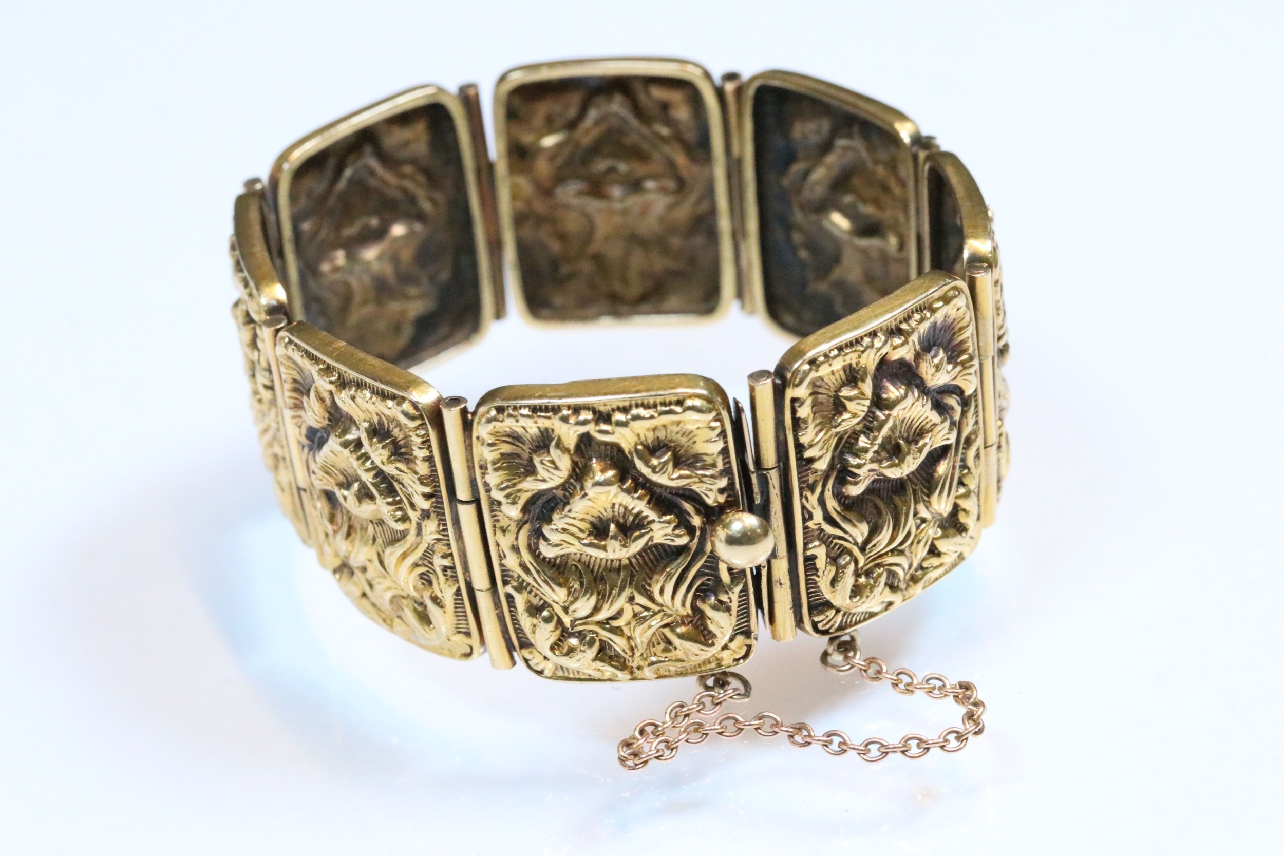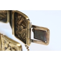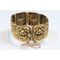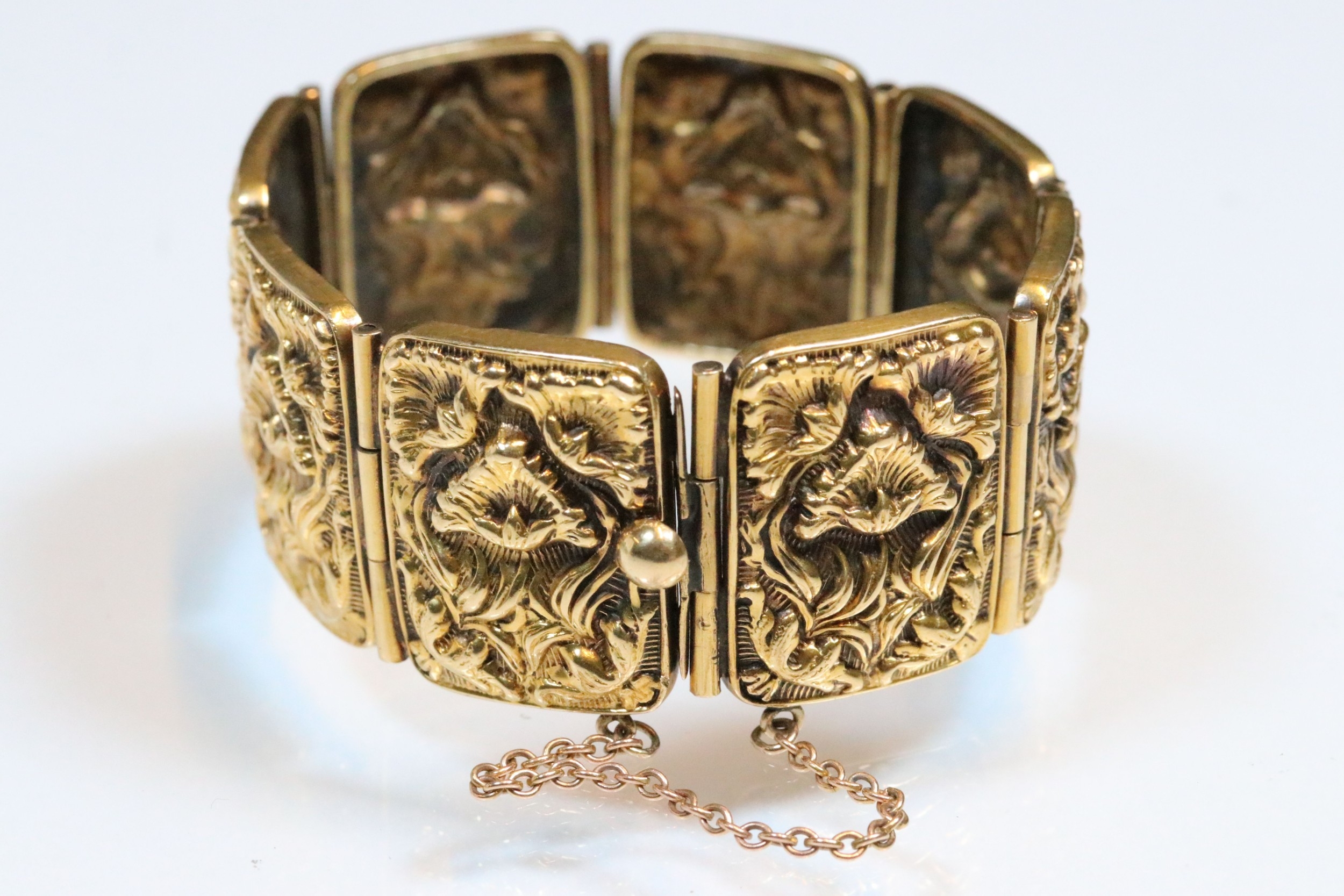 9ct gold panel bracelet constructed from eight repousse foliate design panels with a tongue in groove clasp and safety chain. Clasp marked 9ct. Tests indicate 9ct gold. Measures approx 14cm.