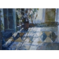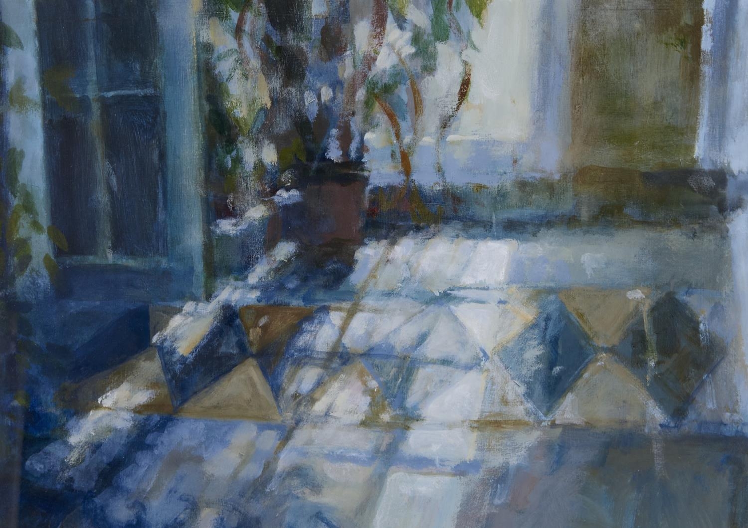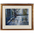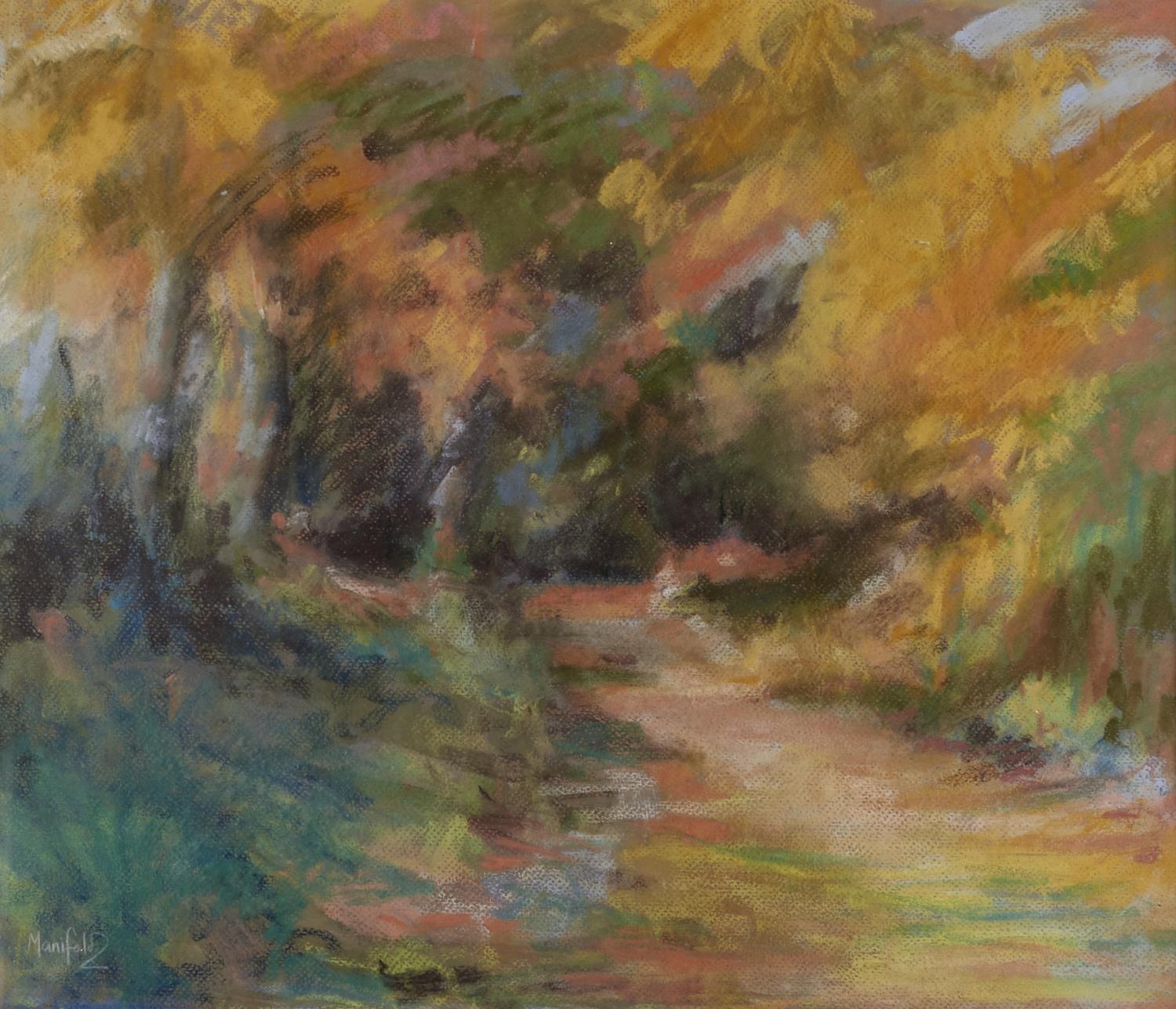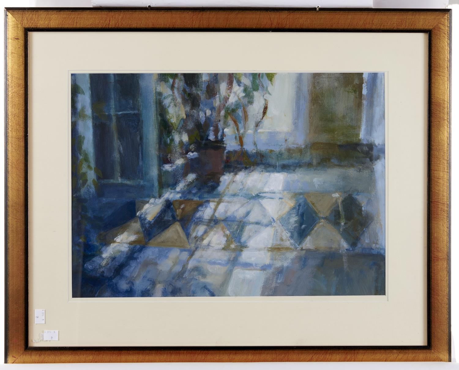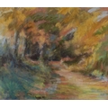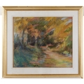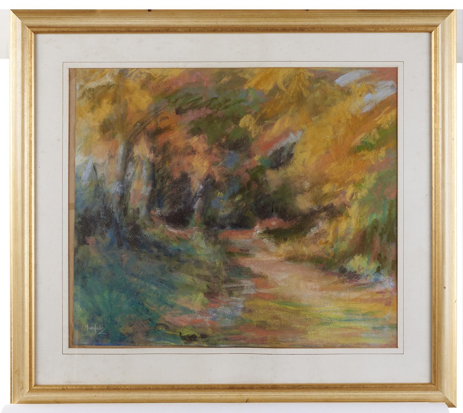 Debra Manifold RI, PS (1961-2020) - A Sunlit Wooded Lane, pastel, 49 x 57cm and a Still Life of a Pot Plant in a Sunlit Window by the same (2)