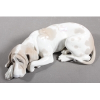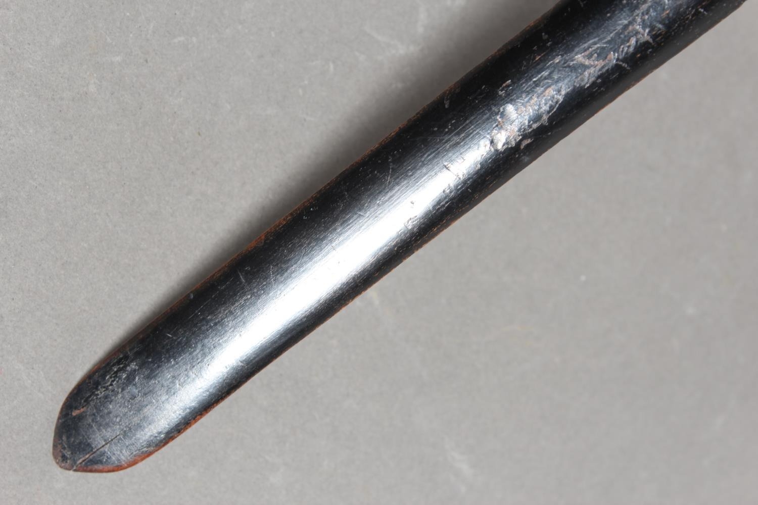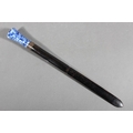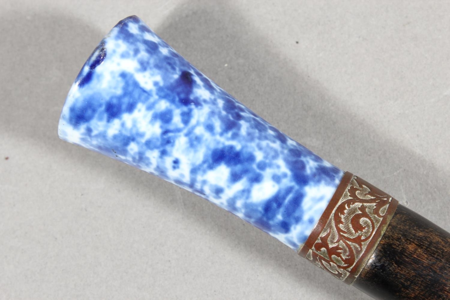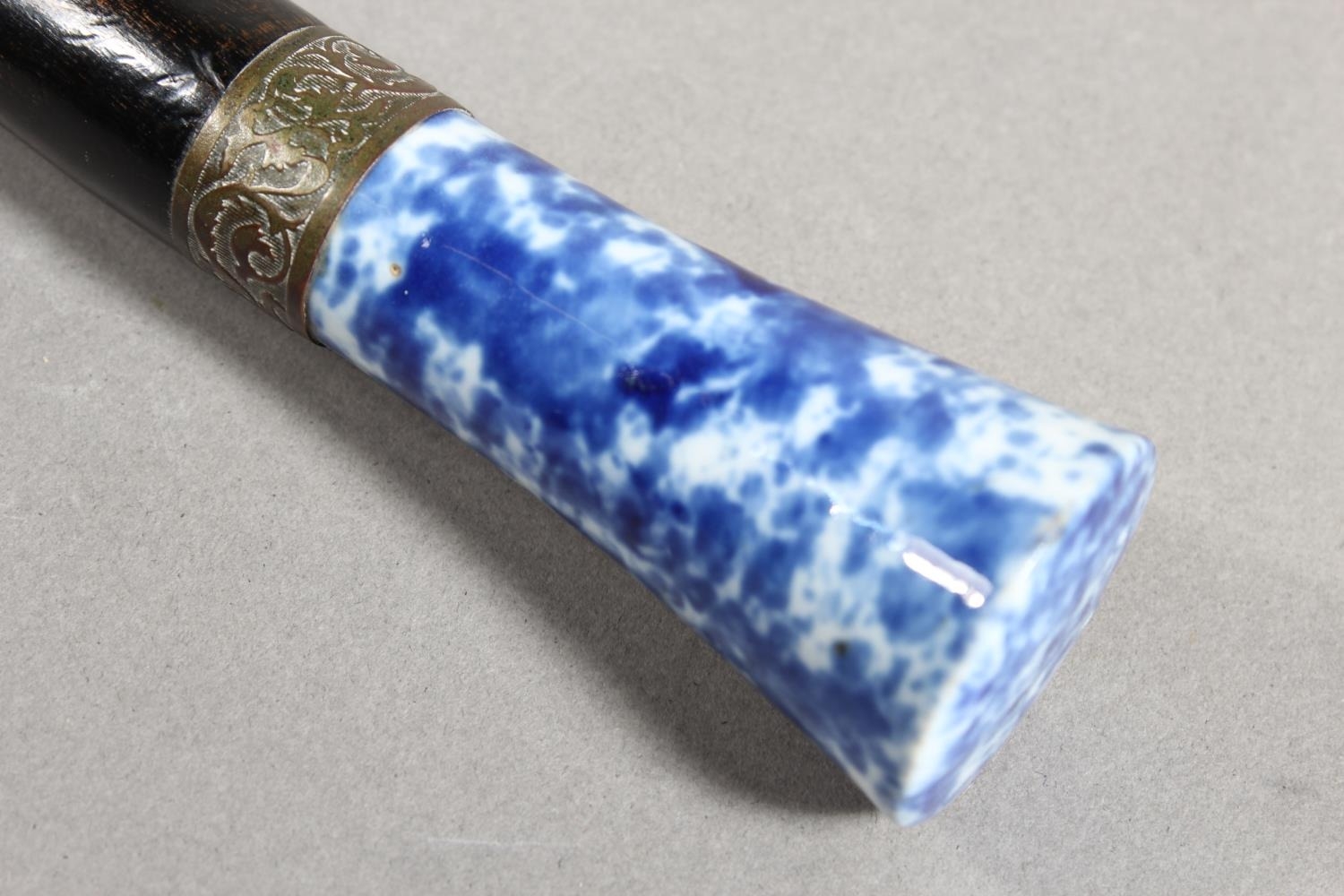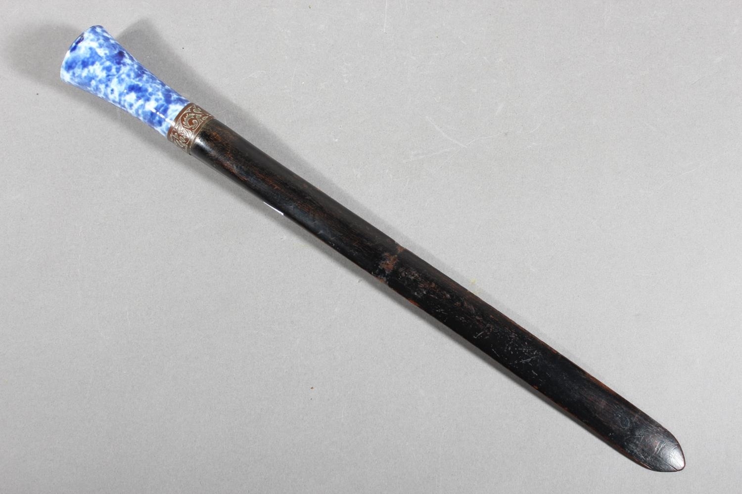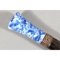 Chinese style paper knife with mottled blue and white porcelain handle, 36cm long.