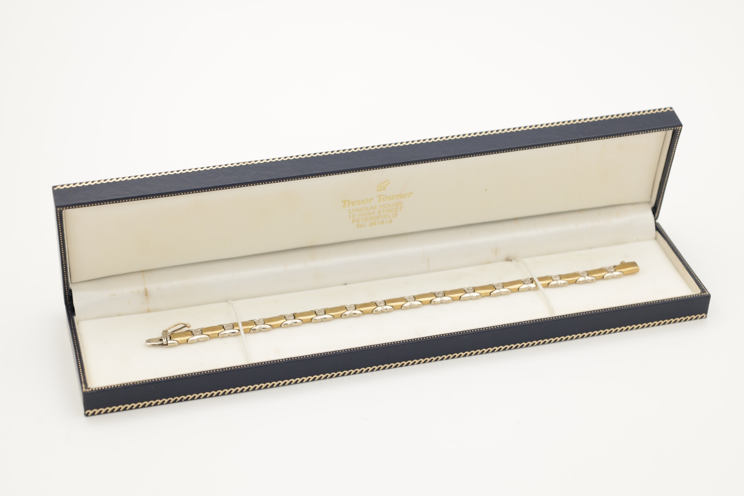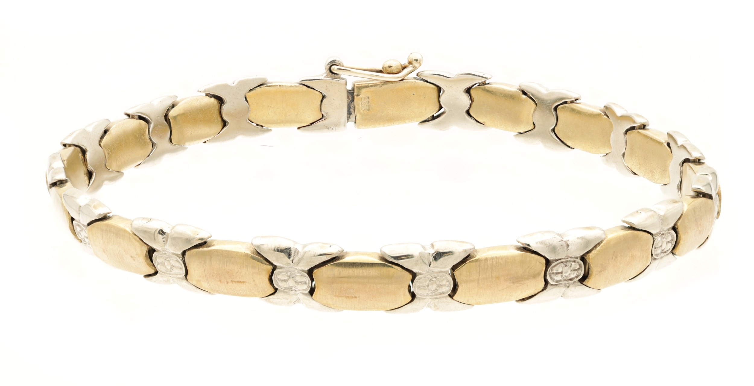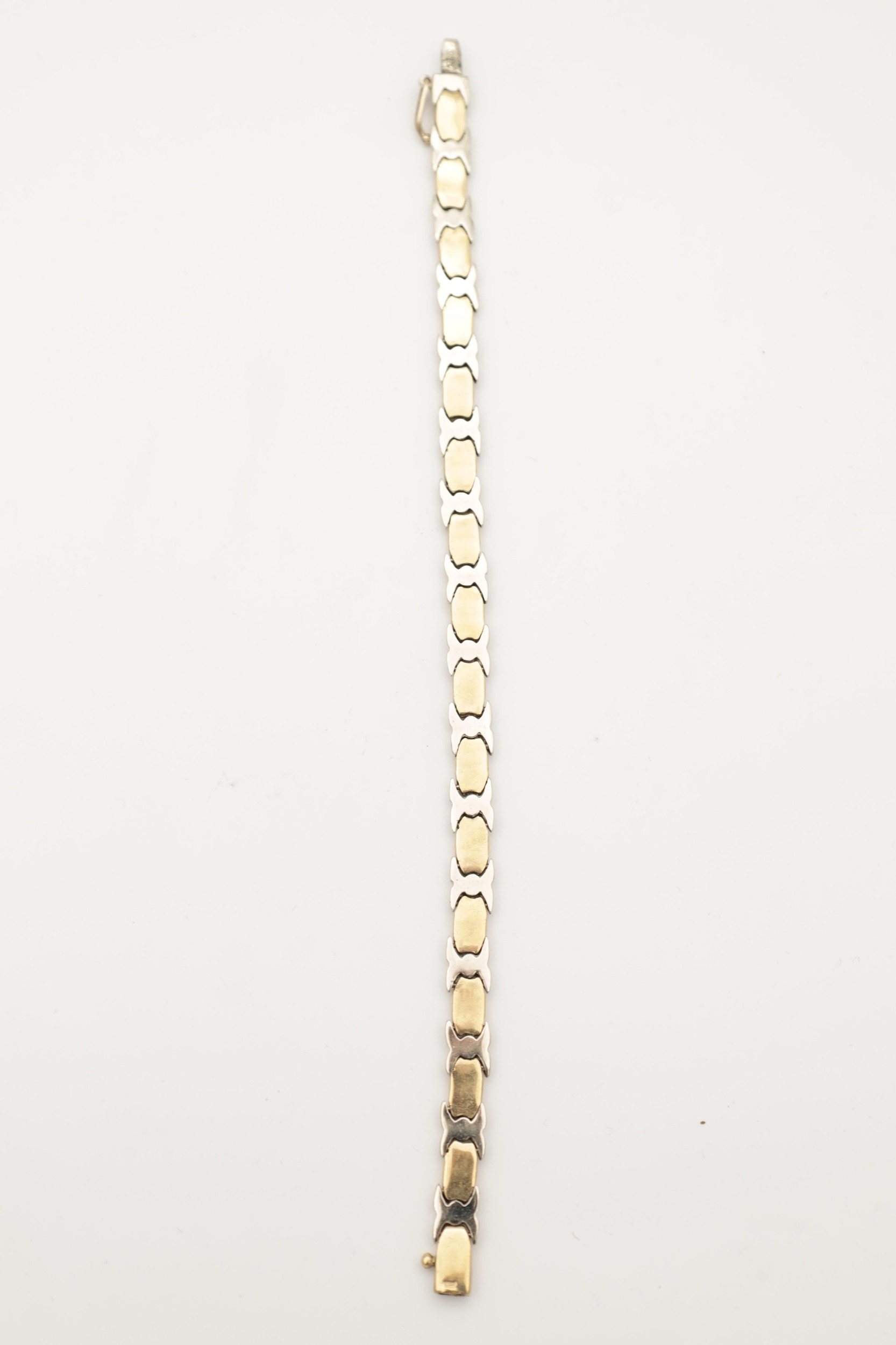 A 9CT WHITE AND YELLOW GOLD BRACELET composed of alternating brushed yellow-gold panels and polished white-gold X-form links, fitted with a hinged clasp and safety catch. Total weight app. 14.4g. (Length 19cm)
