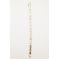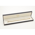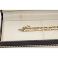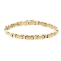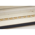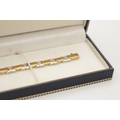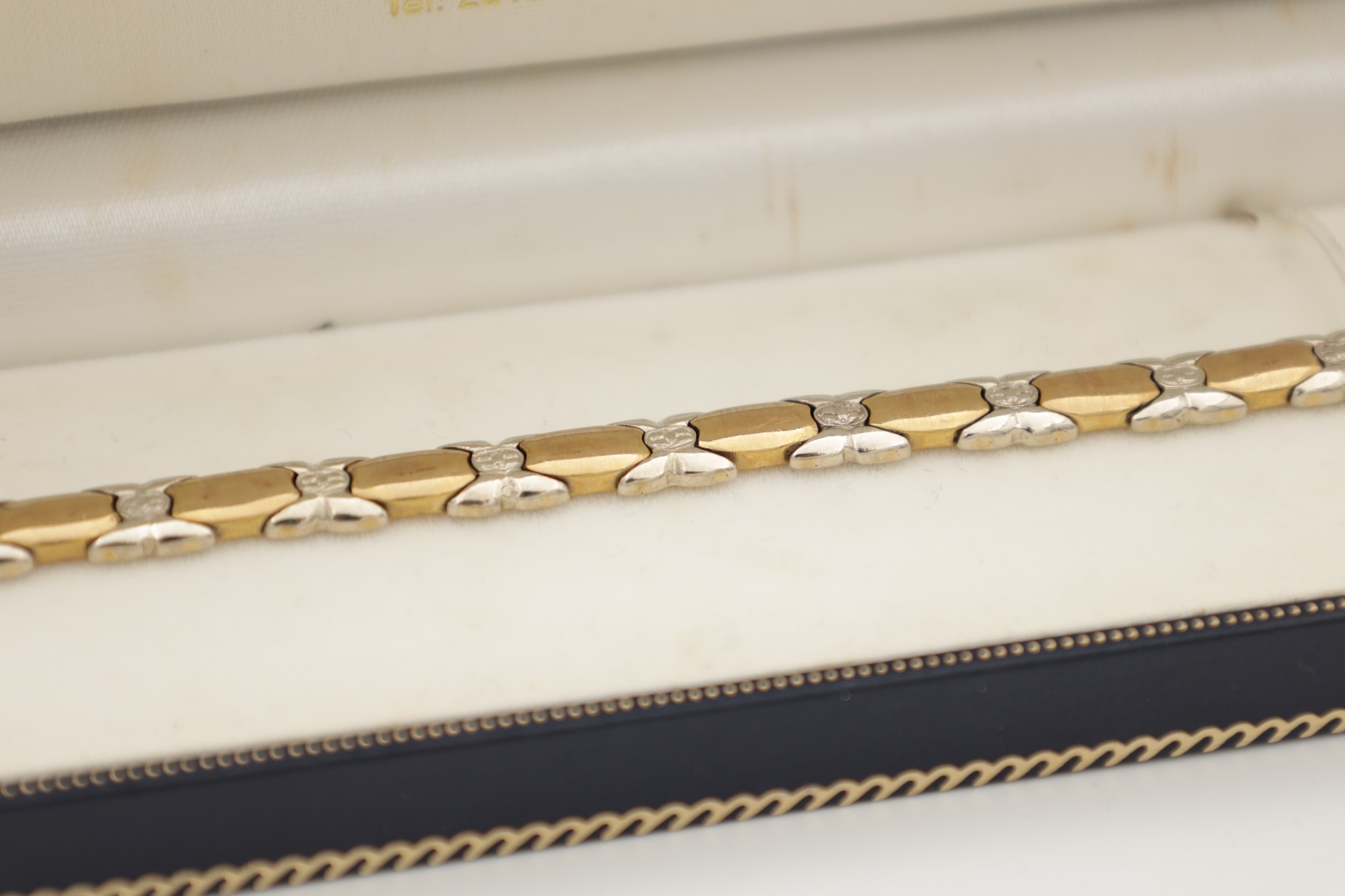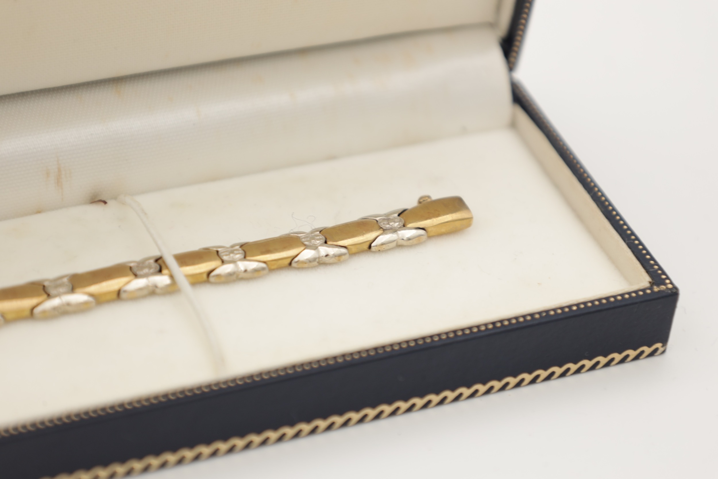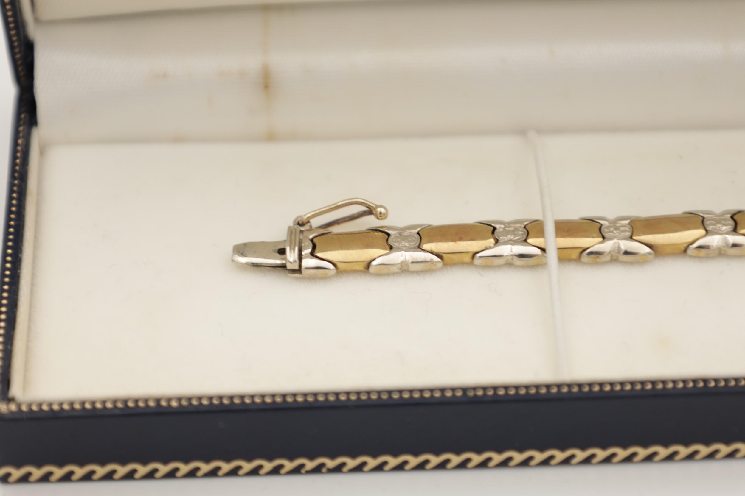 A 9CT WHITE AND YELLOW GOLD BRACELET composed of alternating brushed yellow-gold panels and polished white-gold X-form links, fitted with a hinged clasp and safety catch. Total weight app. 14.4g. (Length 19cm)