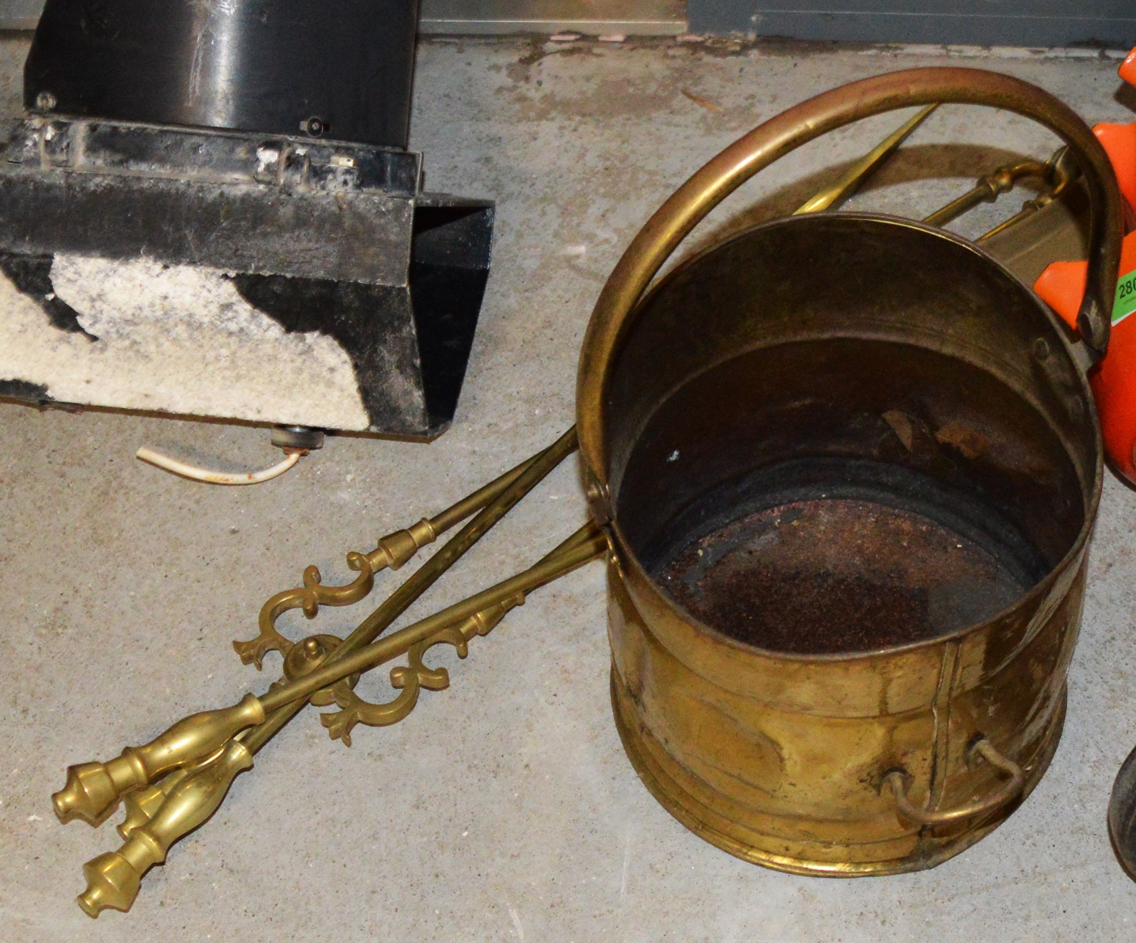 Collection Brass Fire-Side Items: Shovel, Tongs, Poker and Small Scuttle