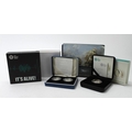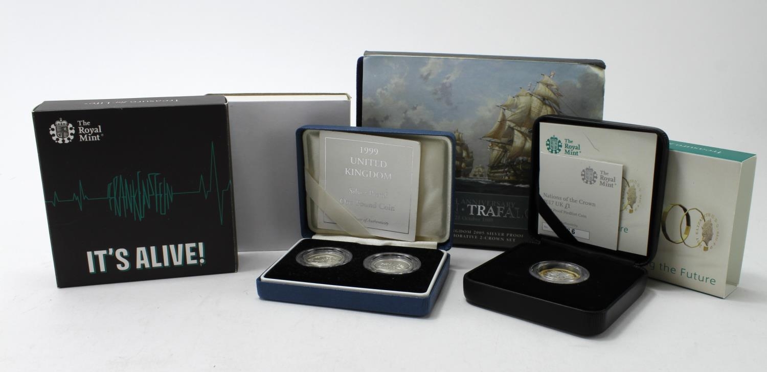 GB & Gibraltar silver proof/BU cased coins x7 (in 5 cases) including Nelson & Trafalgar 2-coin set.