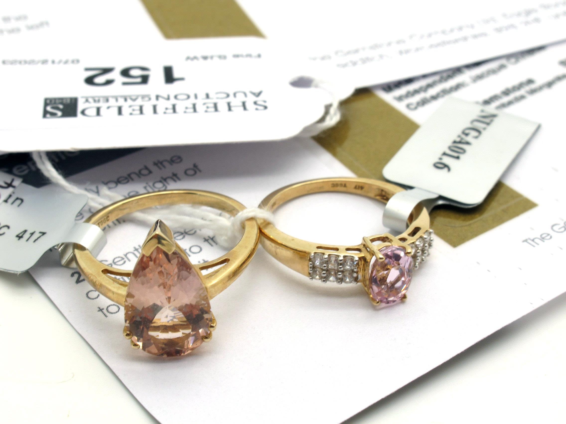 The Genuine Gemstone Company Ltd; A 9ct Gold 3.67ct Zambezia Morganite Single Stone Ring, the pear shape stone claw set, between plain shoulders (finger size O), A 9ct Gold Minas Gerais Kunzite and White Zircon dress ring, claw set centre, between two row inset shoulders (finger size M) (total weight 5 grams) (2).