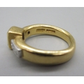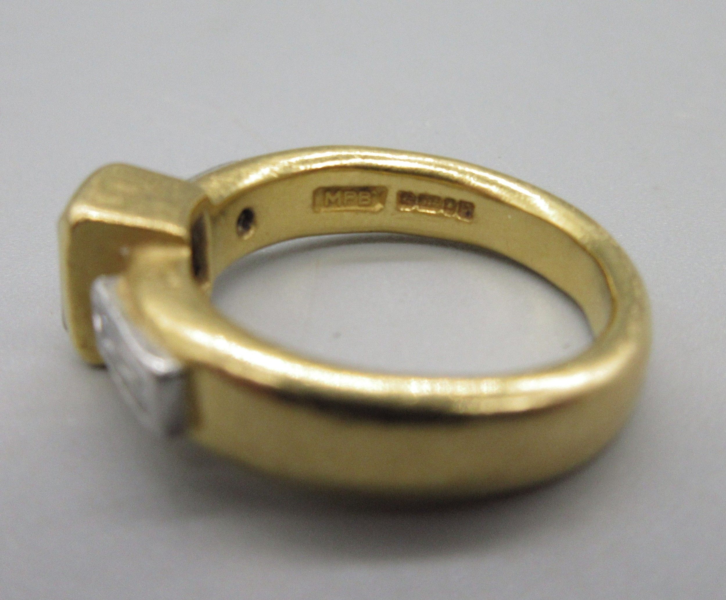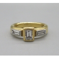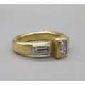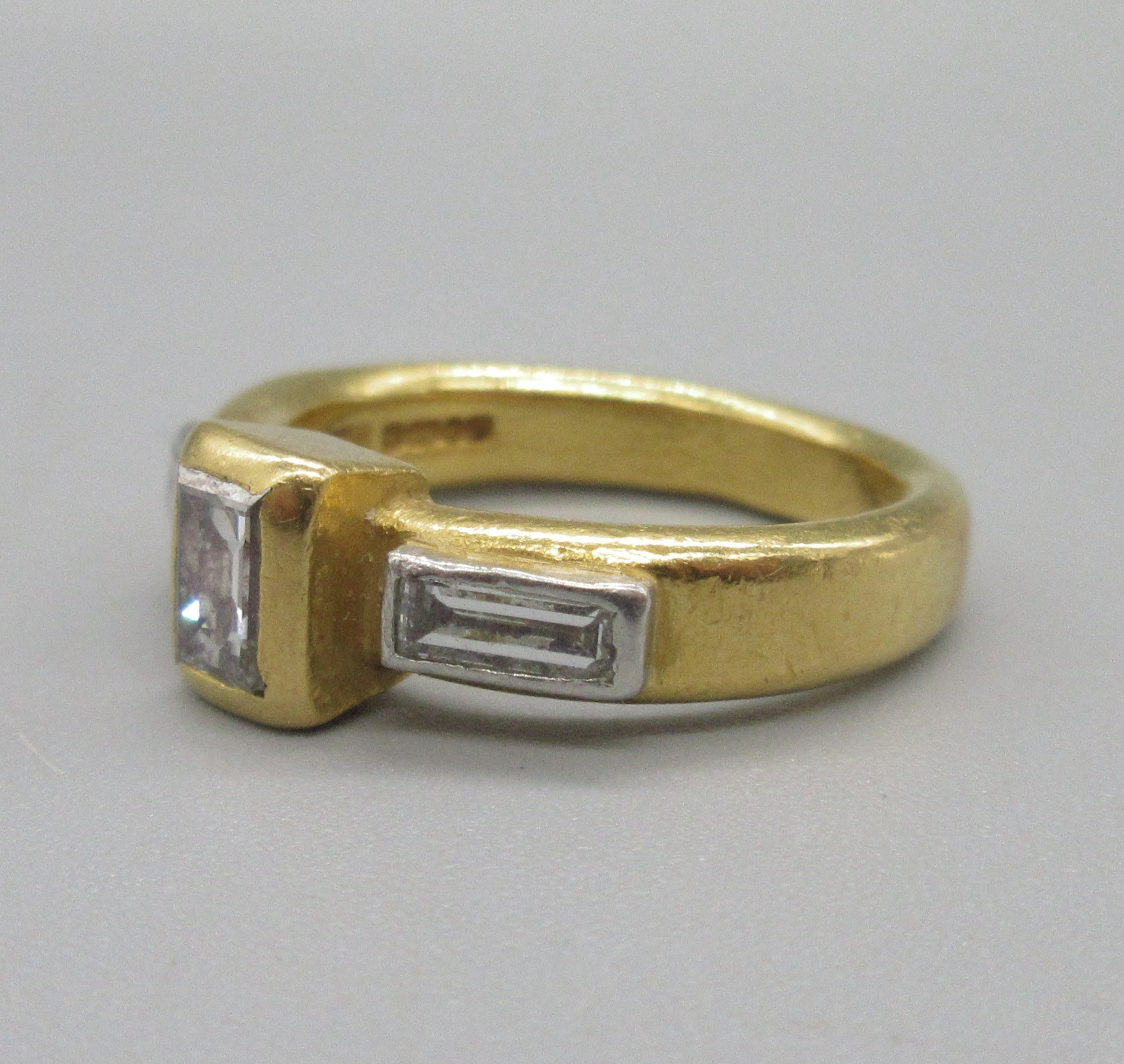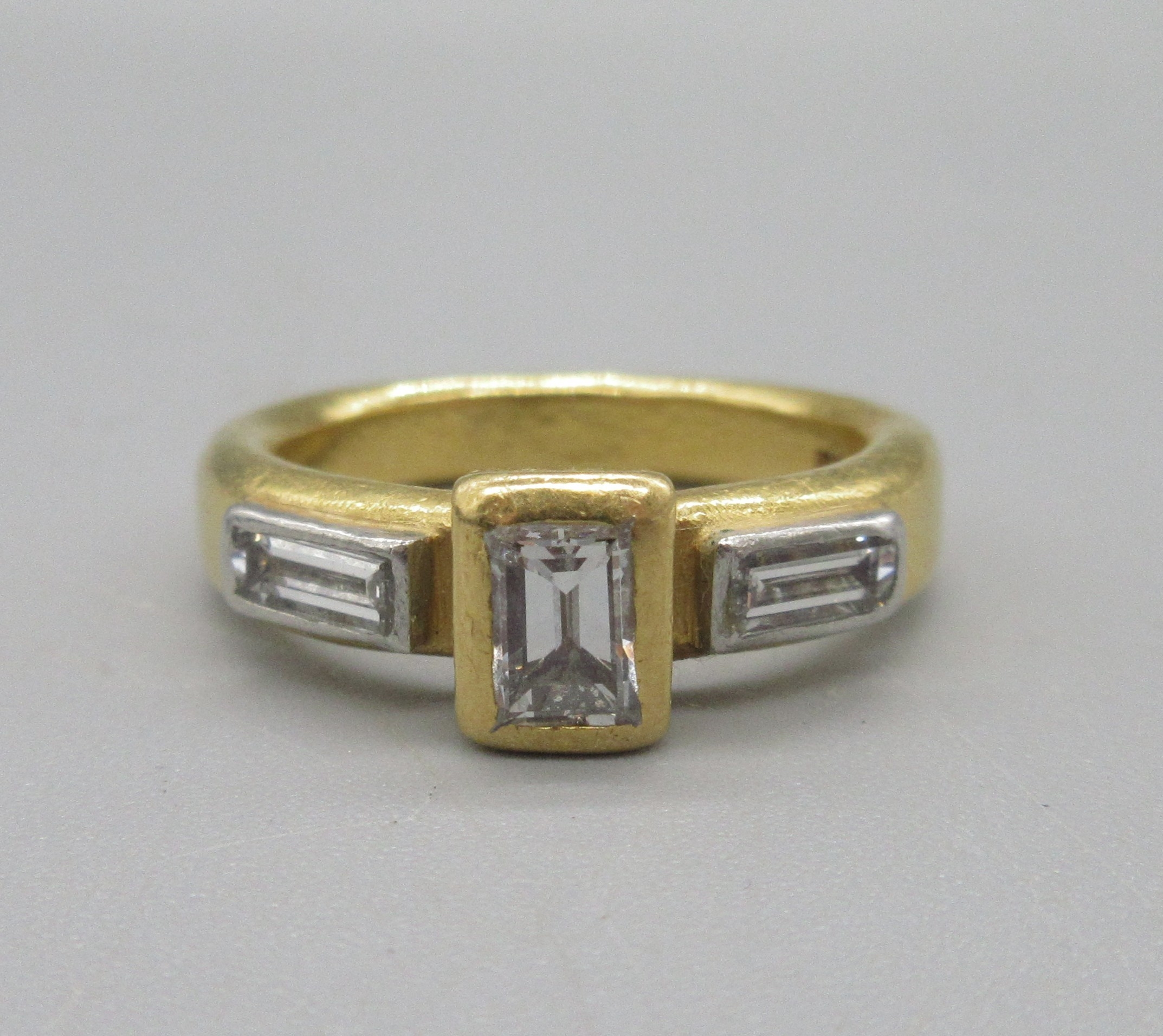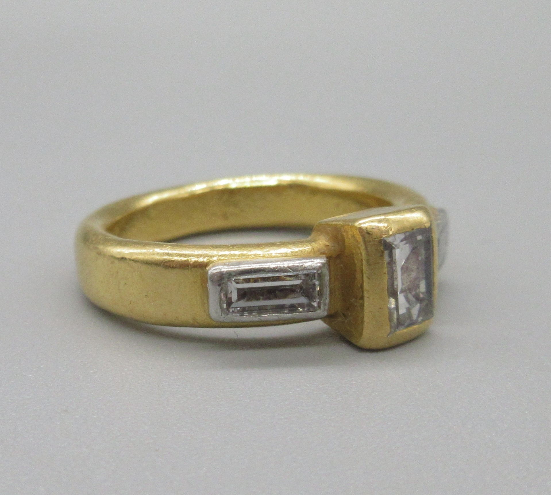 Malcolm Betts 22ct yellow gold diamond ring, set with three baguette cut diamonds, stamped 916, size L, 9.1g