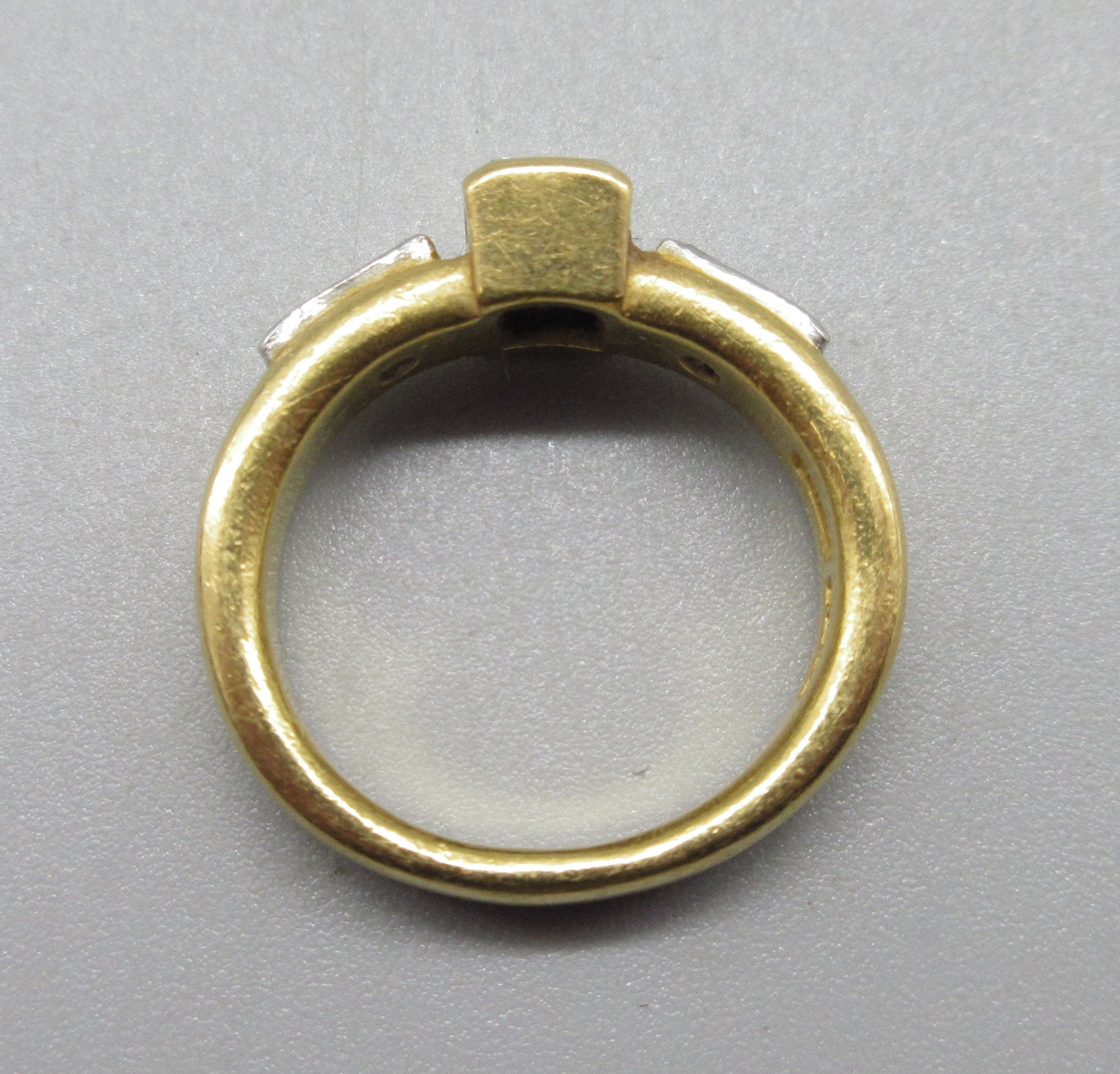 Left flanked diamond: light surface scratching, right side setting worn, minimal inclusions, possibly base setting rather than the stone, small chip to top left corner.