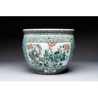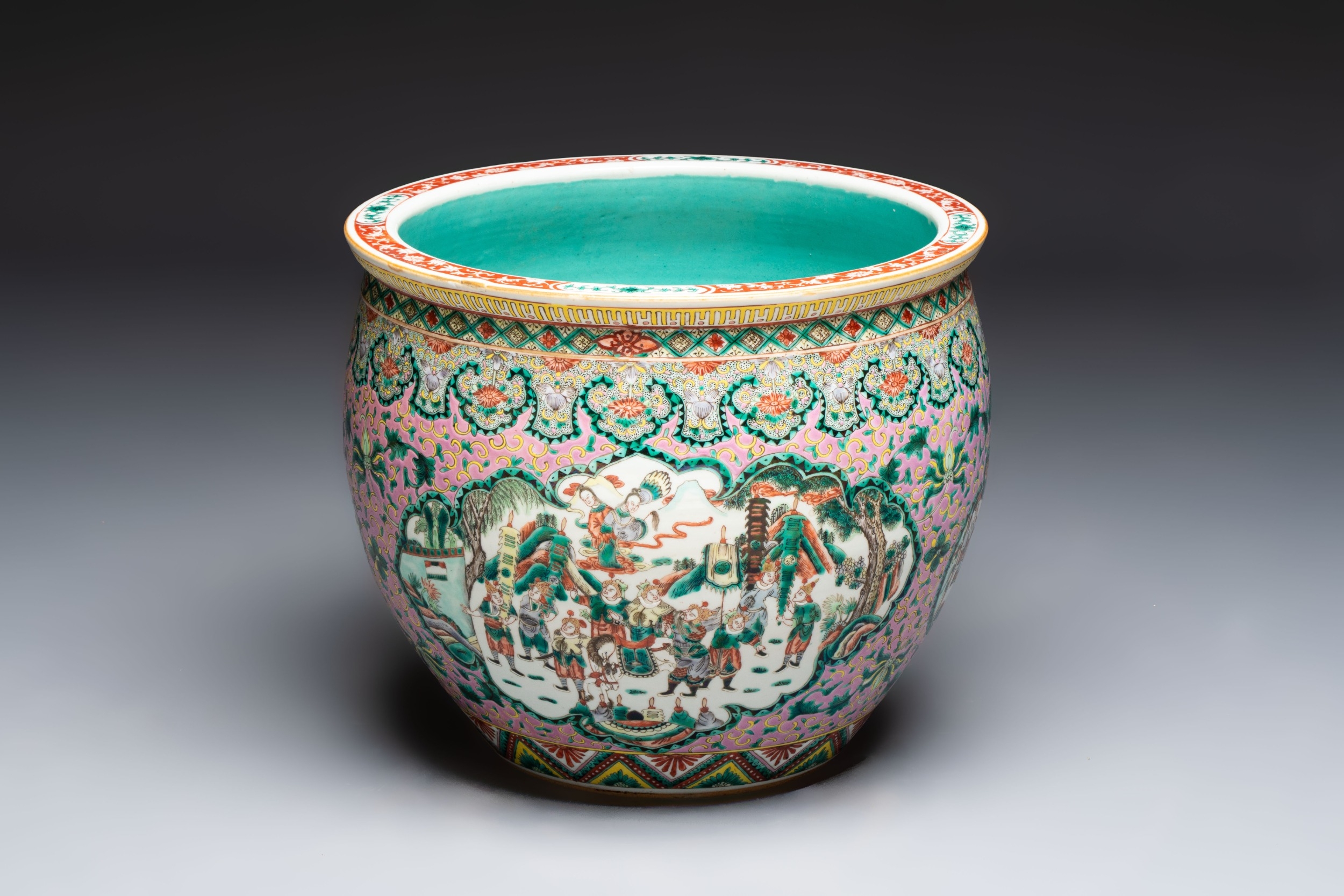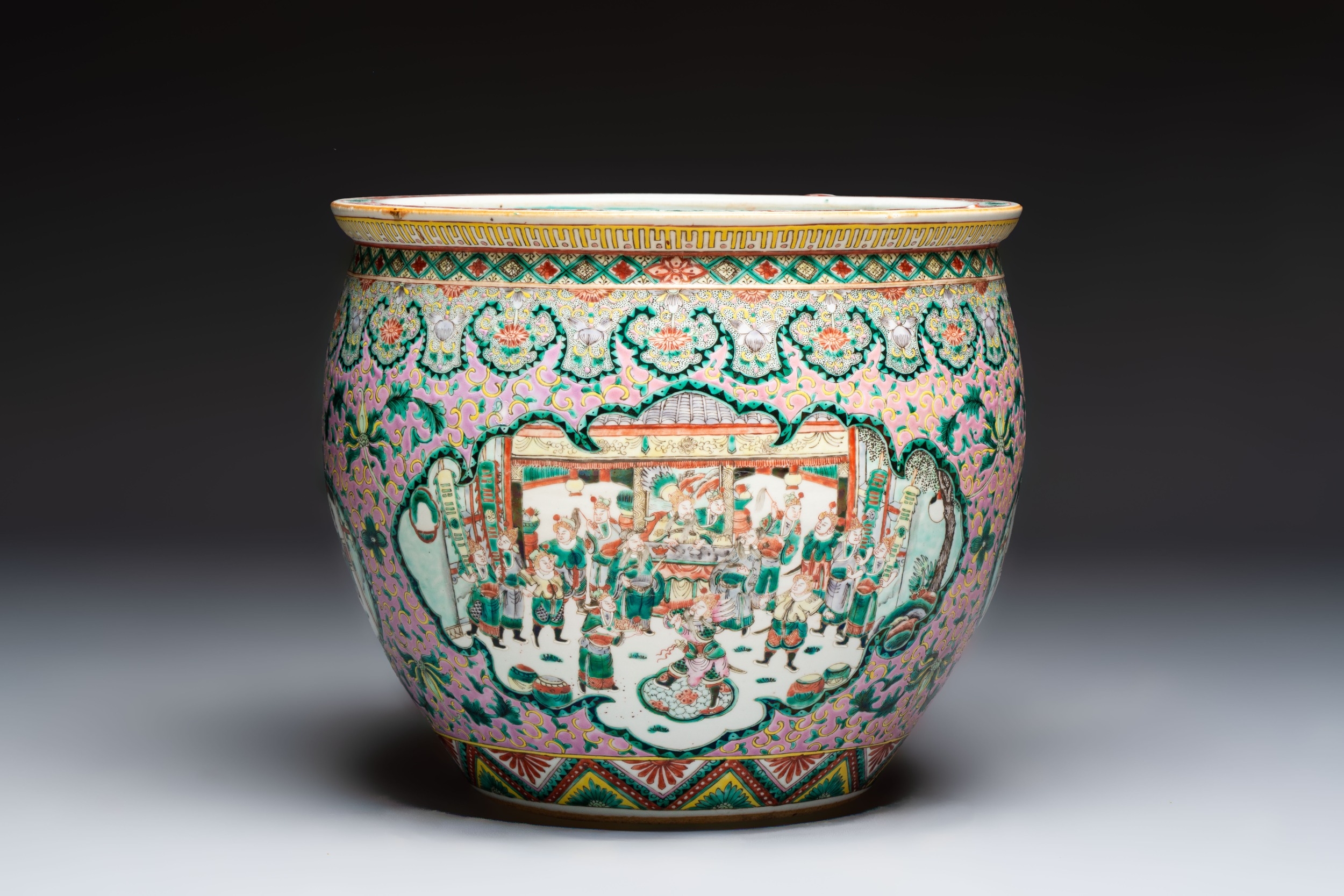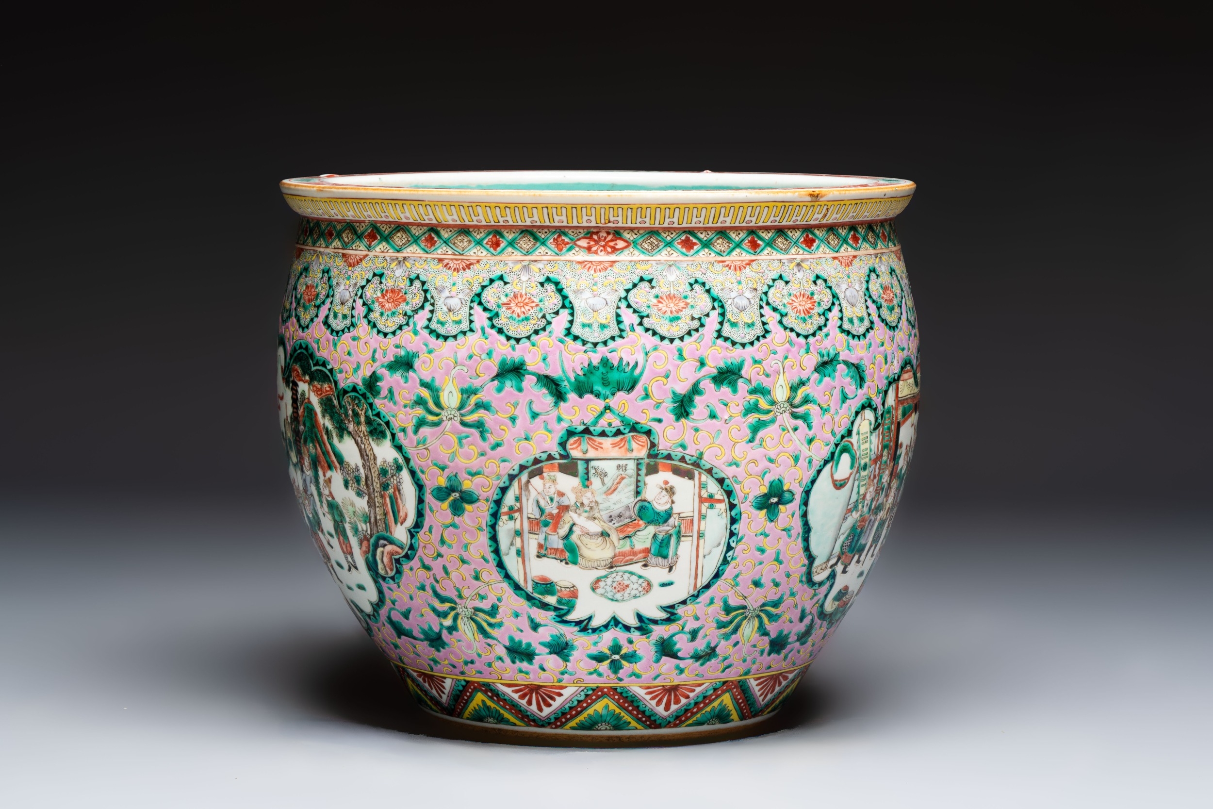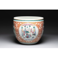 A Chinese famille verte pink-ground scroll pot with narrative design, 19th C.