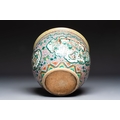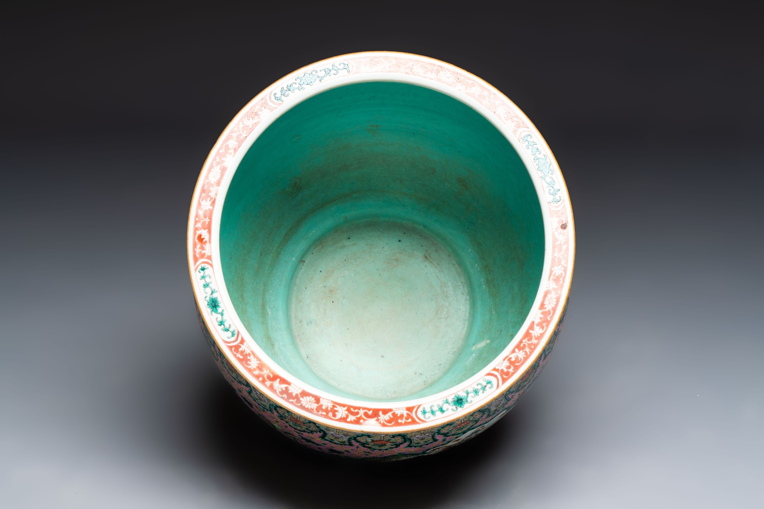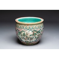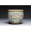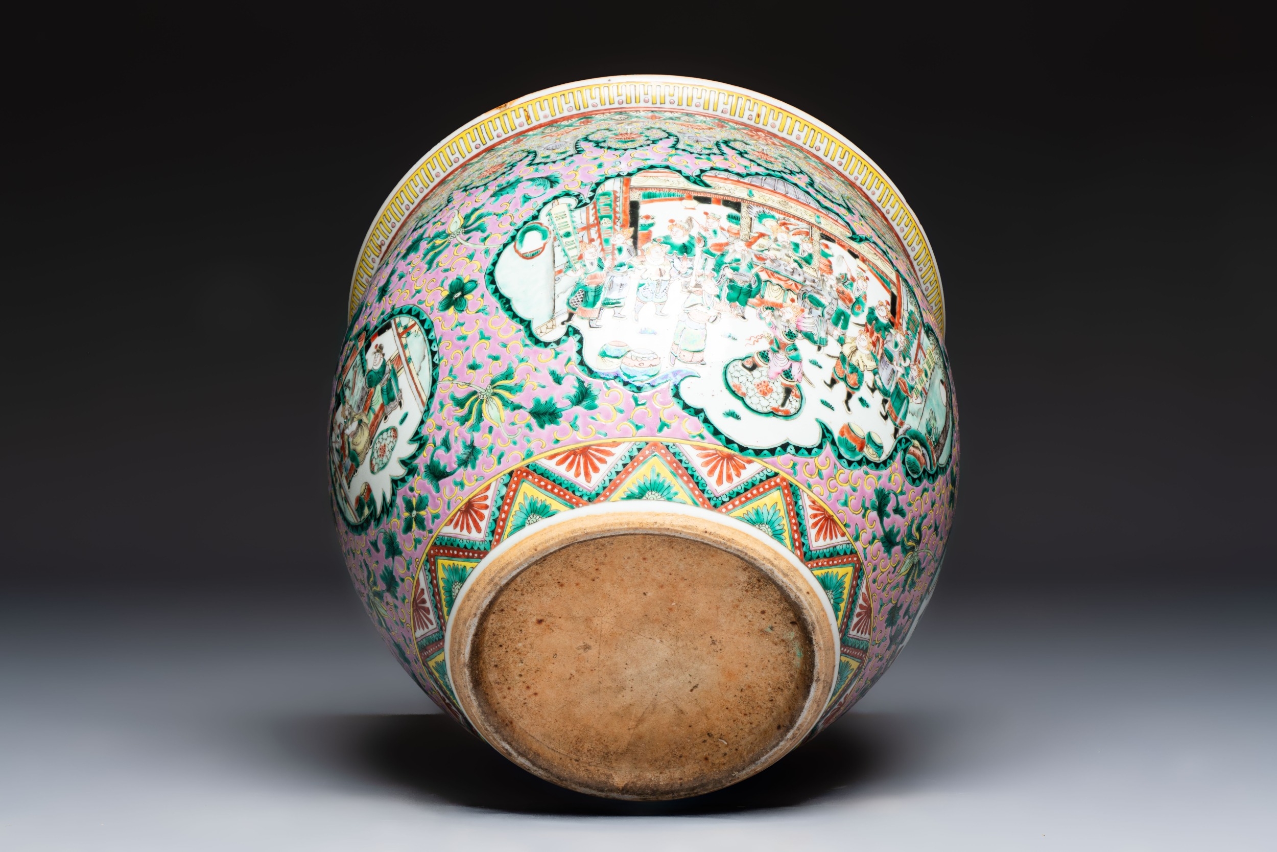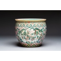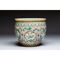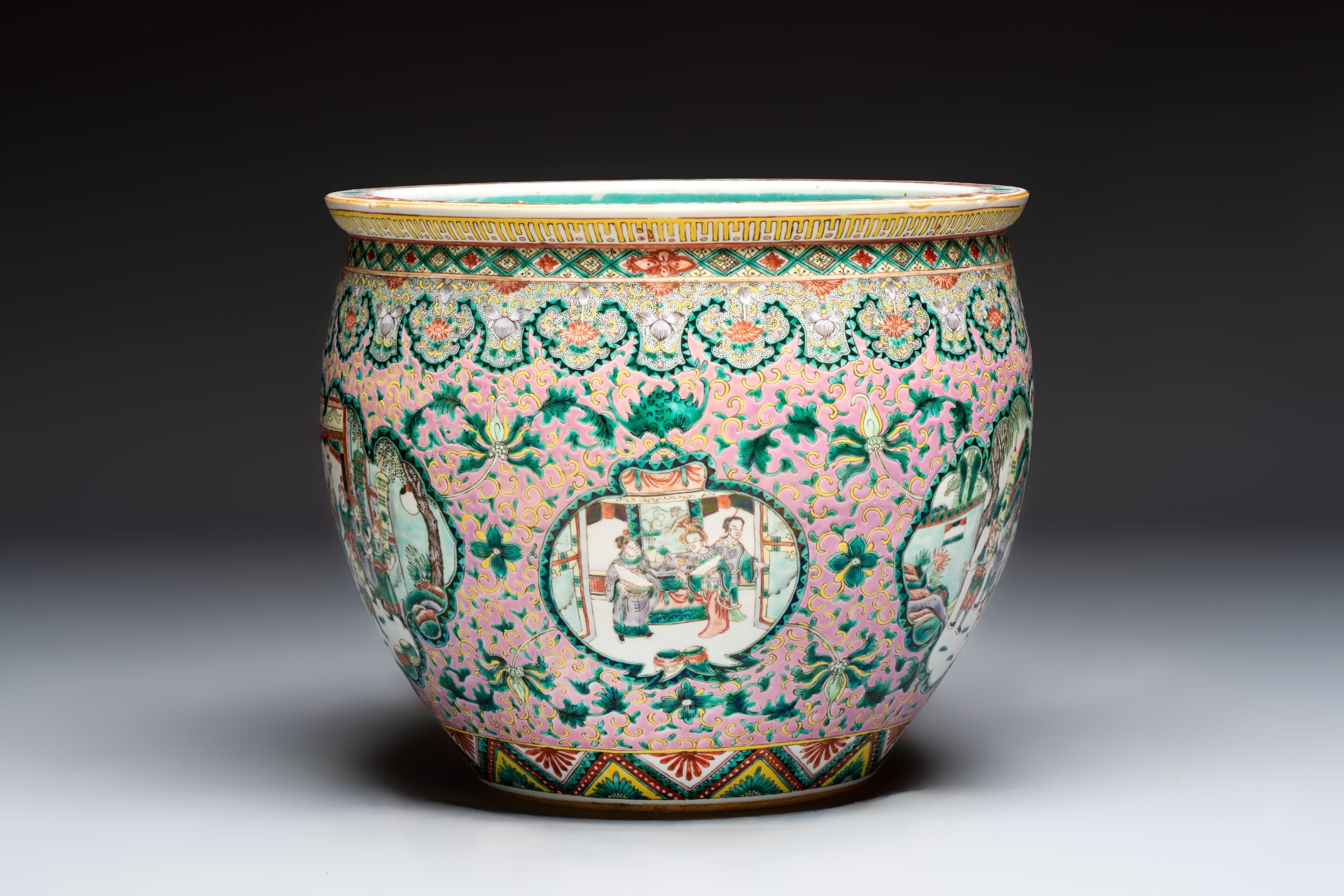 A Chinese famille verte pink-ground scroll pot with narrative design, 19th C.