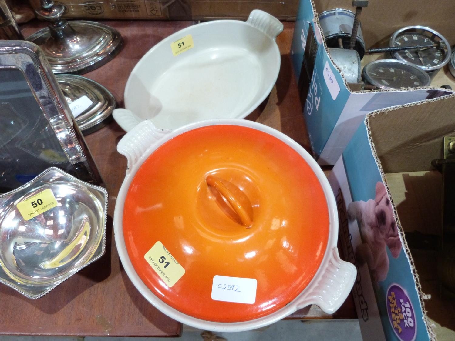 A Le Creuset 22 casserole and cover and a Cousances oval dish