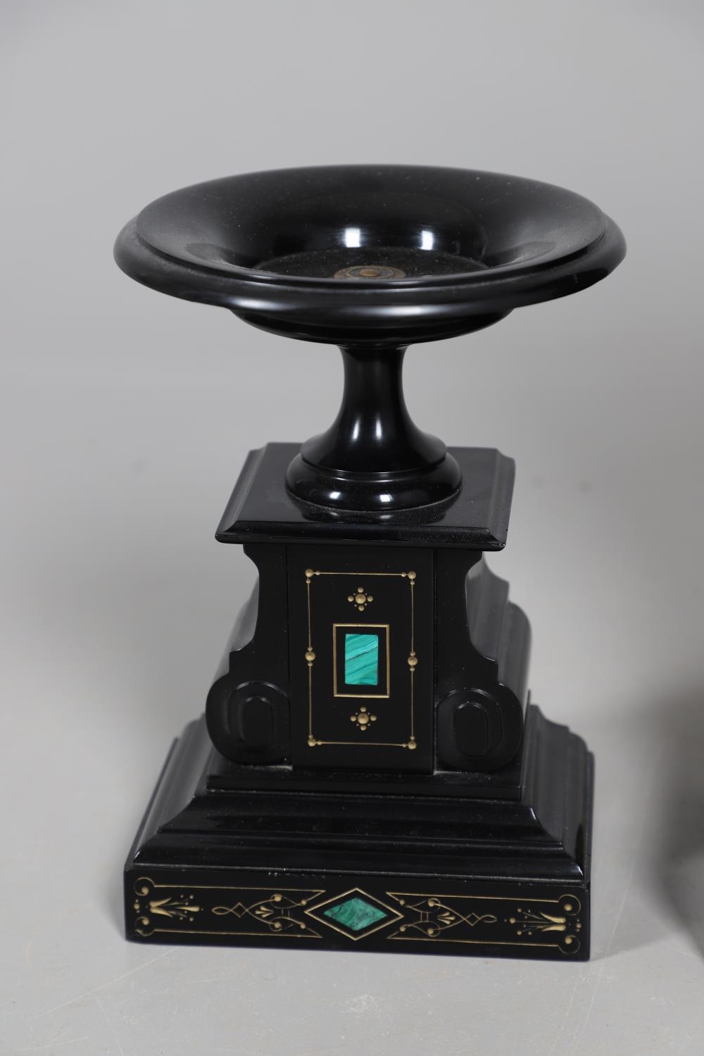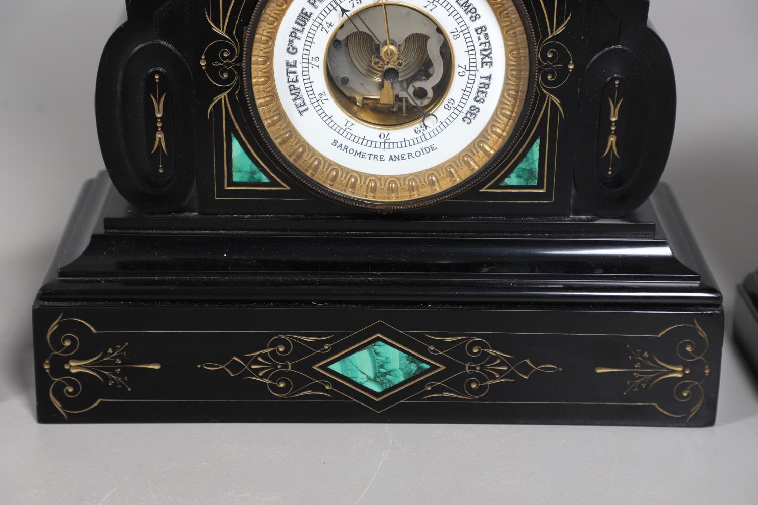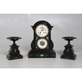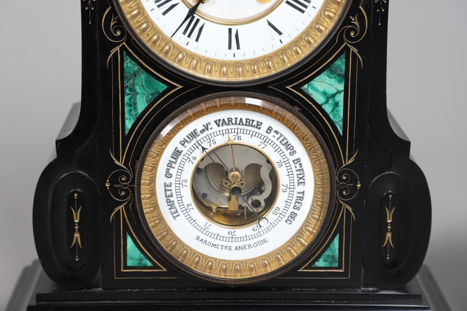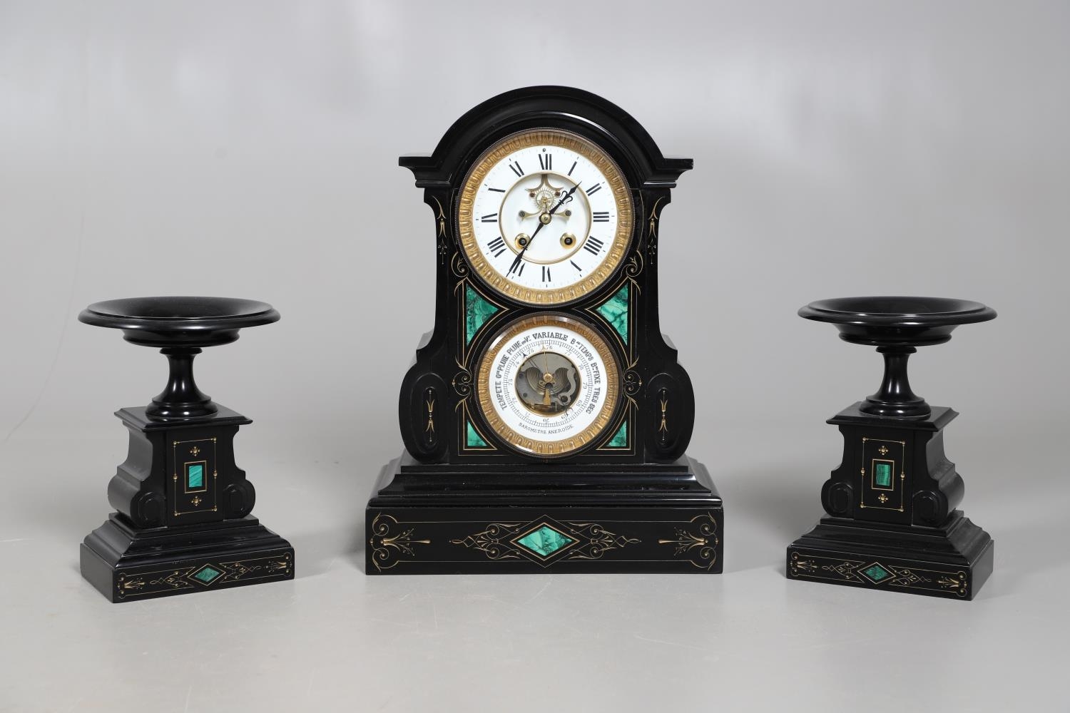 A 19TH CENTURY BLACK SLATE MANTEL CLOCK AND MALACHITE GARNITURE. the 5.5" white chapter ring to a visible counterwheel and eight day movement striking on a bell, with circular aneroid barometer below, the case set with malachite inlay and ornate gilt detail, height 49cm, width 36cm; together with a pair of matching pedestal tazzas on stepped bases, height 27cm.
