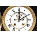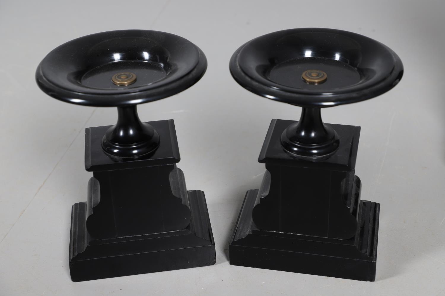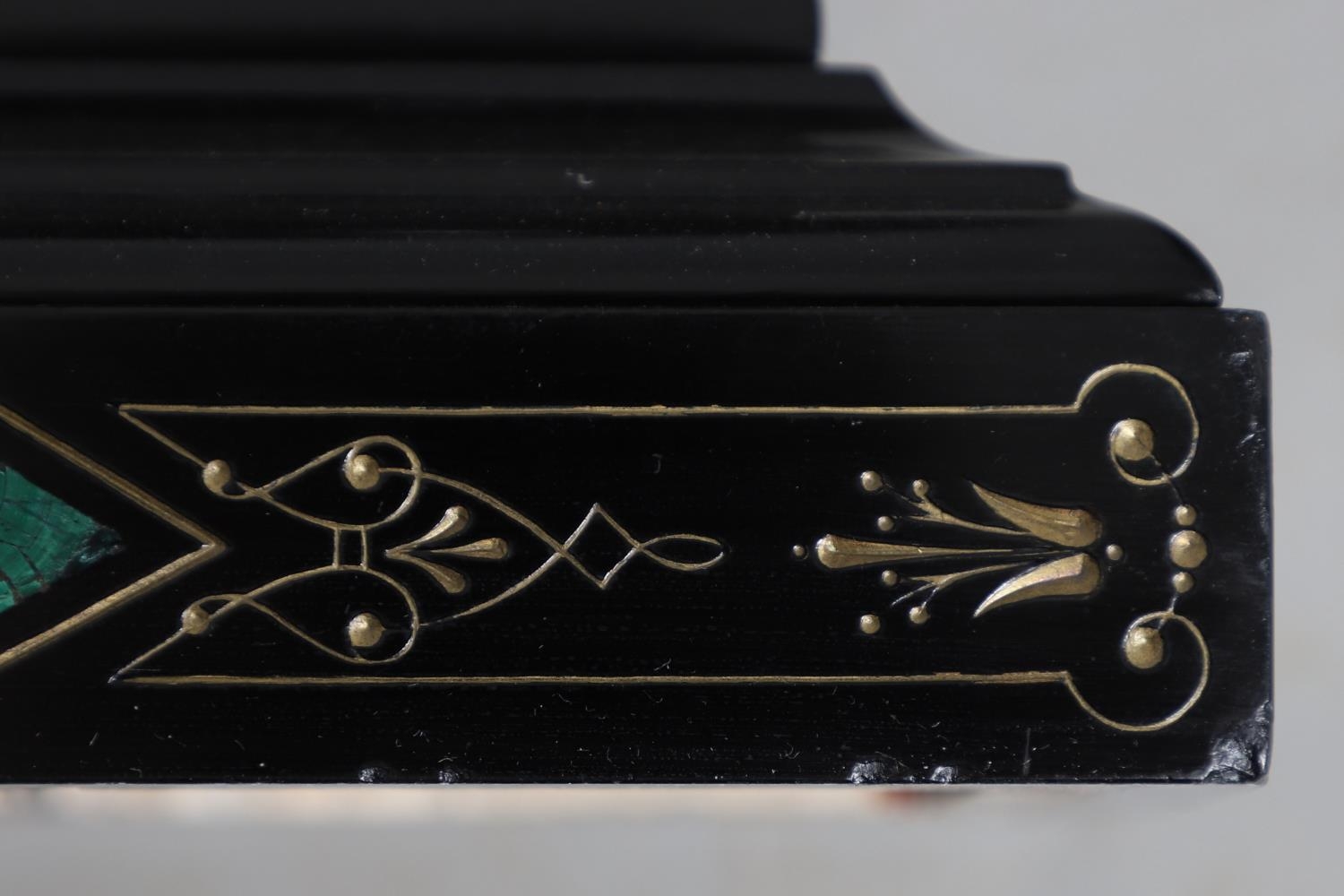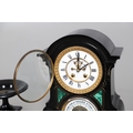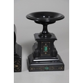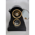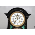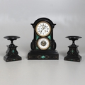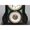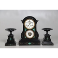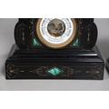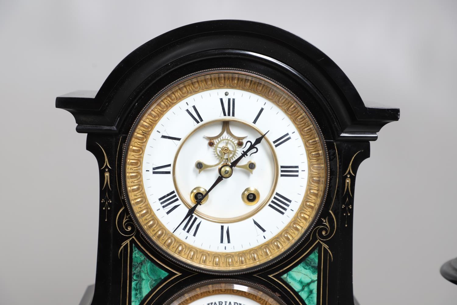 A 19TH CENTURY BLACK SLATE MANTEL CLOCK AND MALACHITE GARNITURE. the 5.5" white chapter ring to a visible counterwheel and eight day movement striking on a bell, with circular aneroid barometer below, the case set with malachite inlay and ornate gilt detail, height 49cm, width 36cm; together with a pair of matching pedestal tazzas on stepped bases, height 27cm.
