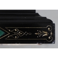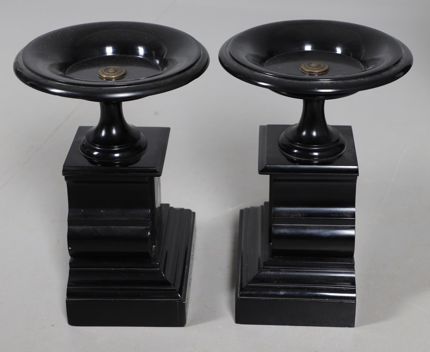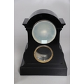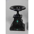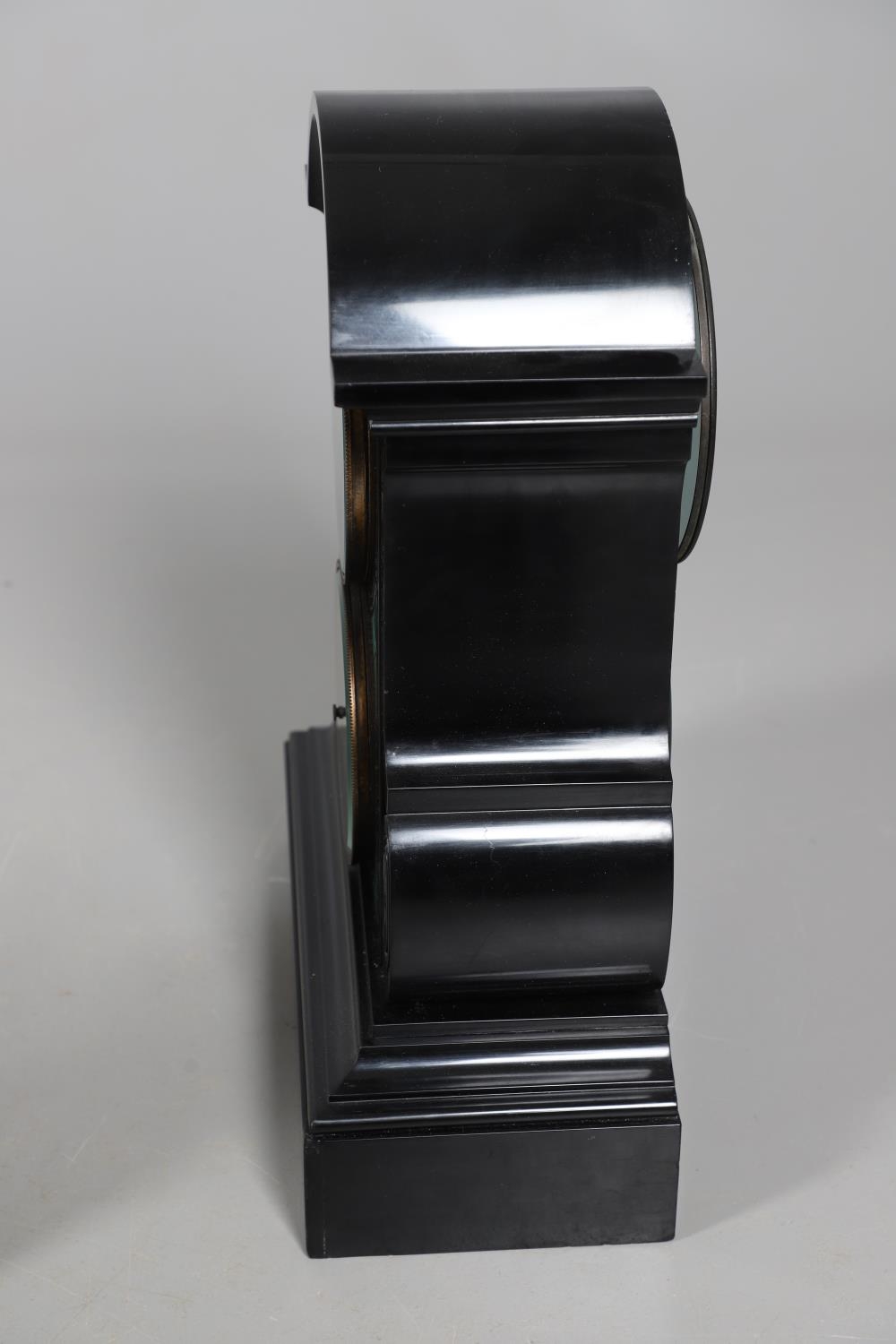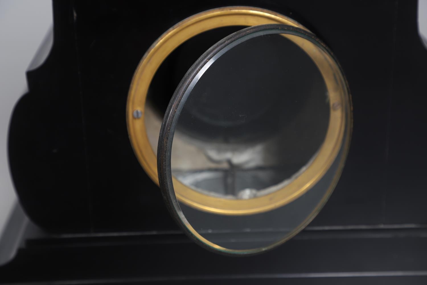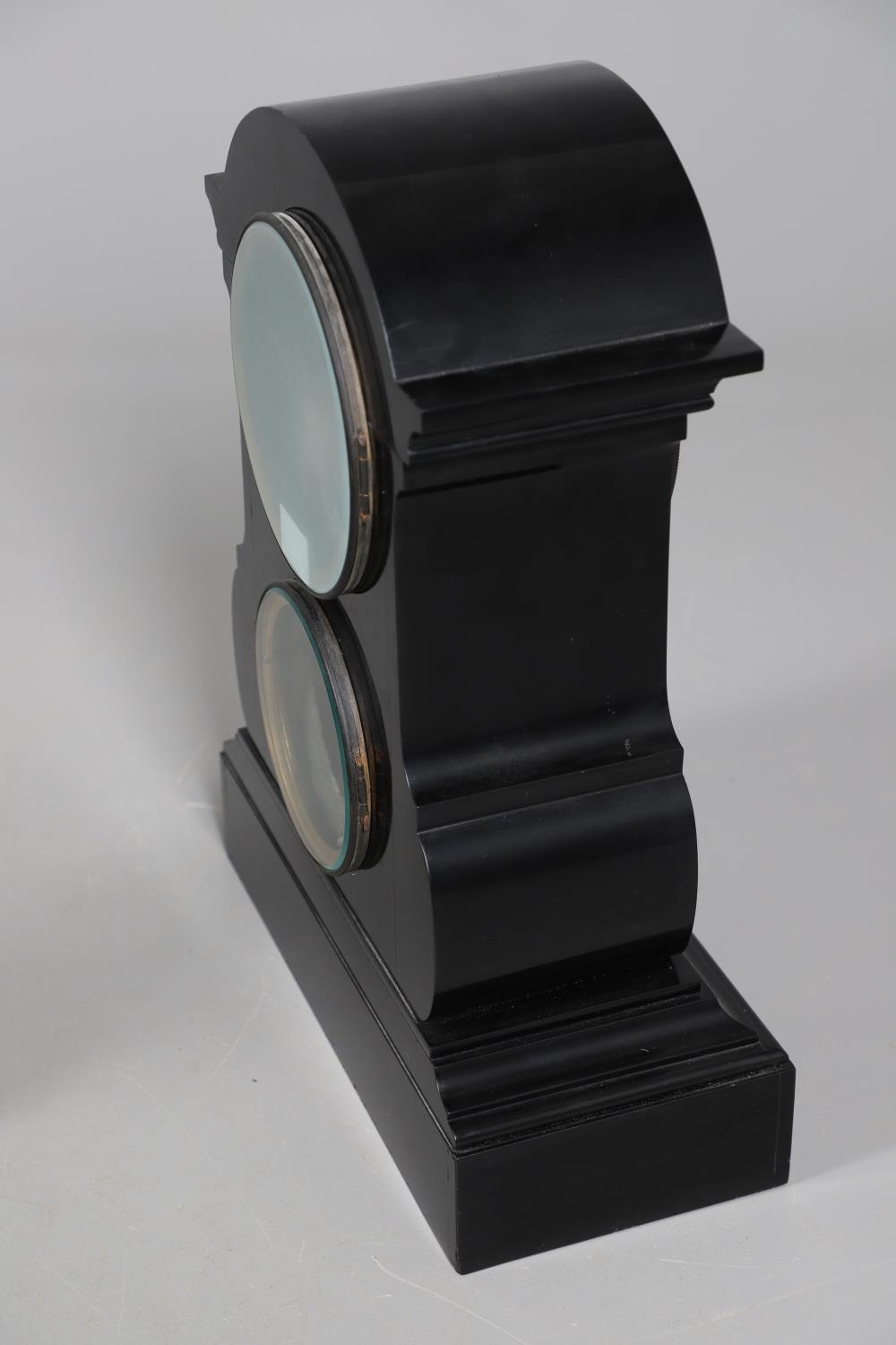A 19TH CENTURY BLACK SLATE MANTEL CLOCK AND MALACHITE GARNITURE. the 5.5" white chapter ring to a visible counterwheel and eight day movement striking on a bell, with circular aneroid barometer below, the case set with malachite inlay and ornate gilt detail, height 49cm, width 36cm; together with a pair of matching pedestal tazzas on stepped bases, height 27cm.