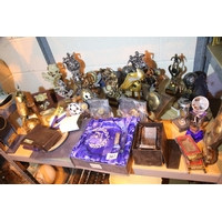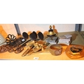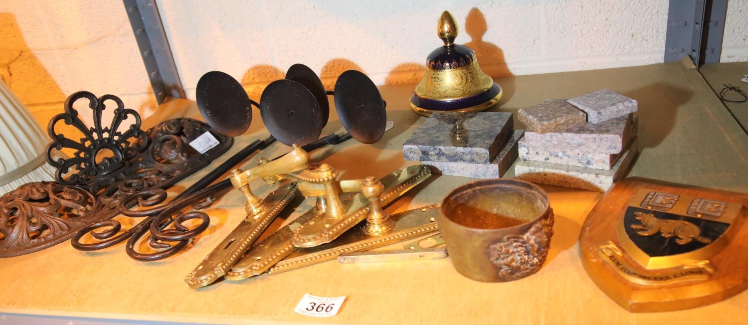 Mixed shelf of items including metalware, brass handles and marble pieces. Not available for in-house P&P, contact Paul O'Hea at Mailboxes on 01925 659133