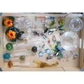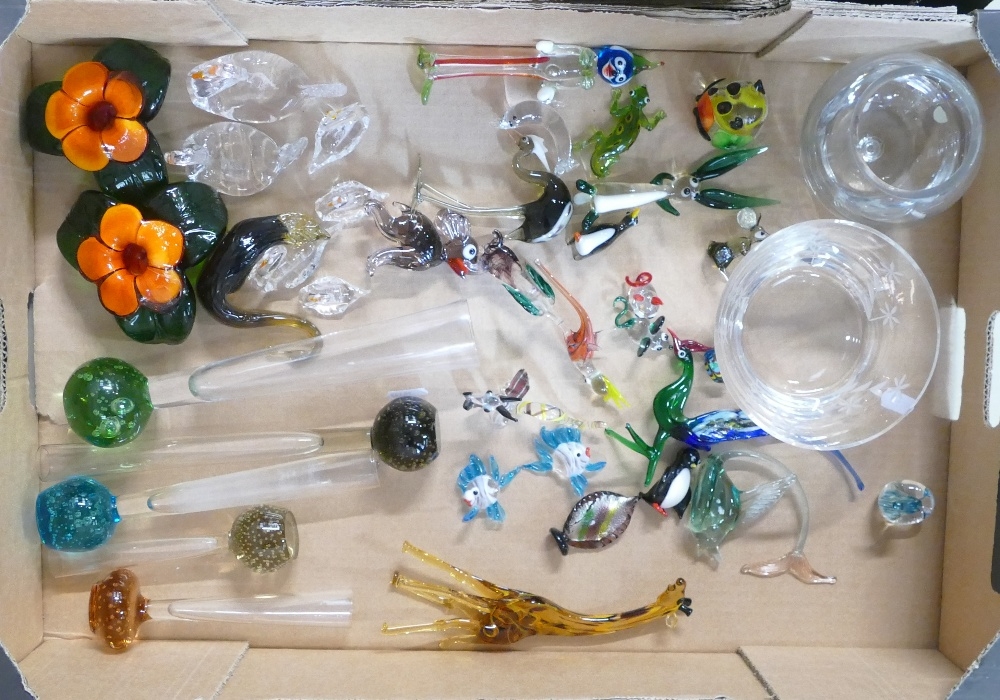 A selection of delicate coloured glass depicting animals to include:- lizard, fish, peacock, stork, giraffe, penguins, swans, elephant together with single flower vases and two floral candle sticks, etc(1tray)