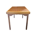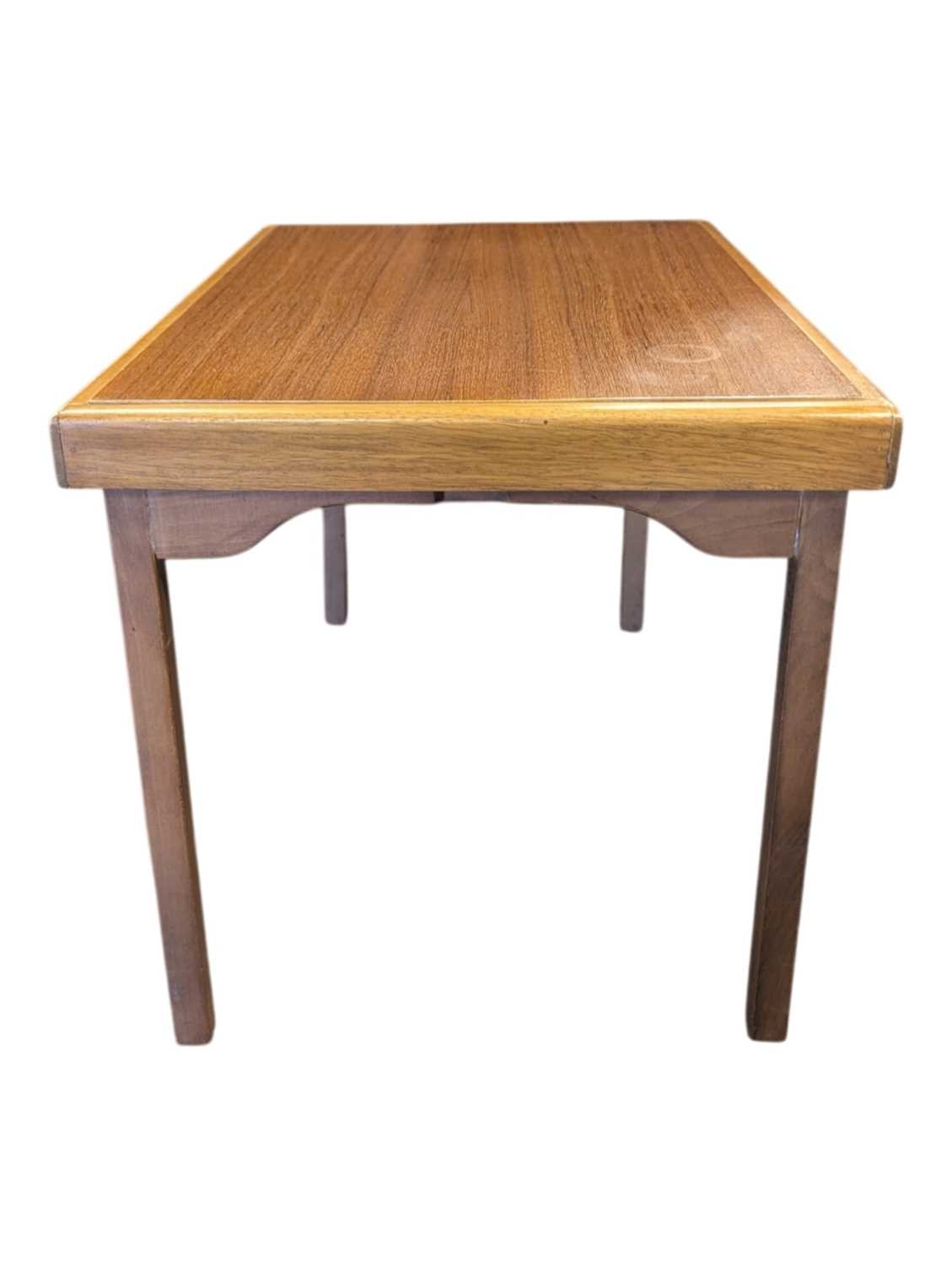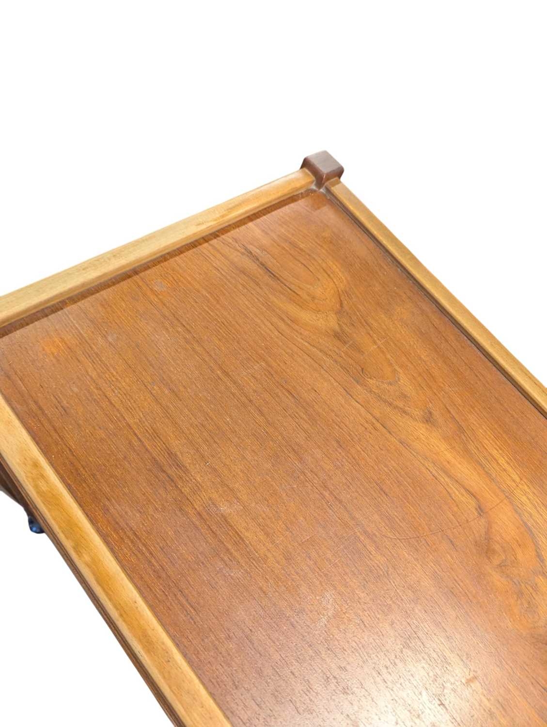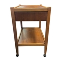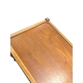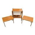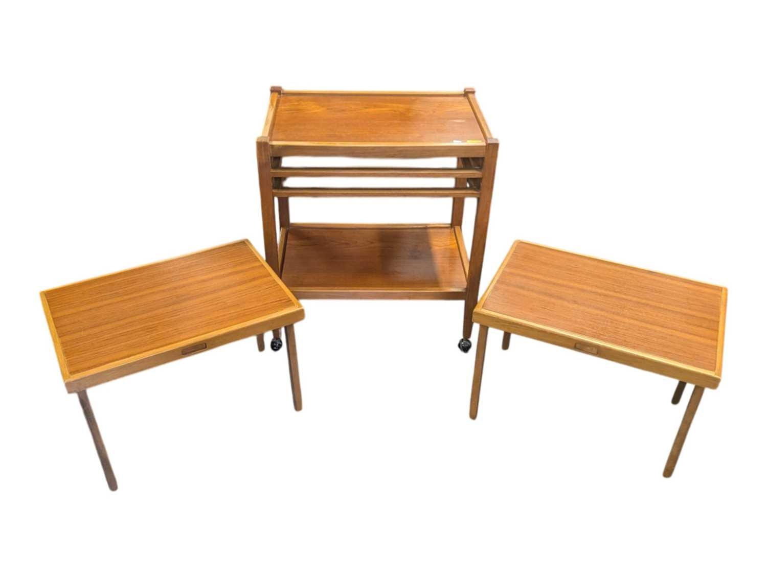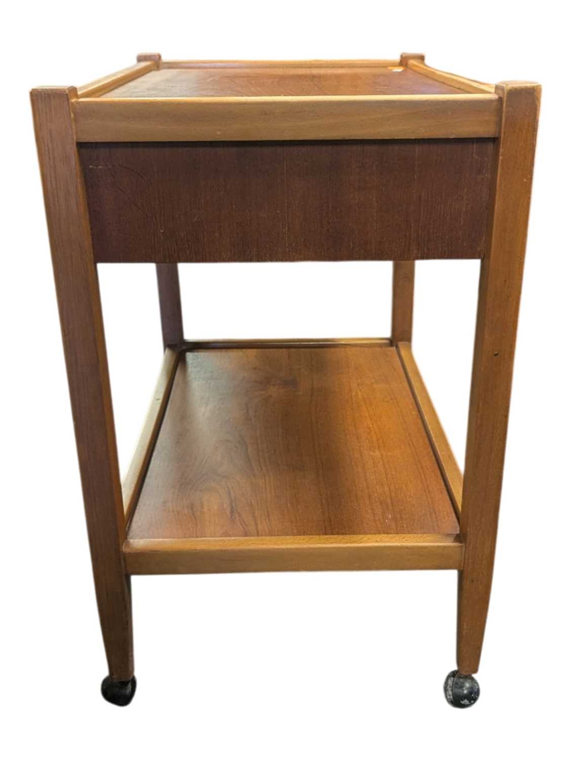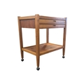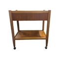 British Modern Design - A vintage mid 20th century teak serving drinks trolley. Rectangular form with twin bank of pull out plaforms on tapering legs united by an undertier. Measures approx: 70x64x44cm