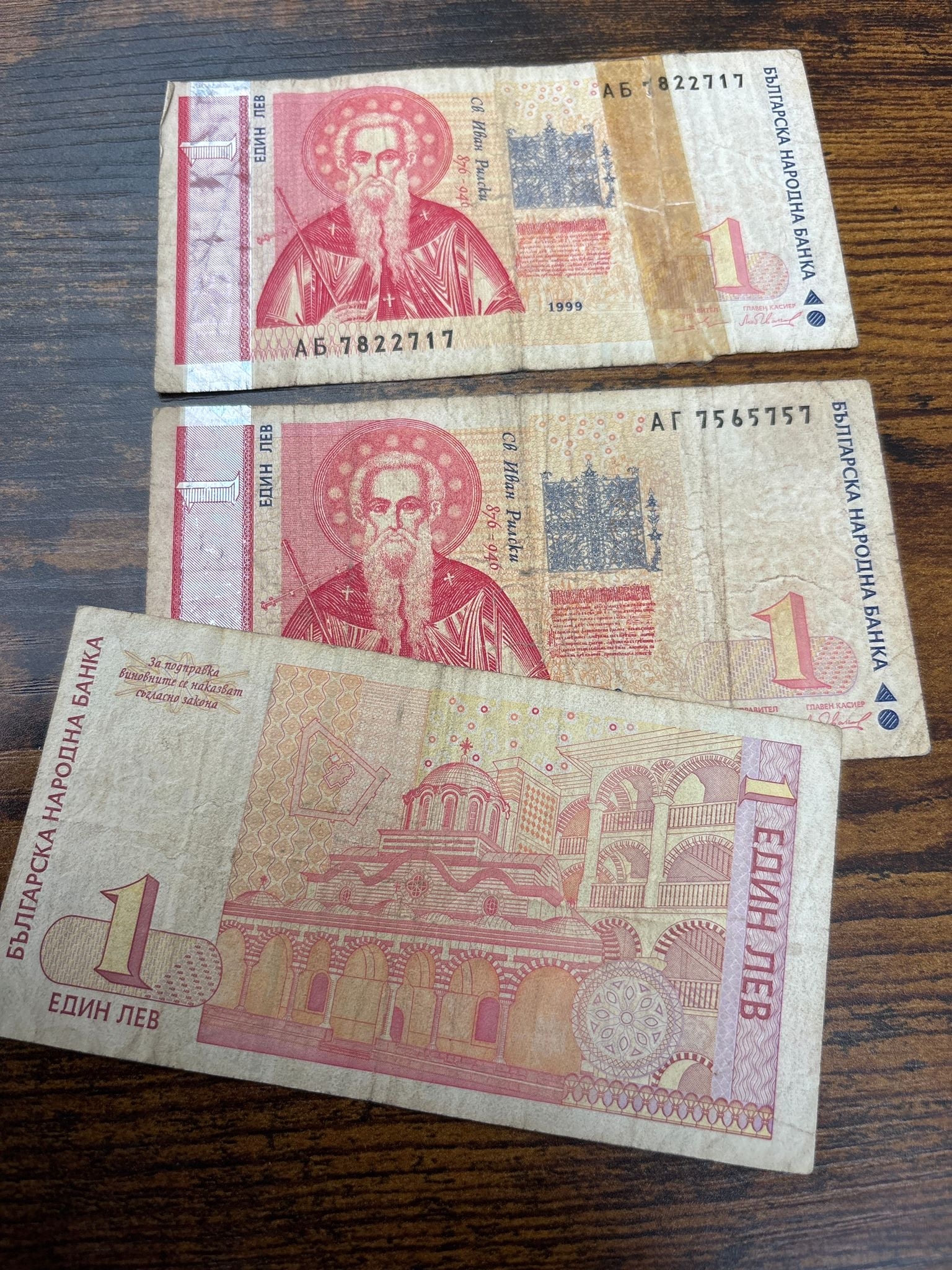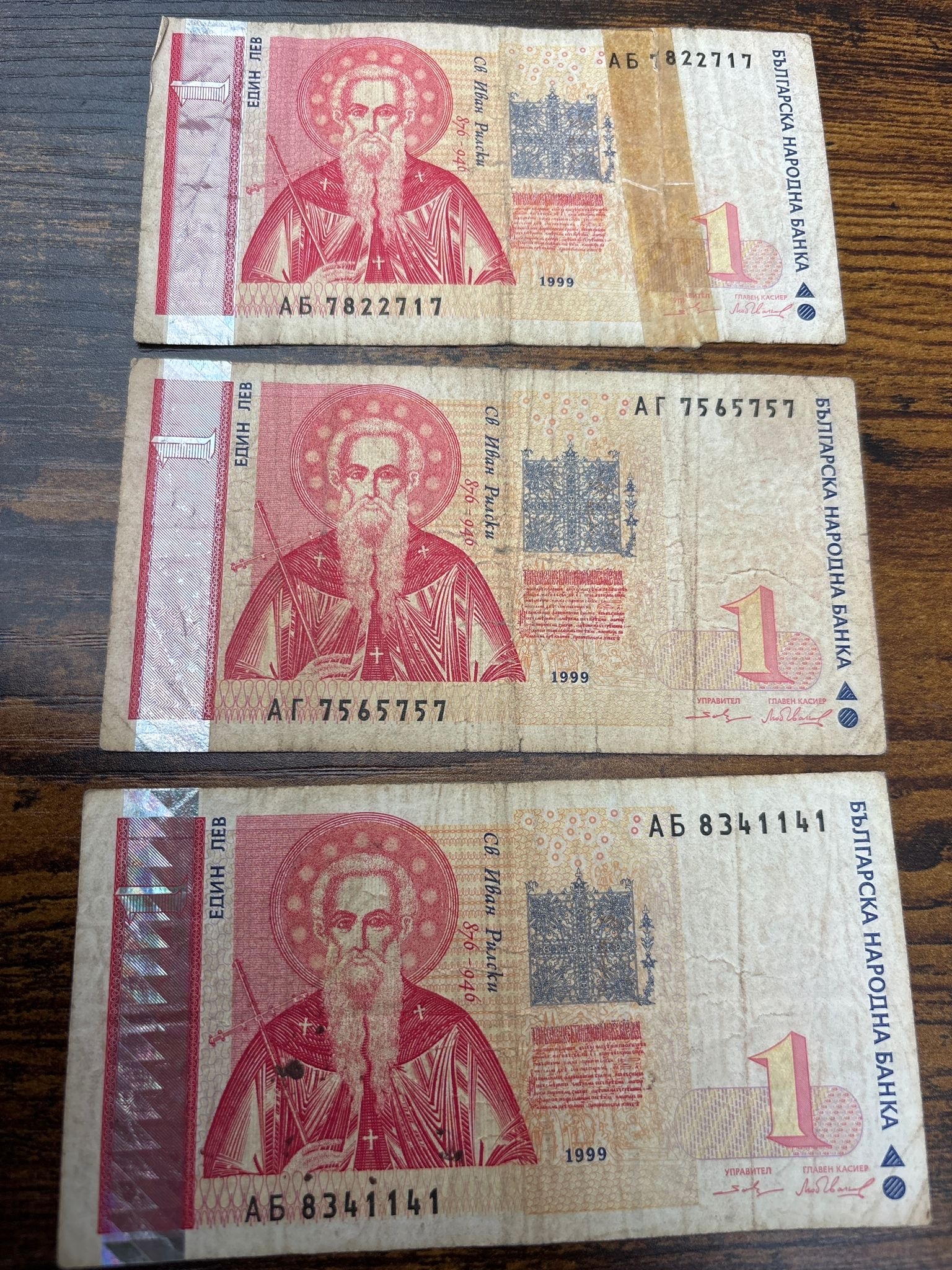 Bulgaria Banknotes – 3 x 1 Lev Notes (1999 Issue) Small group of three Bulgarian 1 Lev banknotes featuring St. Ivan Rilski, a key historical and religious figure. All notes show clear circulation wear including folds, staining and handling marks — typical of Eastern European notes of this period. Good honest starter or filler lot for world banknote collectors. Condition: well circulated (as seen)