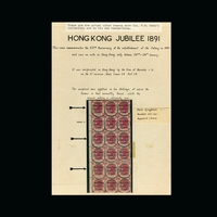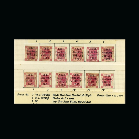 Hong Kong : (SG 51,51a-d,f) 1891 Jubilee 2c carmine reconstructed form of 12 including varieties short 'J', short 'U', broken '1', tall 'K', spaced 'Ho' and 'ng' mint, some without gum or only part original gum, a rare assembly. Provenance John Bull Auctions 6/5/2012 lot 3169 realised HK$25,300, approx £2,100 at the time Cat £9250 (image available)