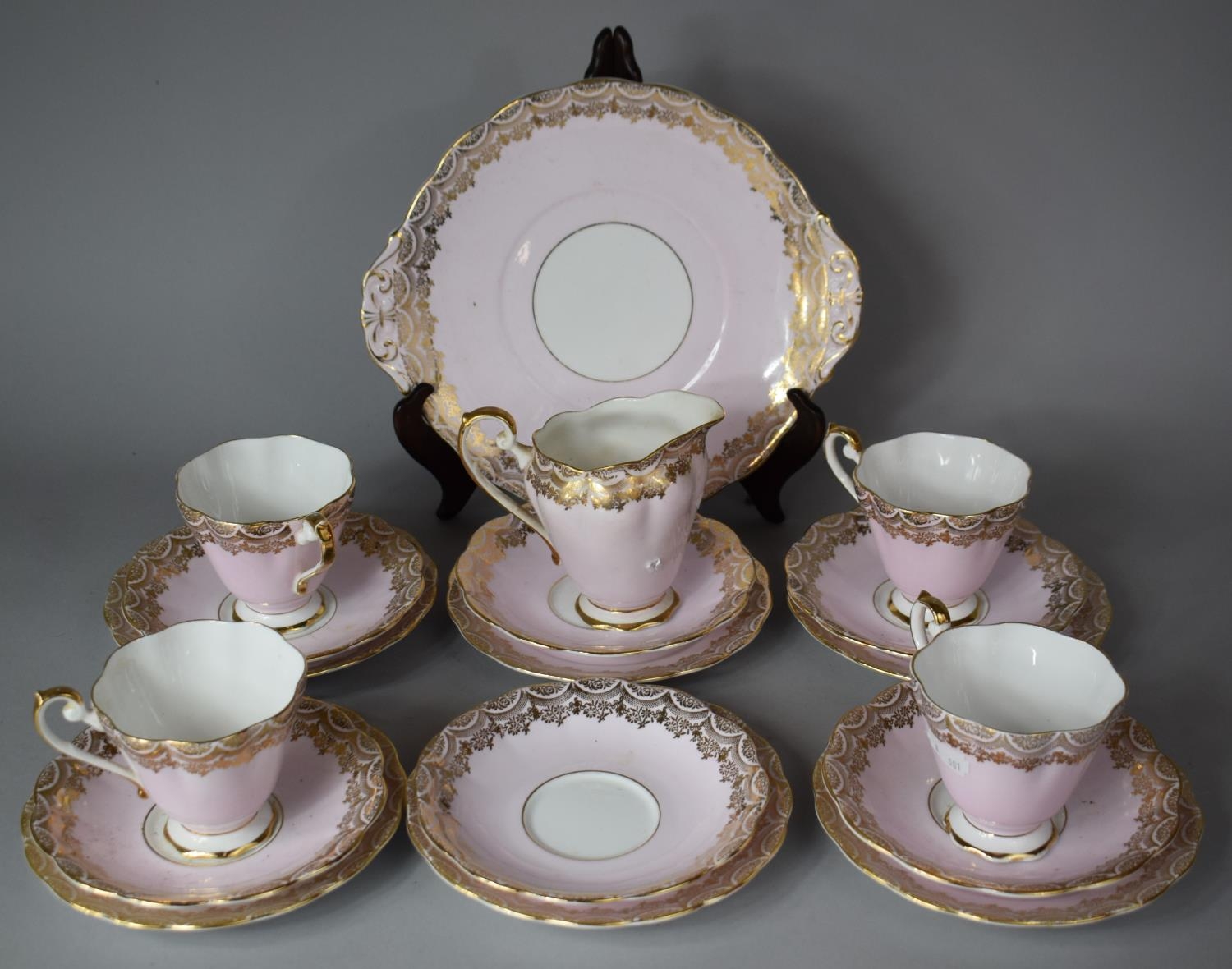 A Royal Standard Gilt and Pink Decorated Teaset to Comprise Four Cups, Cakeplate, Six Sideplates, Six Saucers Together with a Milk Jug