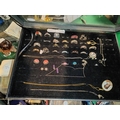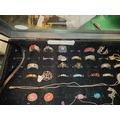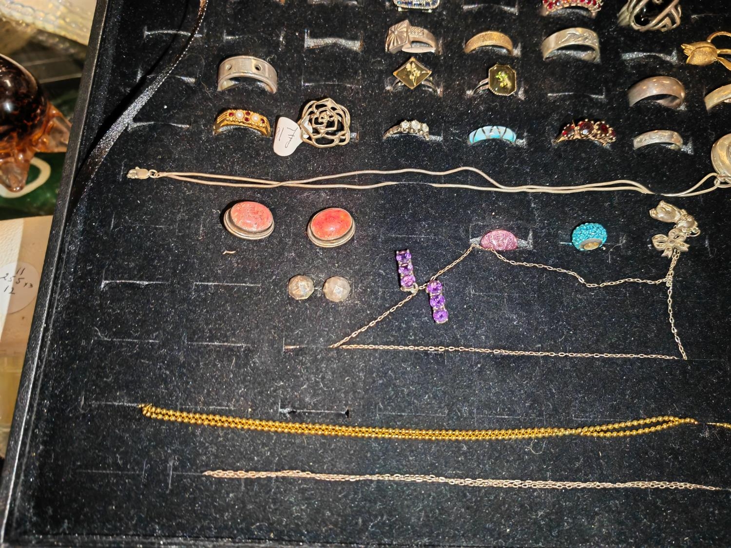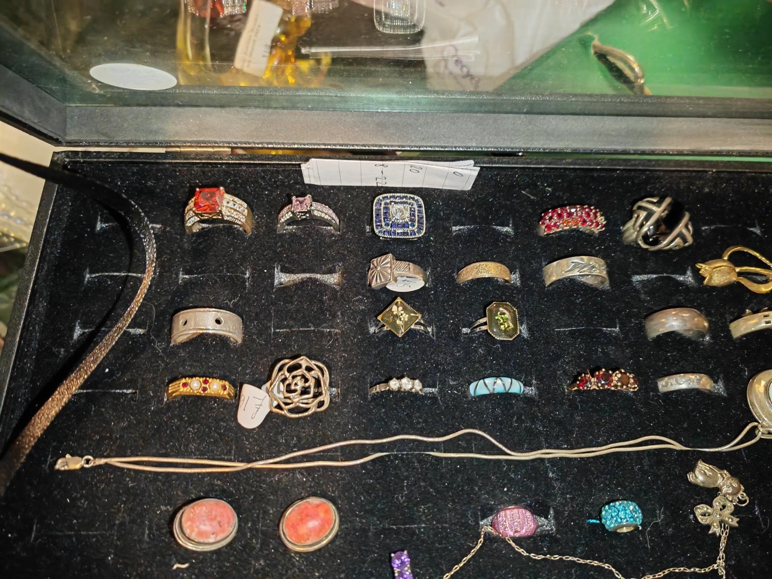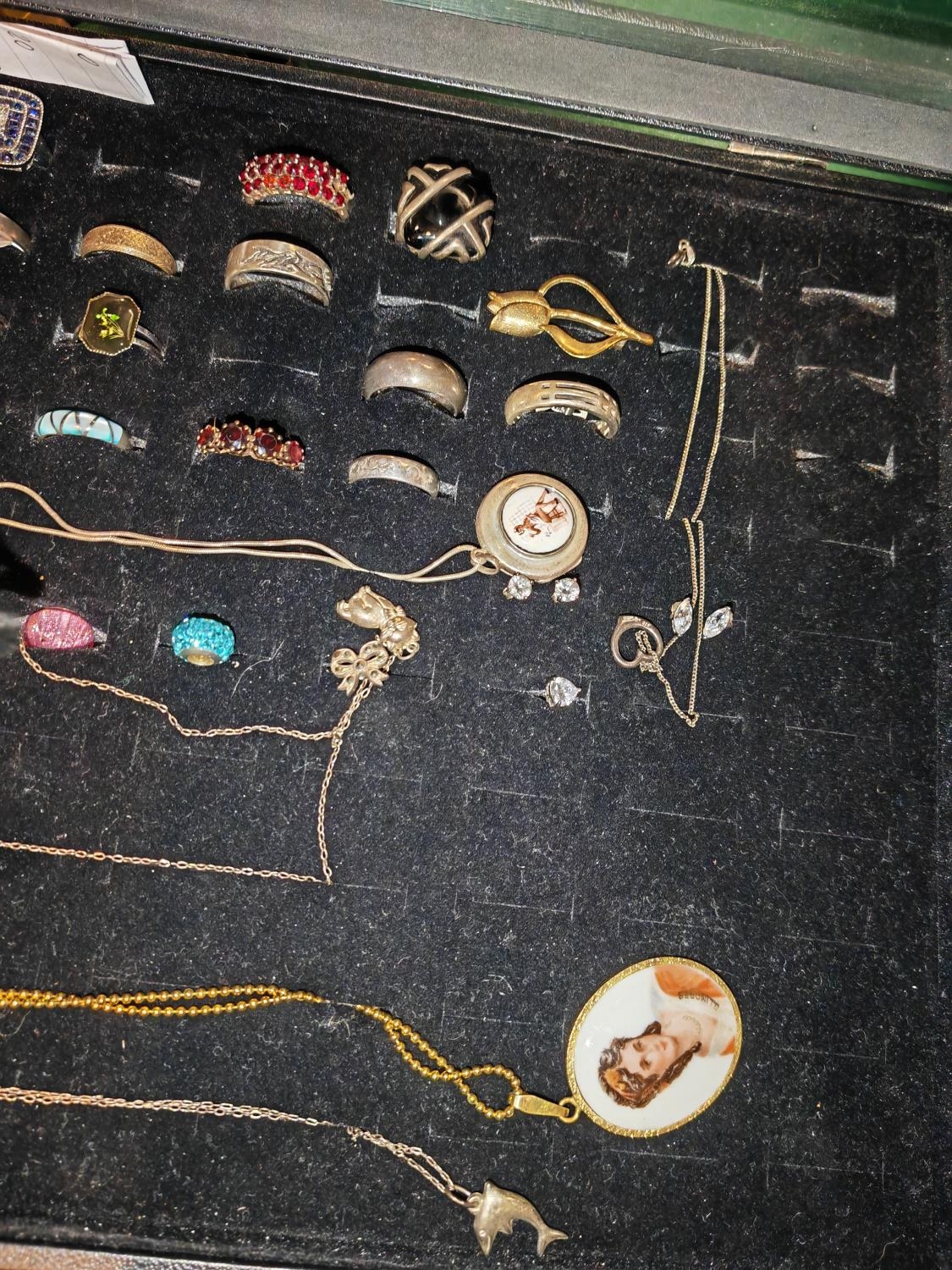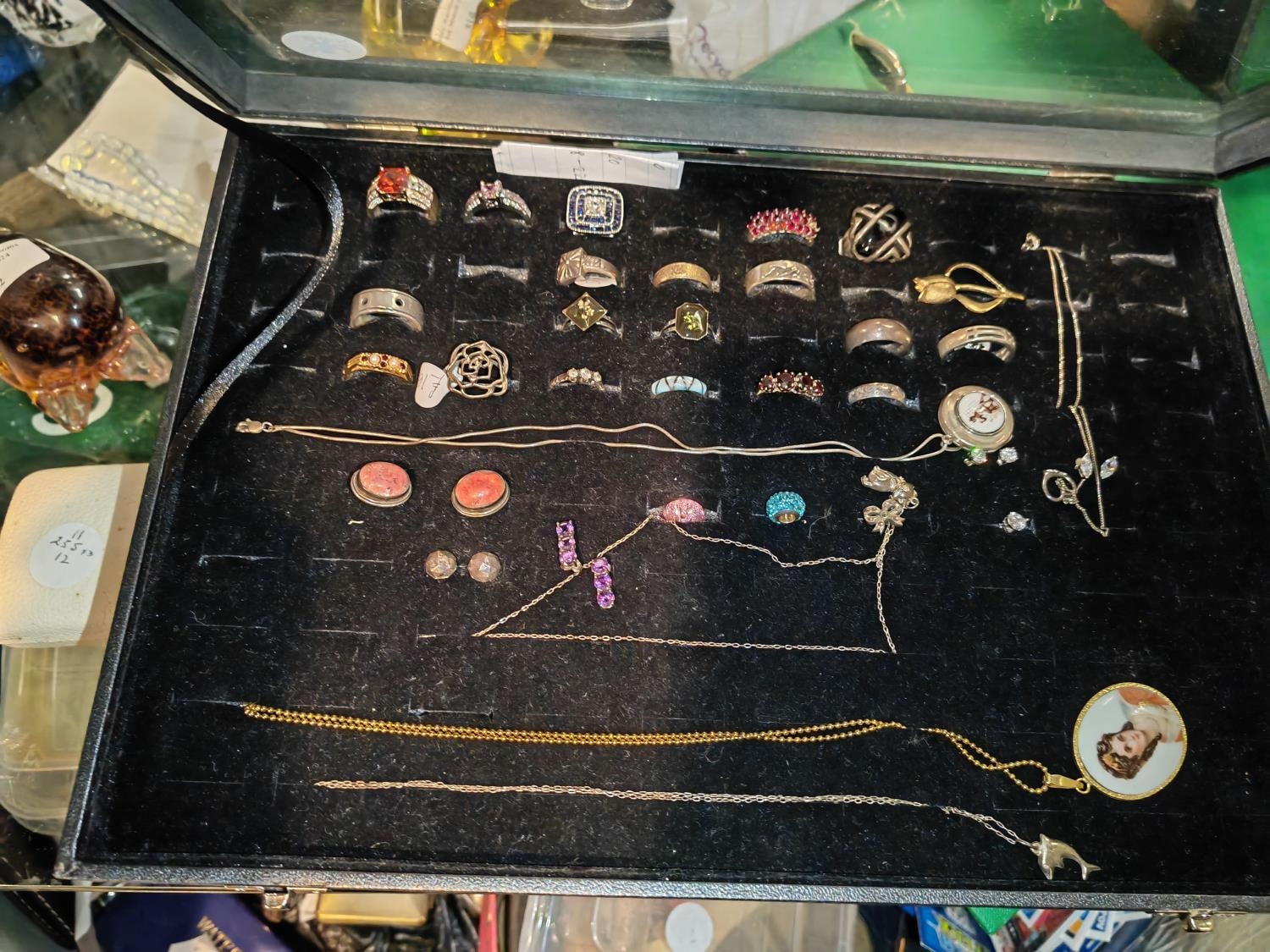 Display Box Of 19 Rings Some Silver + 5 Drop Pendant & Chains + 5 Sets Earrings + 2 Pandora Style Beads