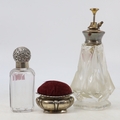 A silver topped glass bottle, unmarked white metal and enamelled atomiser, and a silver hallmarked pin cushion