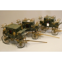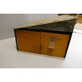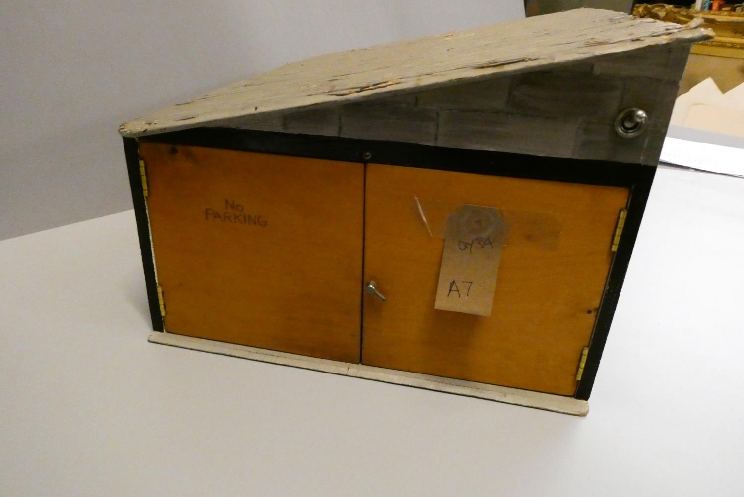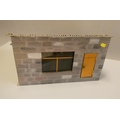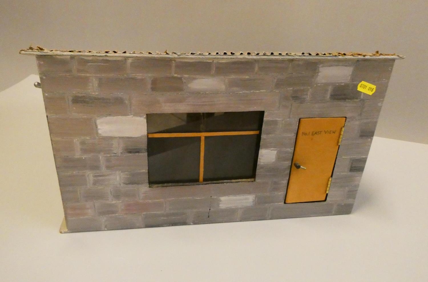 A scratch built toy car garage with double opening doors and window, painted brick finish with corrugated card roof, good