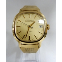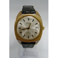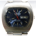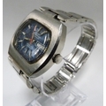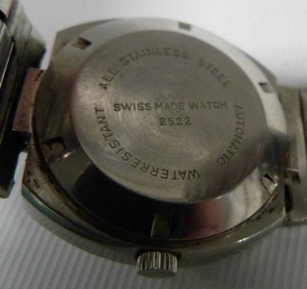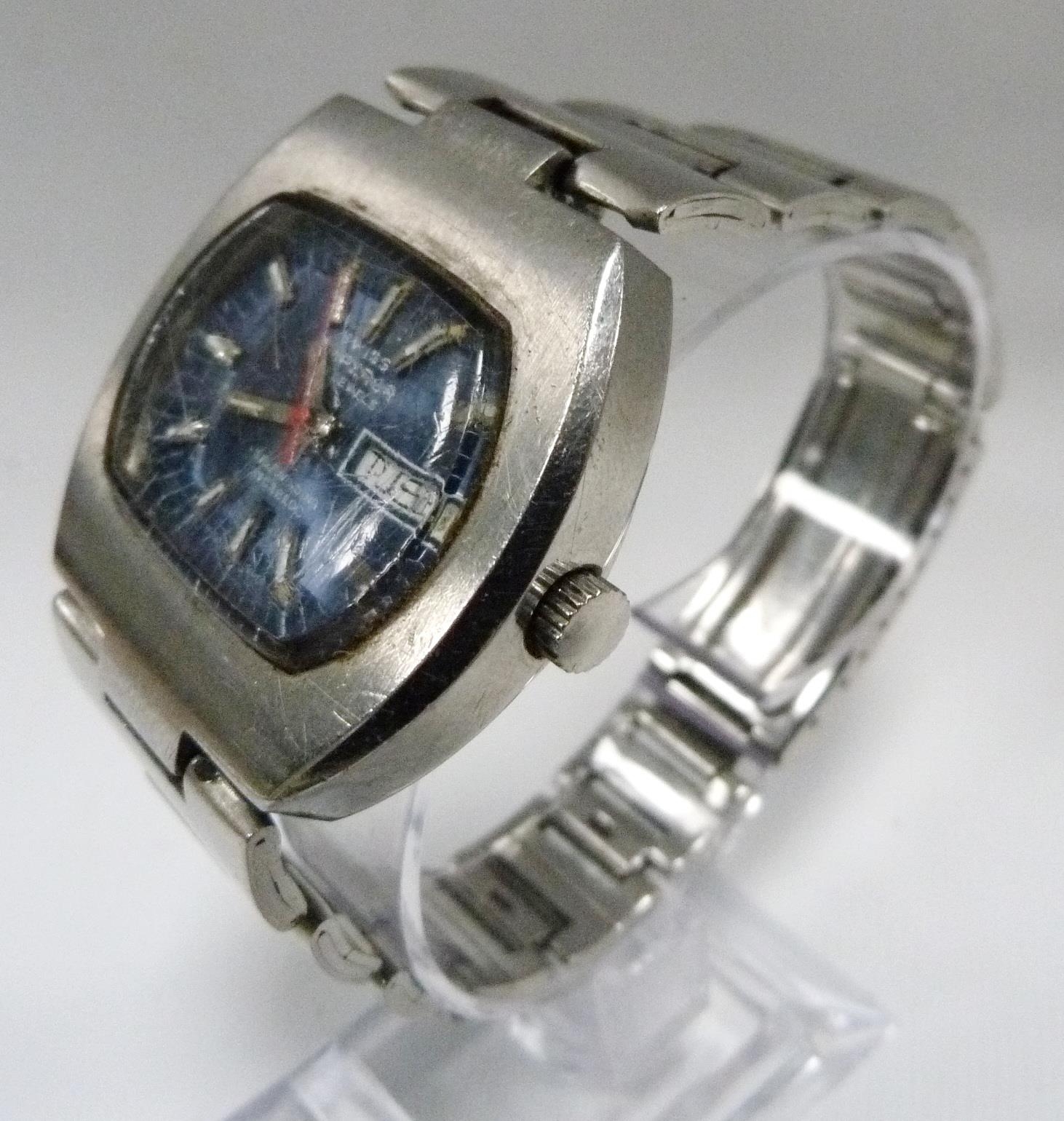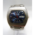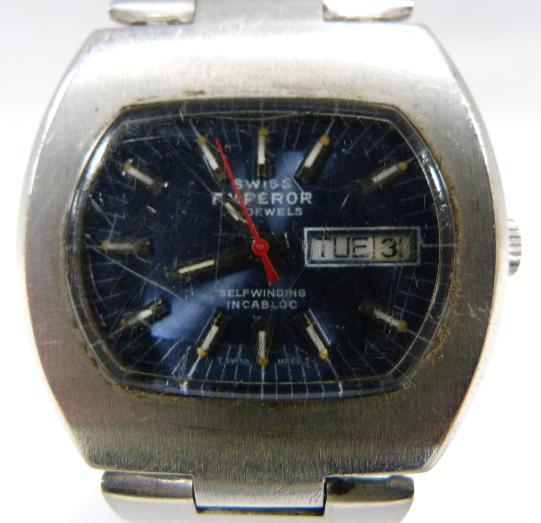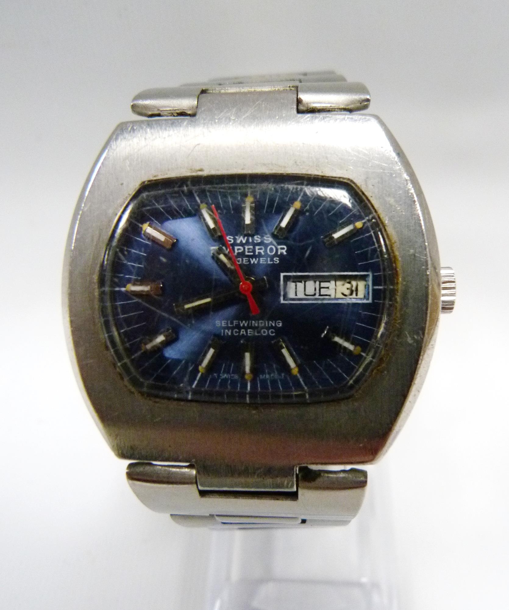 Swiss Emperor: 25 jewels self winding incabloc gents wristwatch circa 1970s, shaped stainless case with signed blue dial with silvered luminous baton indices and day and date window at 3 o'clock position, ref no 2522, case diameter approximately 37mm, on stainless bracelet strap.
